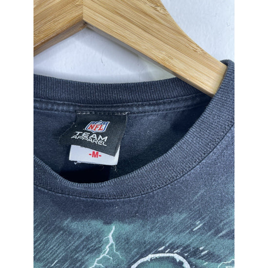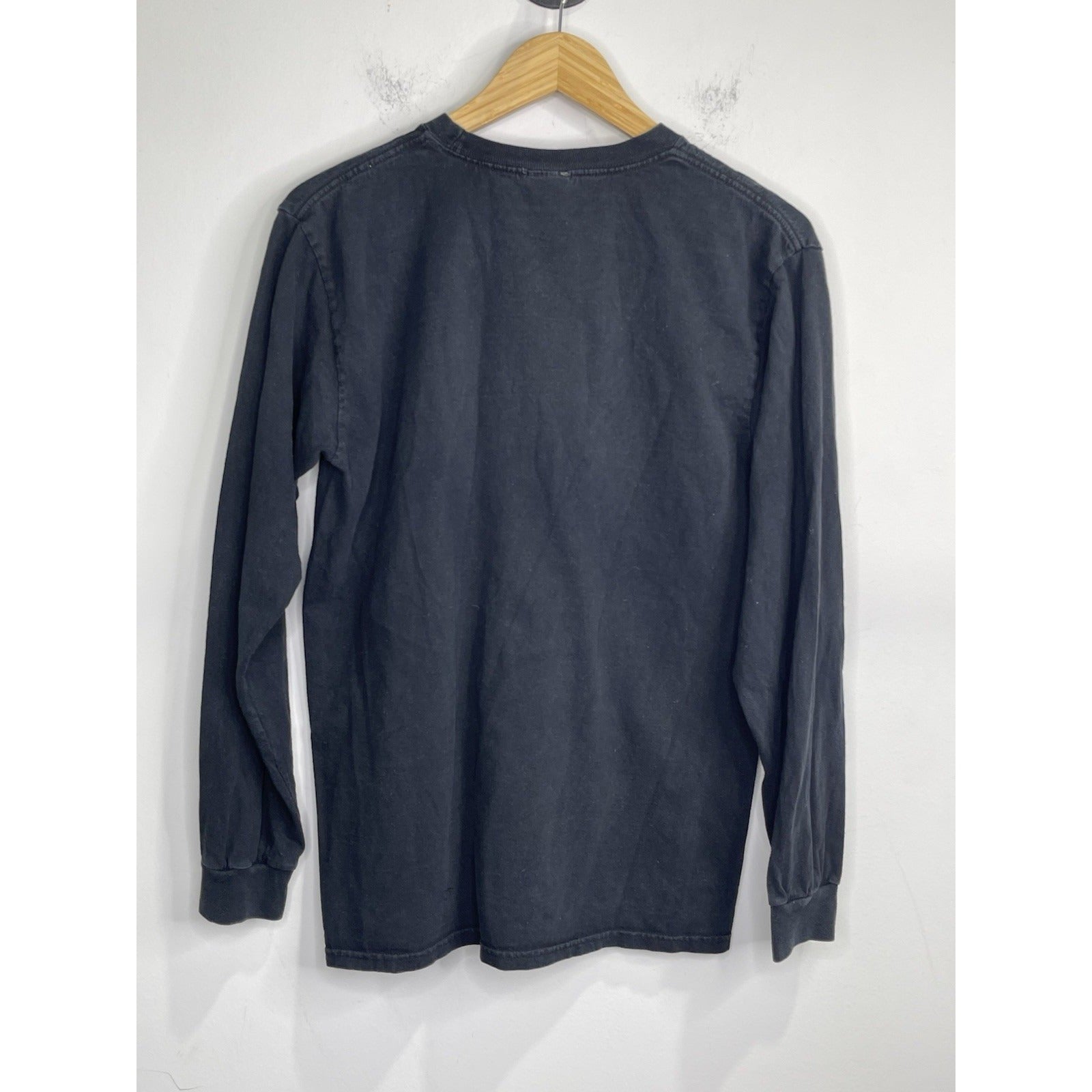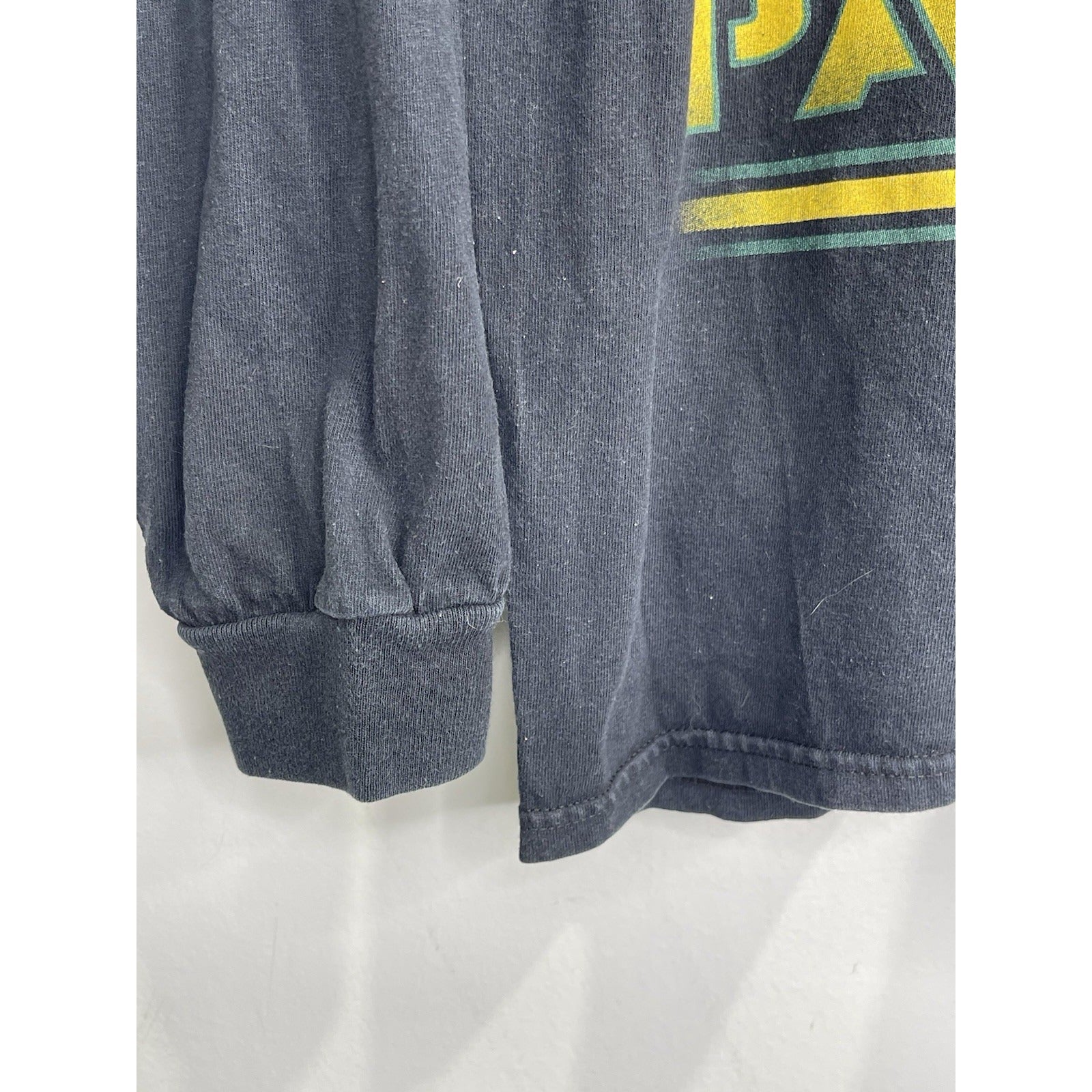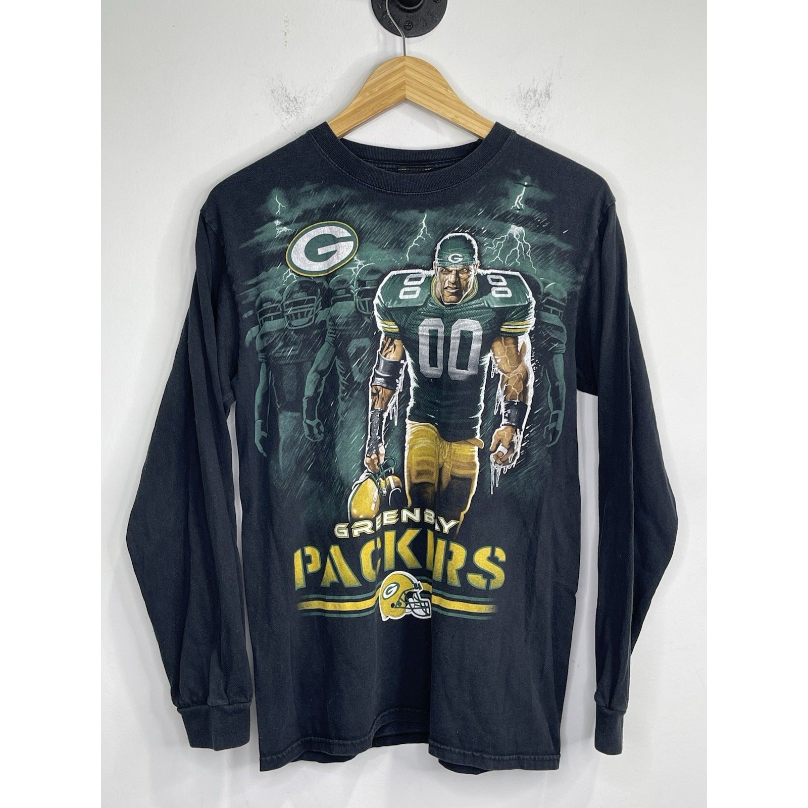 The product is a men's vintage black long sleeve t-shirt featuring a graphic print of the Green Bay Packers NFL team logo. Made from cotton, this regular fit shirt has a crew neckline and is in size medium. With a theme of USA and sports, it is perfect for fans of the Packers looking to show their team pride in a classic and comfortable style.