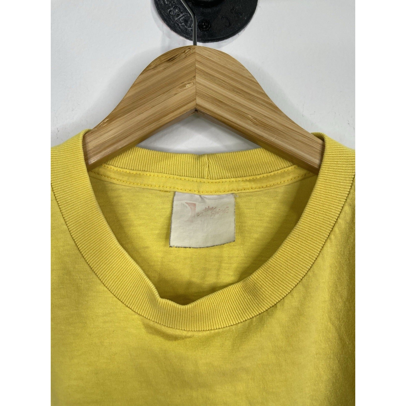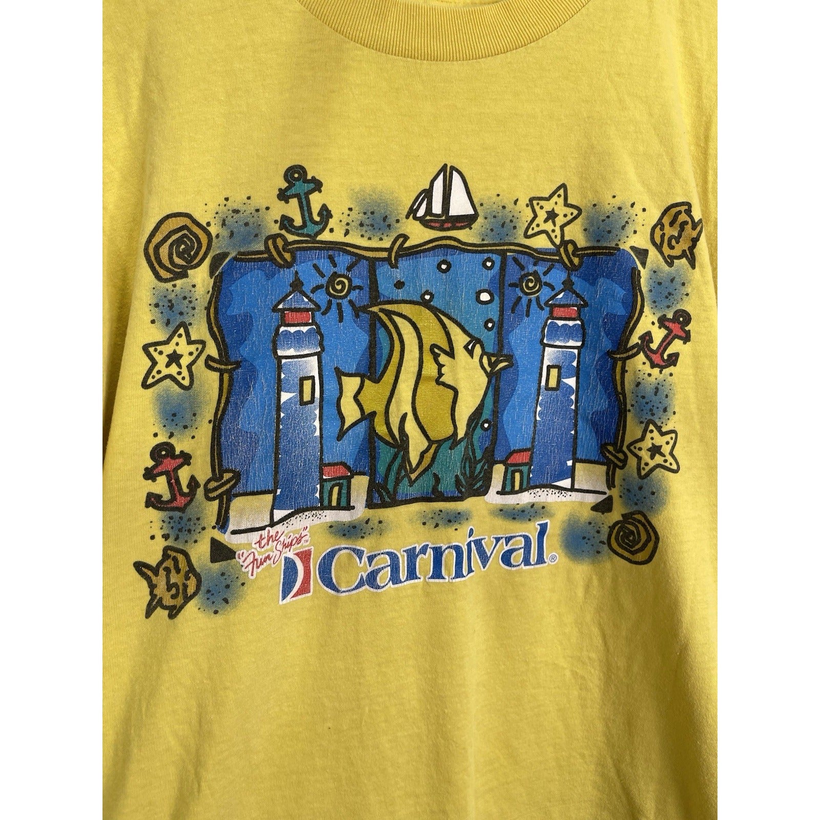 This Men’s Vintage Carnival Cruise Yellow Ship Sailing T-Shirt in size L features a classic design that brings to mind 90s nostalgia and a sense of adventure. The solid yellow color, short sleeves, and crew neck make it a comfortable and stylish choice for anyone looking to showcase their love for Carnival Cruise Line and sailing in general. Perfect for casual wear, this shirt is a great addition to any man's wardrobe, especially for those who appreciate vintage style and iconic logos.