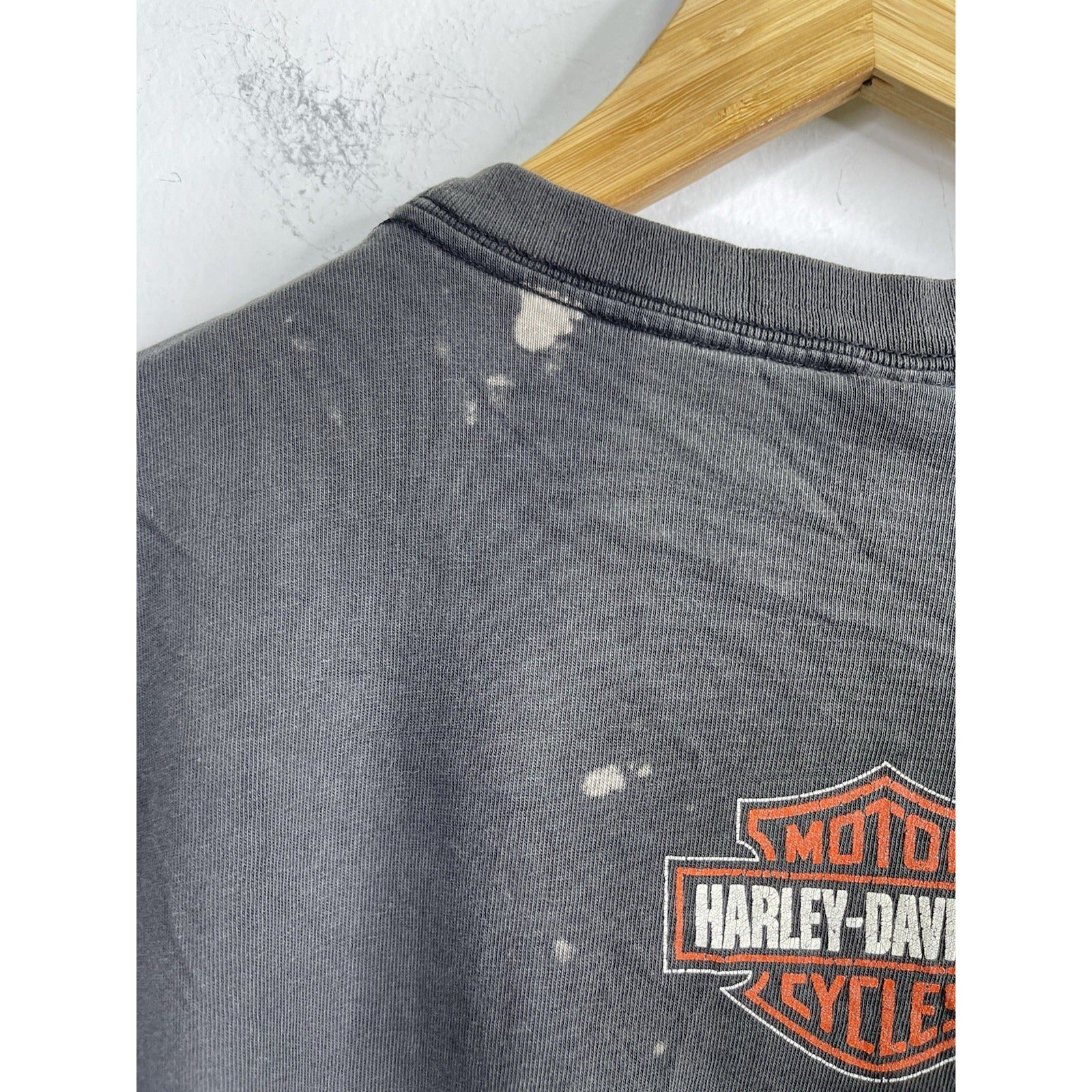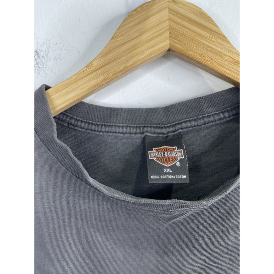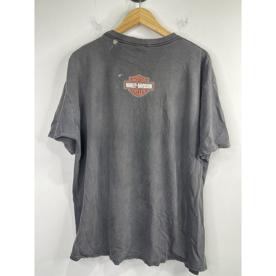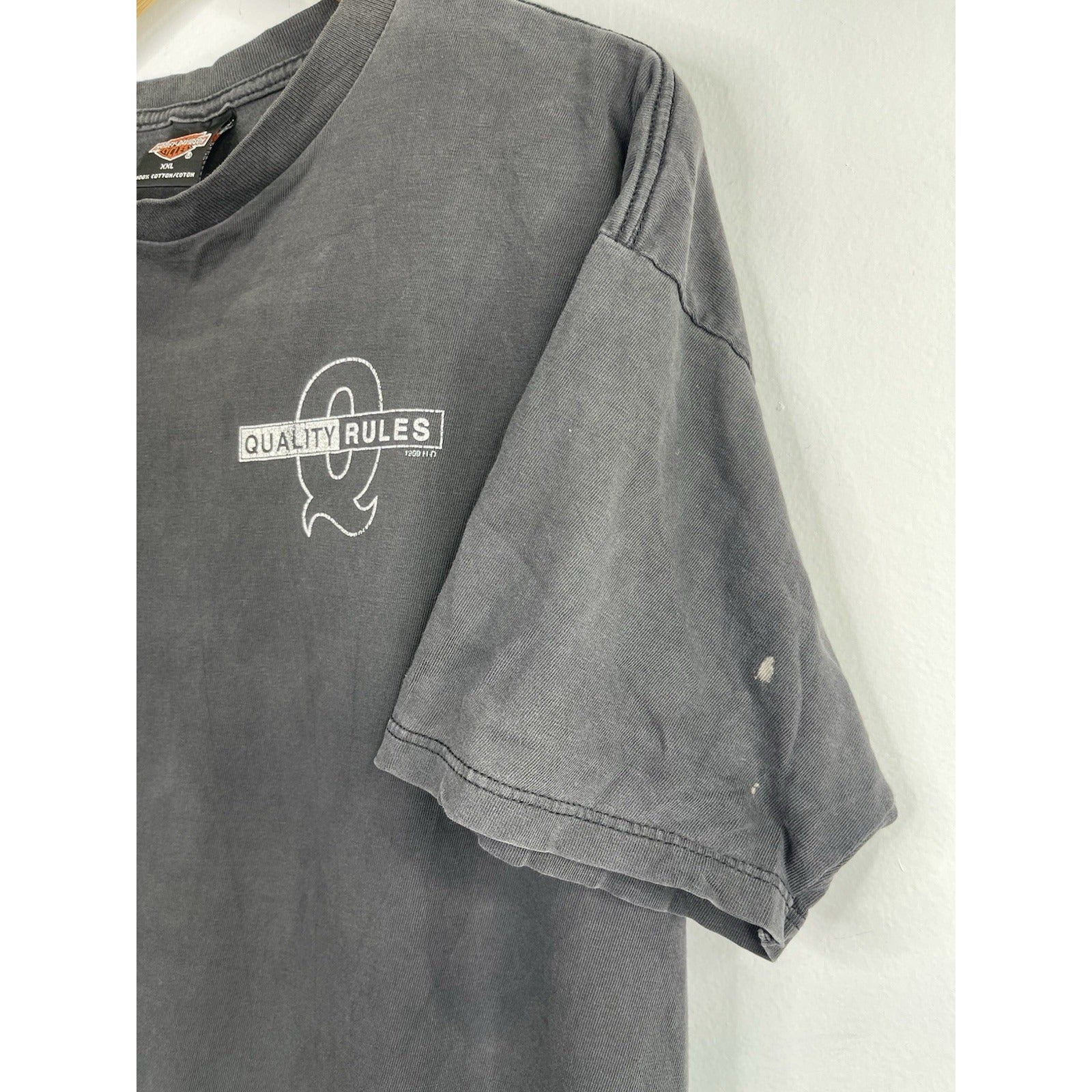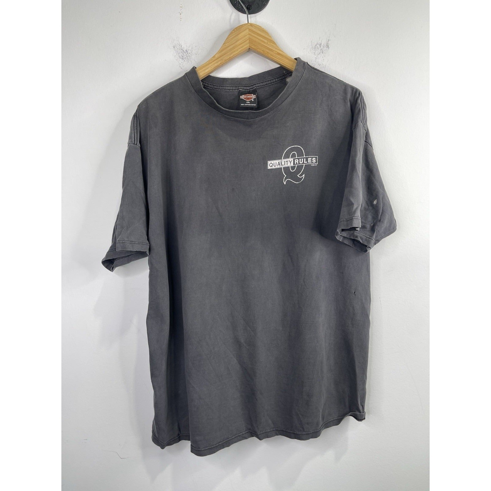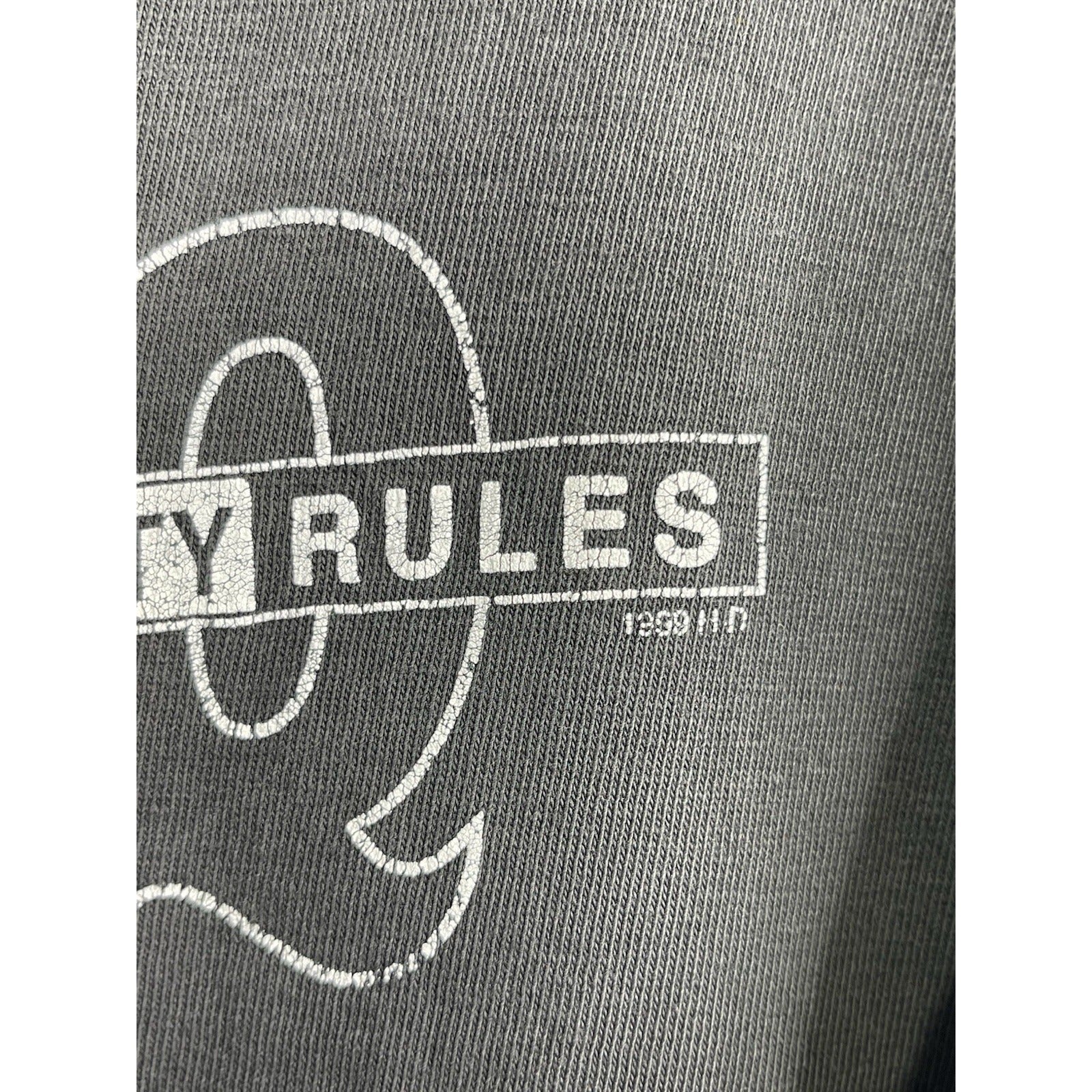 This Men's Vintage Faded Black Harley Davidson 1999 HD Quality Rules T-Shirt in size 2XL is a classic piece featuring a graphic print of the iconic Harley-Davidson brand. Made of a comfortable blend of cotton and acrylic, this short-sleeve shirt has a crew neck and a regular fit, making it suitable for all seasons. The vintage design adds a unique touch, perfect for fans of motorcycles and 90s style. Whether you're in the mood to show off your biker attitude or just looking for a stylish addition to your wardrobe, this double-sided tee is sure to make a statement.