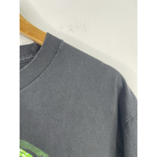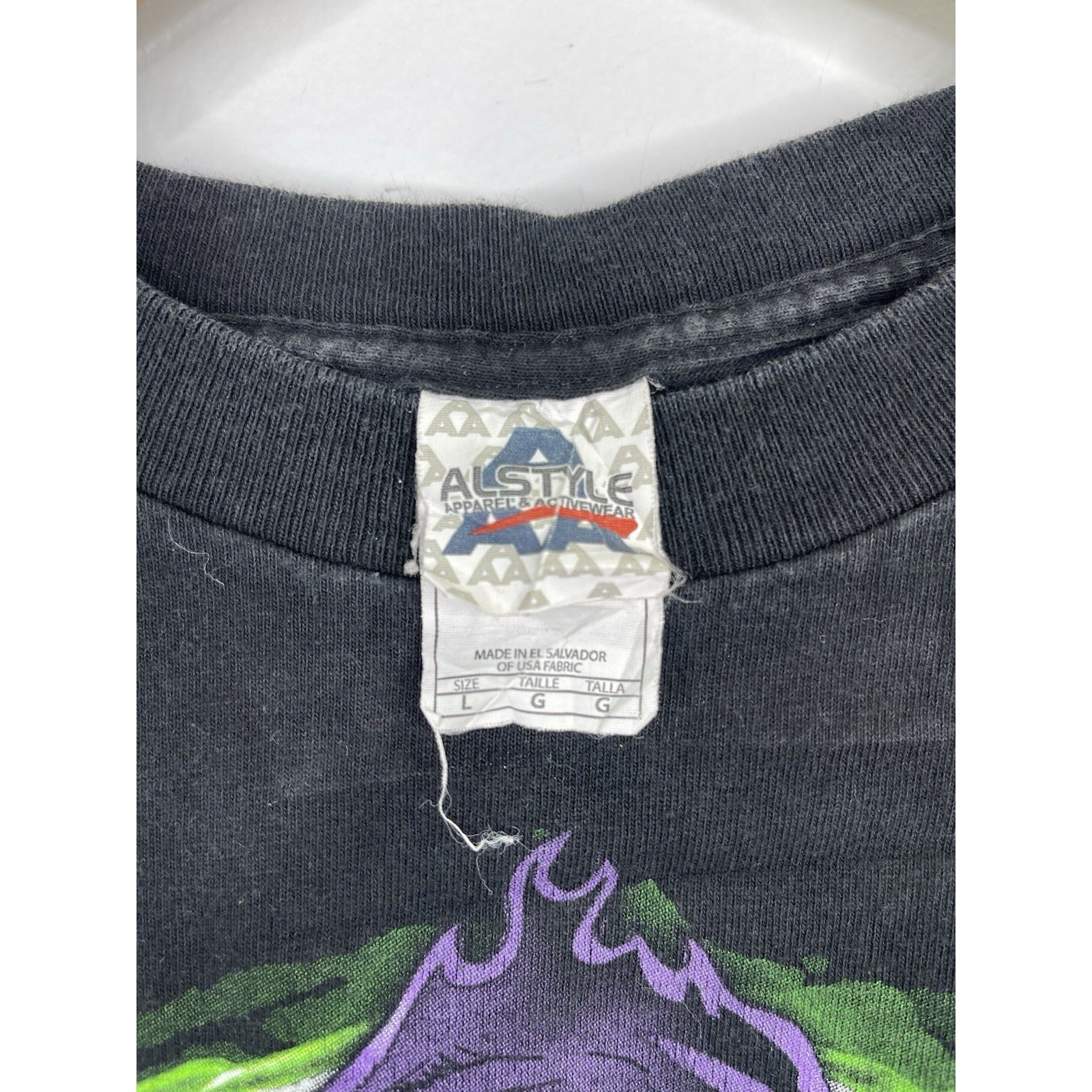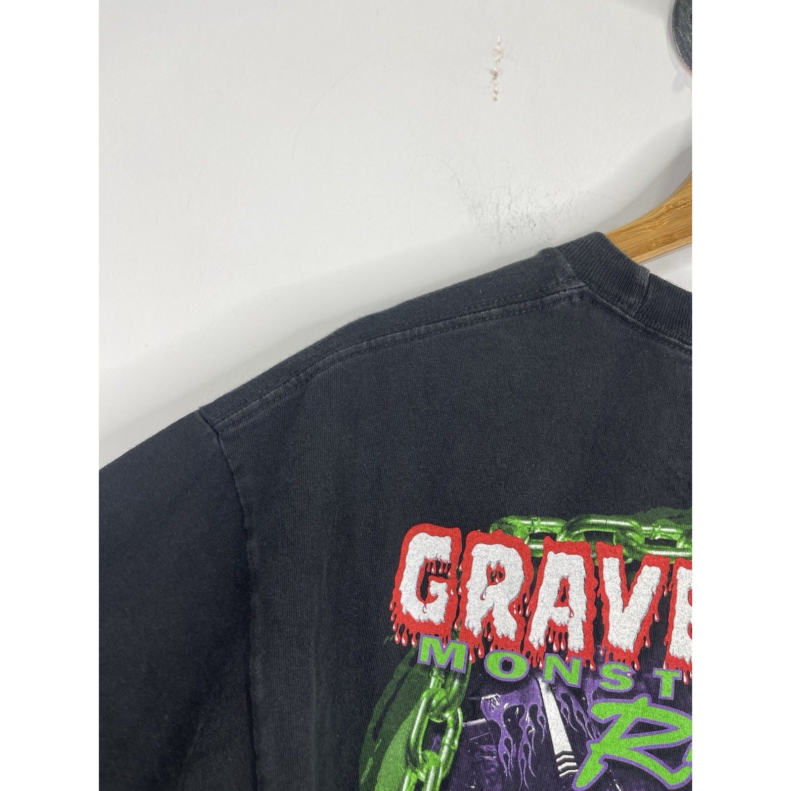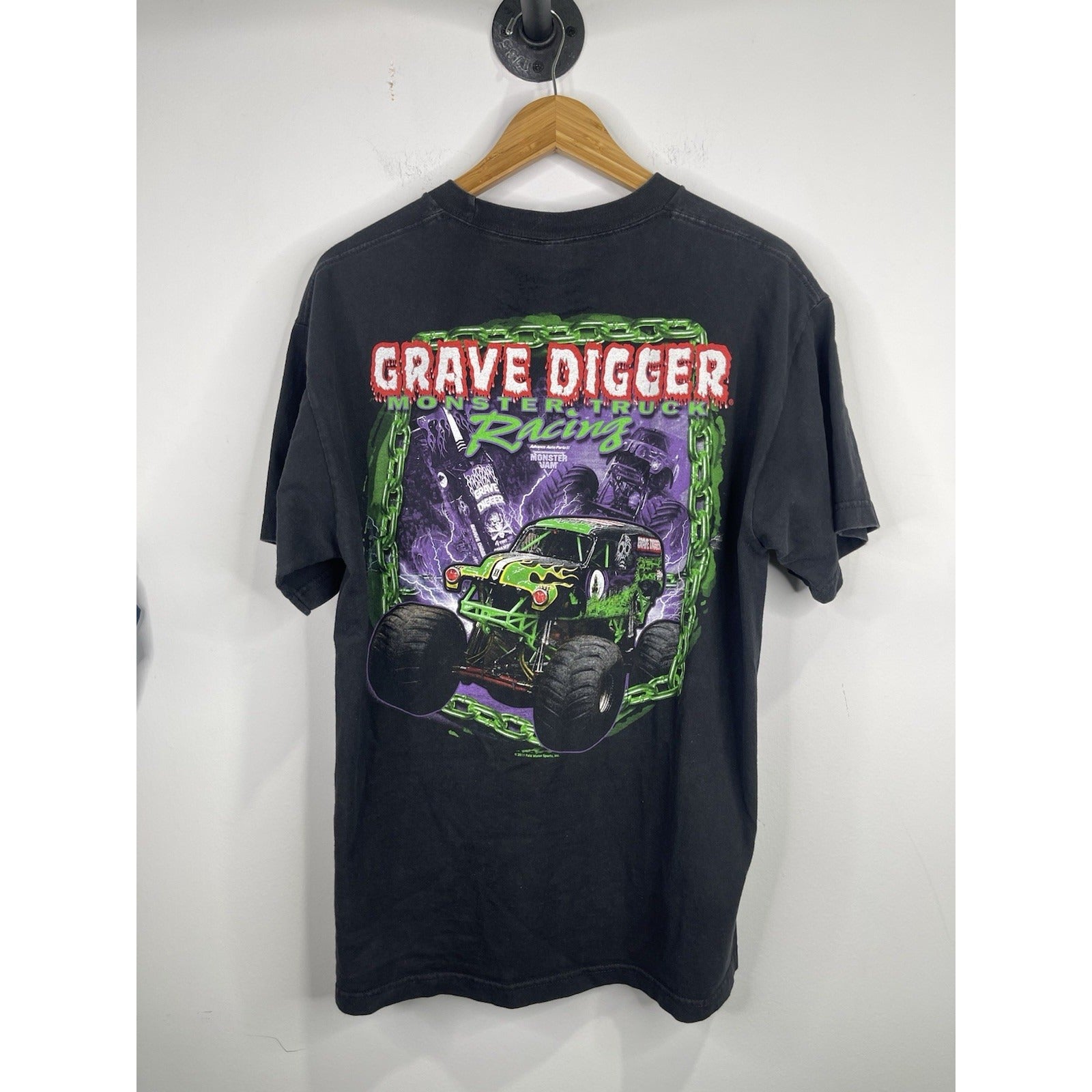The Men’s Vintage Grave Digger Racing Team Monster Truck Shirt in size Large is a graphic print t-shirt featuring a 80s monster truck theme. Made of cotton, this short sleeve shirt has a crew neck and is perfect for fans of vintage racing and monster trucks. The black color and vintage design make it a unique addition to any man's wardrobe, showcasing a bit of nostalgia and style.
