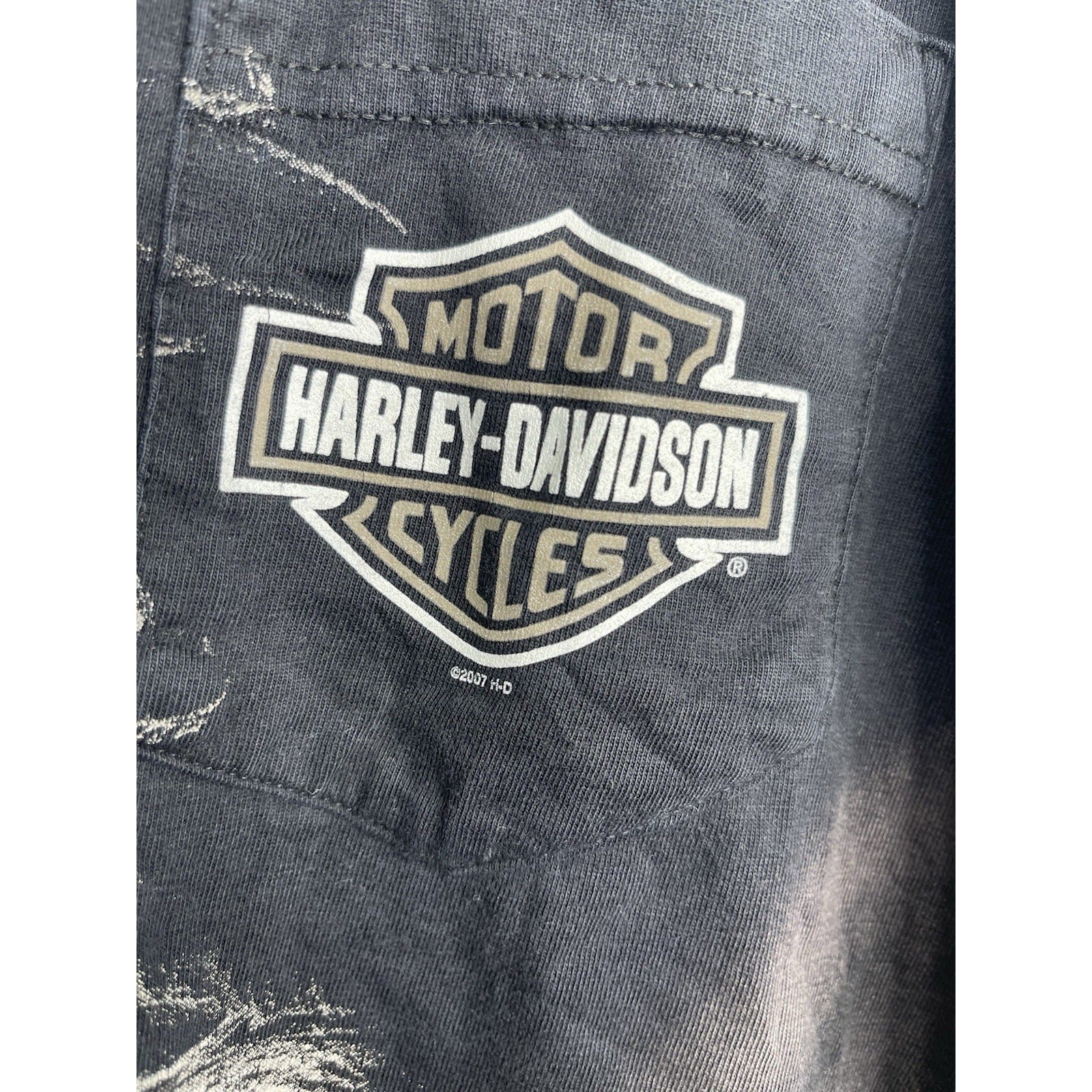 This Men's Vintage Harley Davidson 2007 Eagle Graphic Double-Sided T-Shirt in size 2XL is a classic piece of black cotton fabric with a crew neck and short sleeves. The shirt features a bold graphic print of the Harley-Davidson brand and an eagle design on both sides, making it a perfect choice for motorcycle enthusiasts and bikers. The regular fit and high-quality material ensure comfort and durability, making it a versatile and stylish addition to any man's wardrobe.