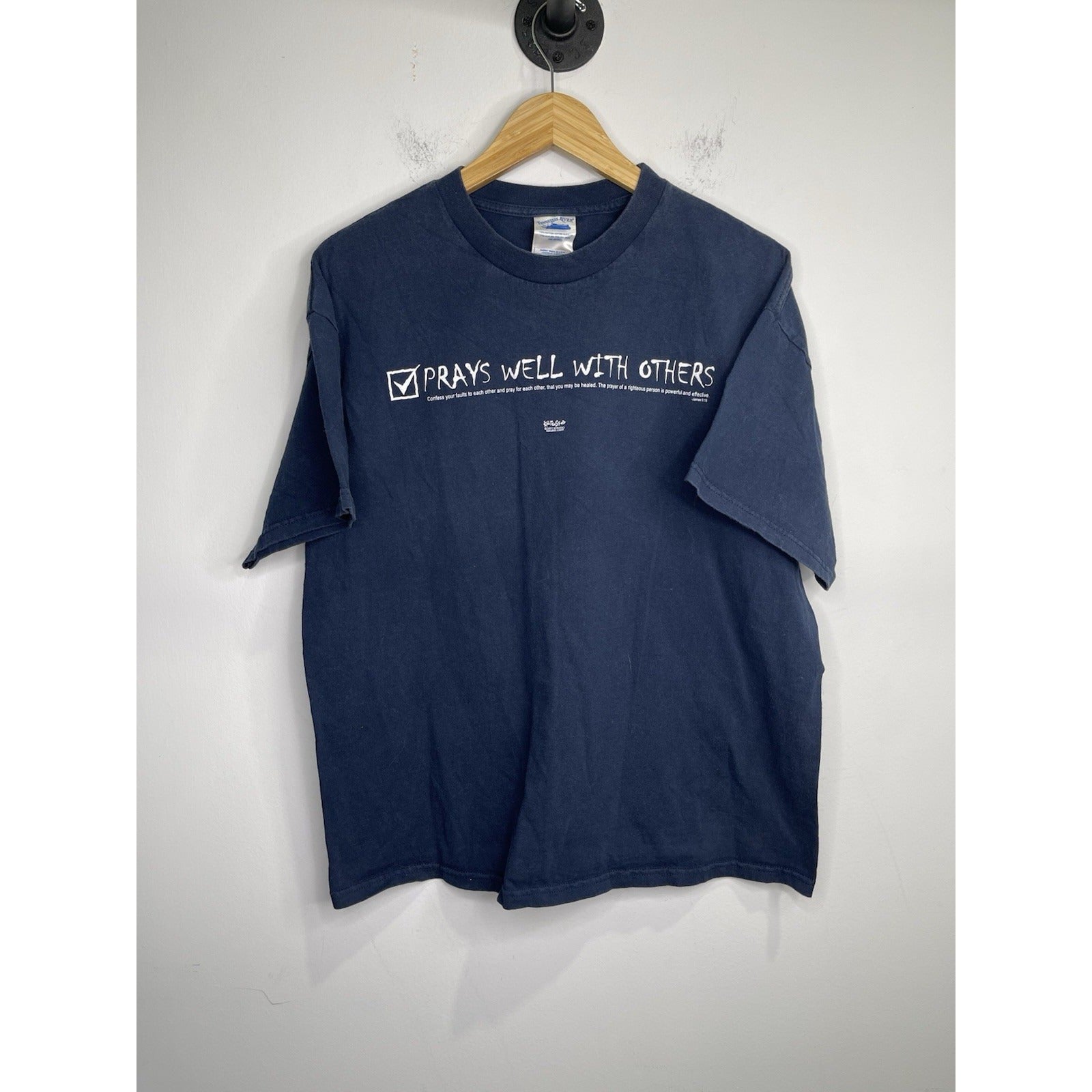 This product is a Men's Vintage Kerusso Jesus 'Prays Well With Others' t-shirt from 2001 in size XL. The shirt features a graphic print design with a blue color and short sleeves, made of cotton material. It has a crew neck and a regular fit. The brand Kerusso is known for its religious-themed clothing, and this t-shirt is a unique addition to any collection for those interested in art and faith.