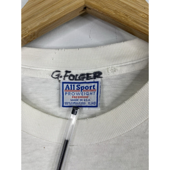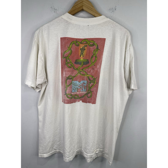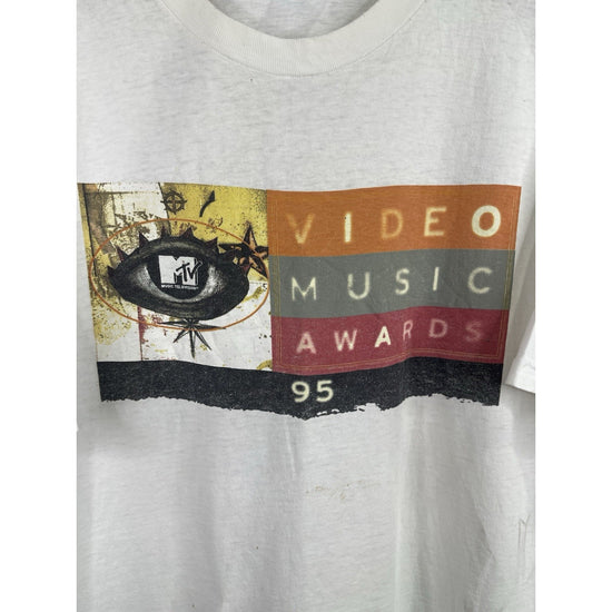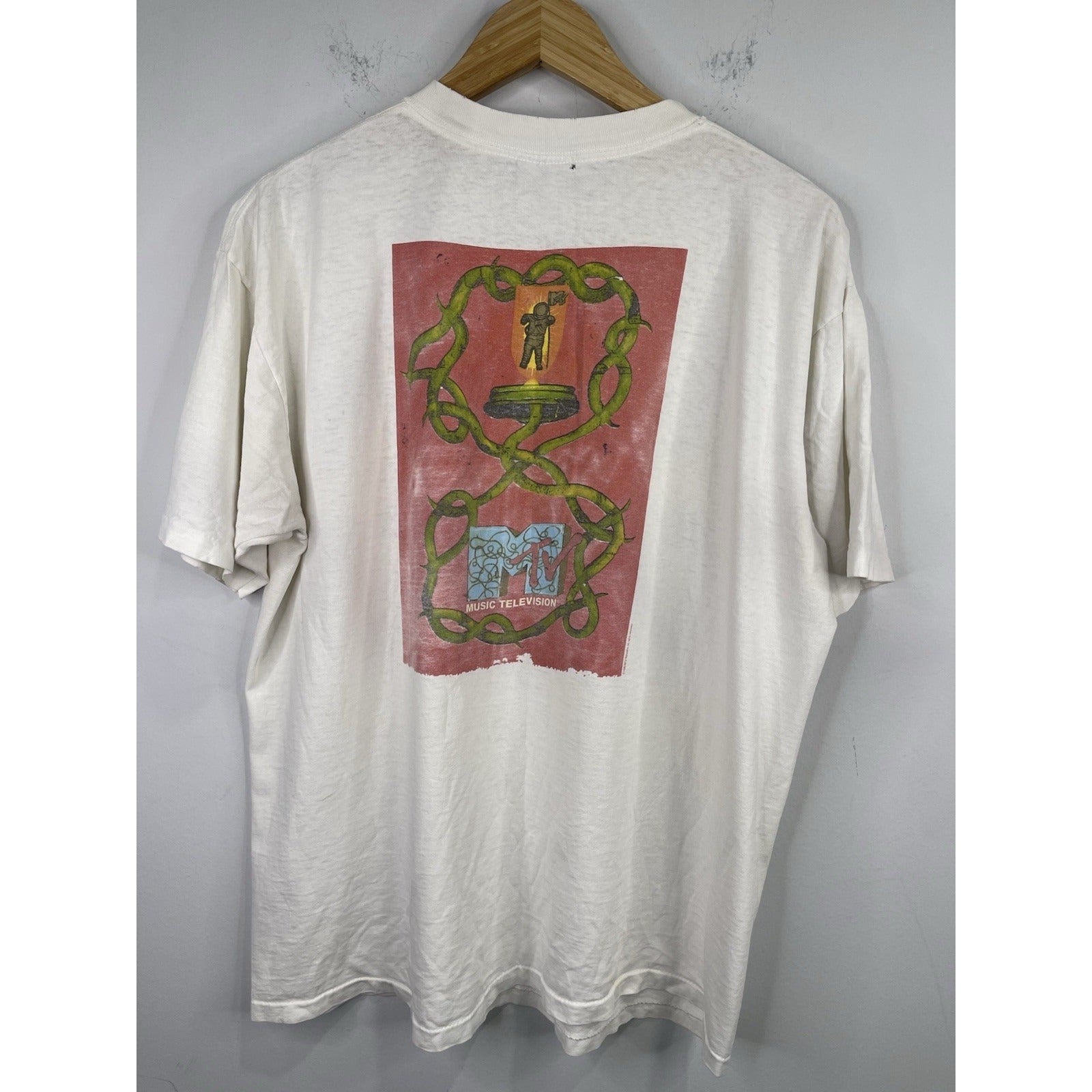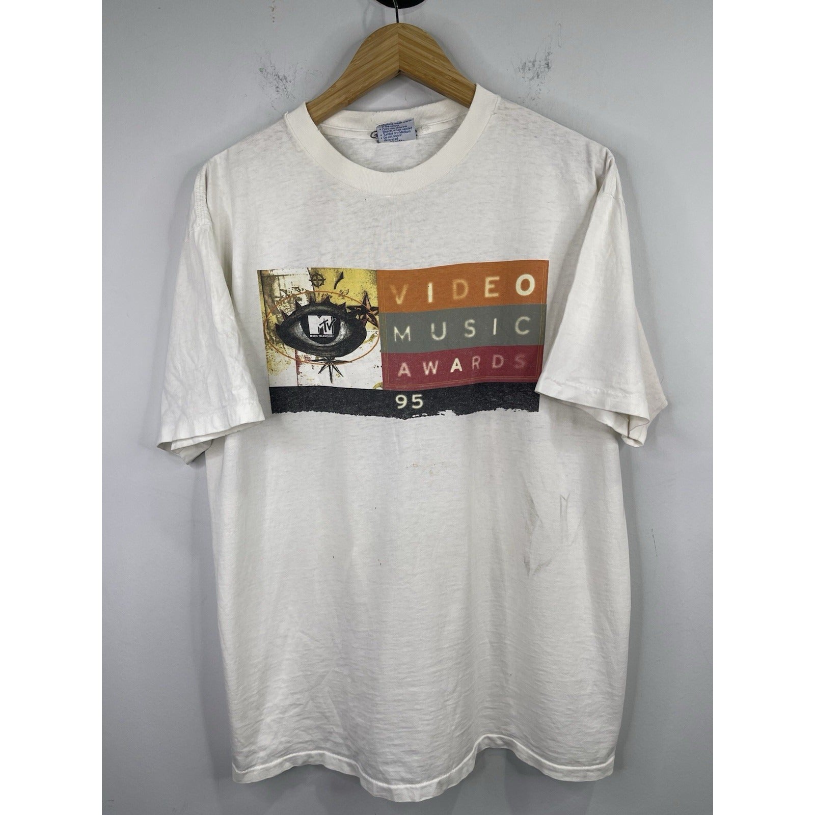 This Men’s Vintage MTV VMAs 1995 T-Shirt is a single-stitch tee featuring a graphic print with a music video awards theme. The t-shirt is made of lightweight cotton material in a classic white color with a crew neckline and short sleeves. With a regular fit and XL size, this unisex shirt is a nostalgic piece perfect for music lovers and collectors of vintage clothing. The double-sided print adds a unique touch to this retro shirt from the All Sport brand.