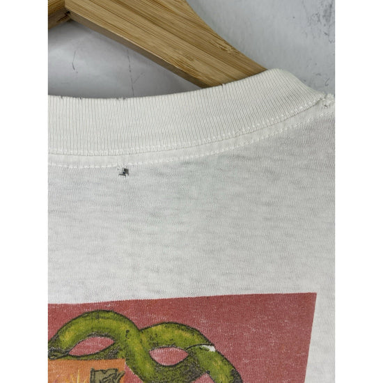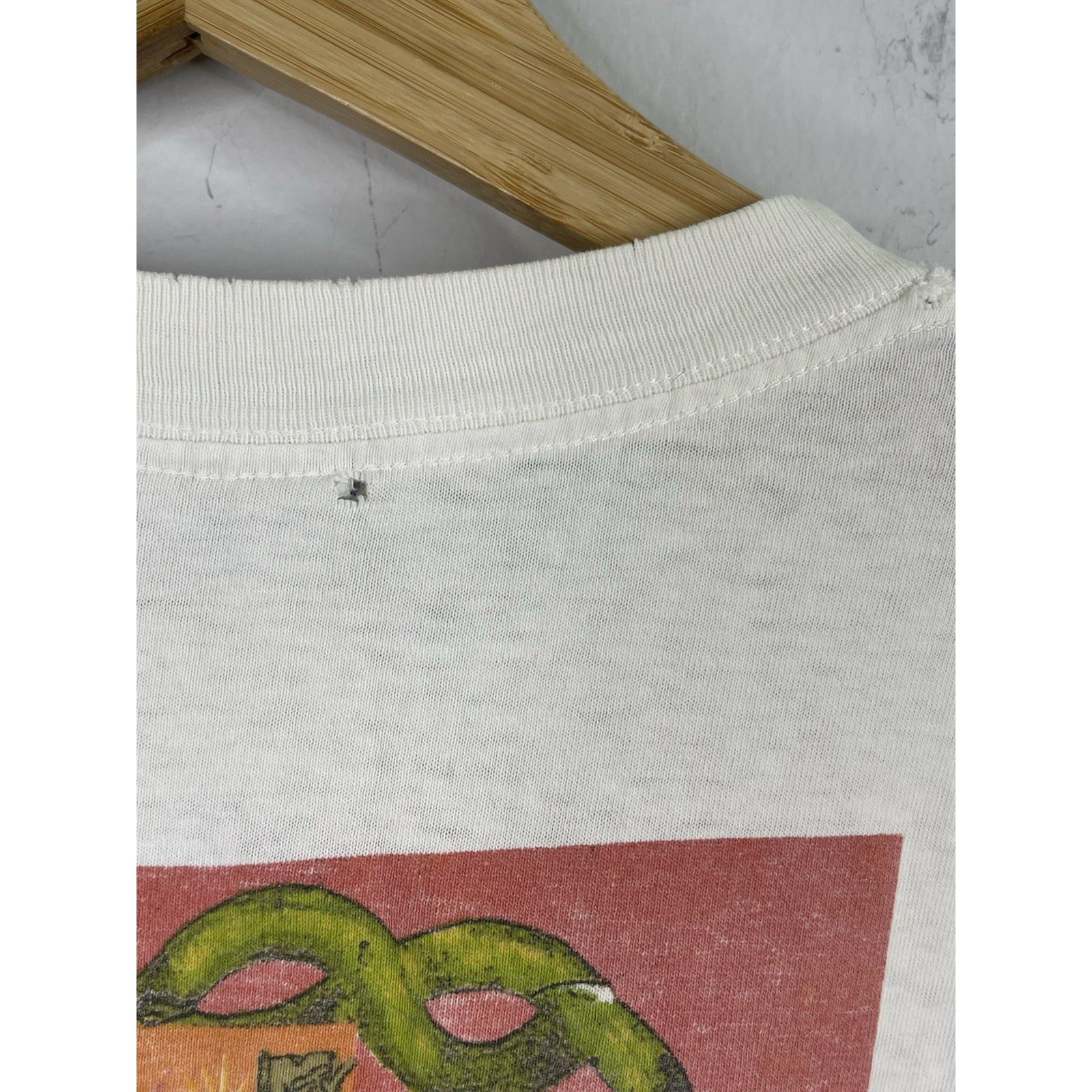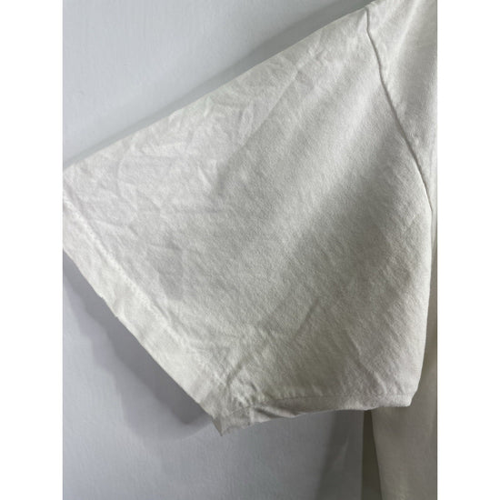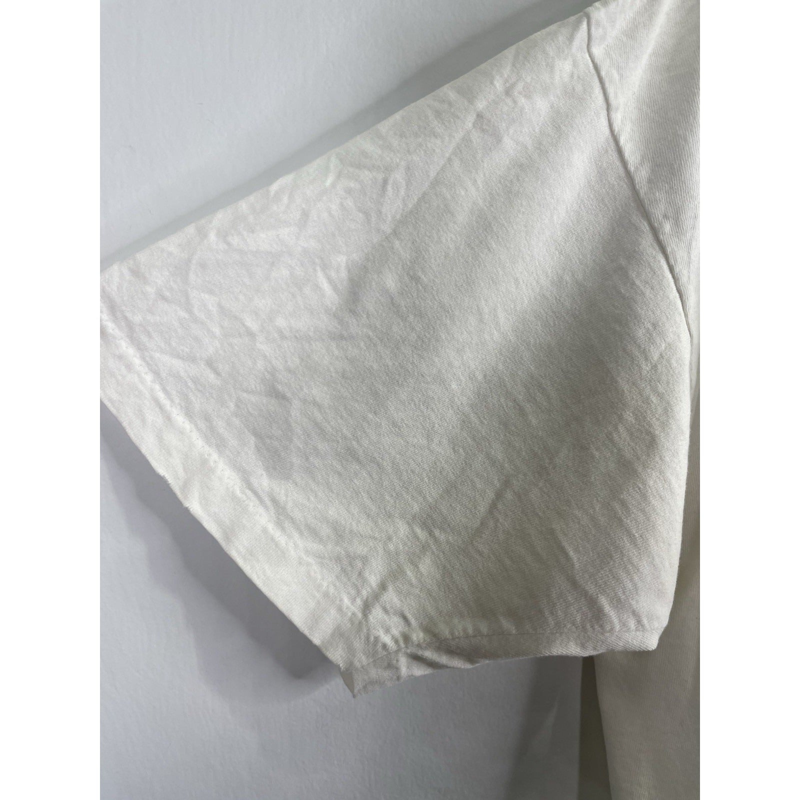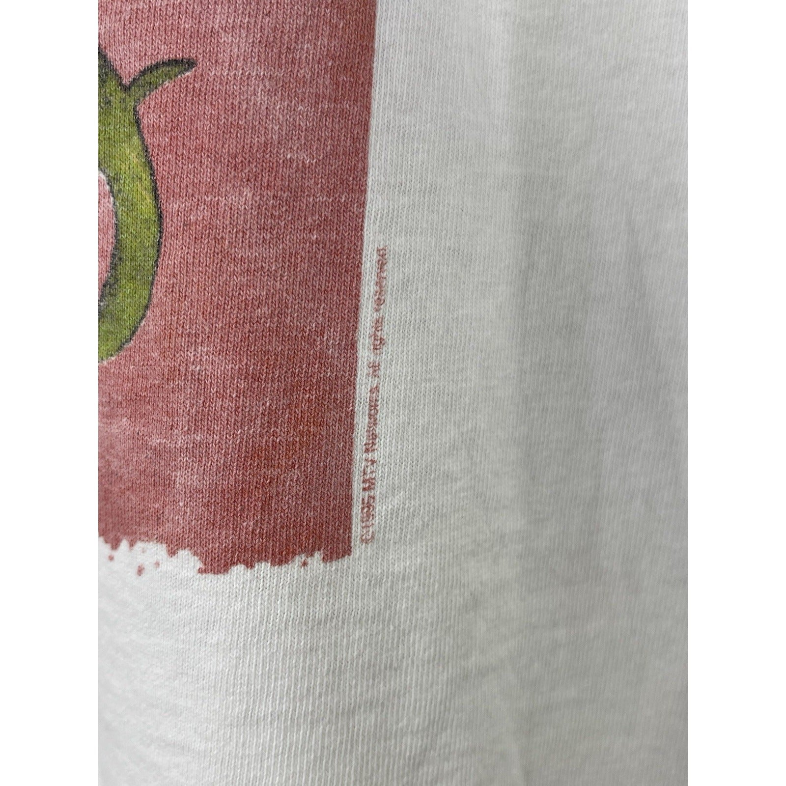 This Men’s Vintage MTV VMAs 1995 T-Shirt is a single-stitch tee featuring a graphic print with a music video awards theme. The t-shirt is made of lightweight cotton material in a classic white color with a crew neckline and short sleeves. With a regular fit and XL size, this unisex shirt is a nostalgic piece perfect for music lovers and collectors of vintage clothing. The double-sided print adds a unique touch to this retro shirt from the All Sport brand.