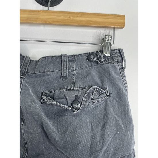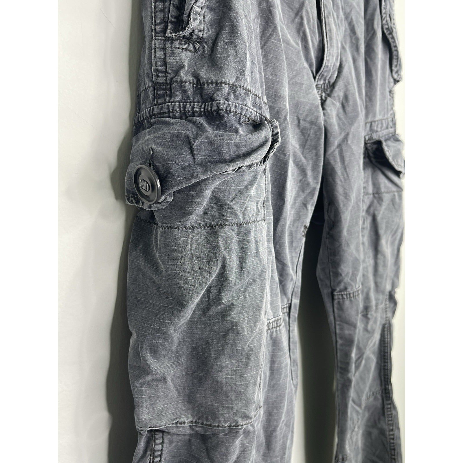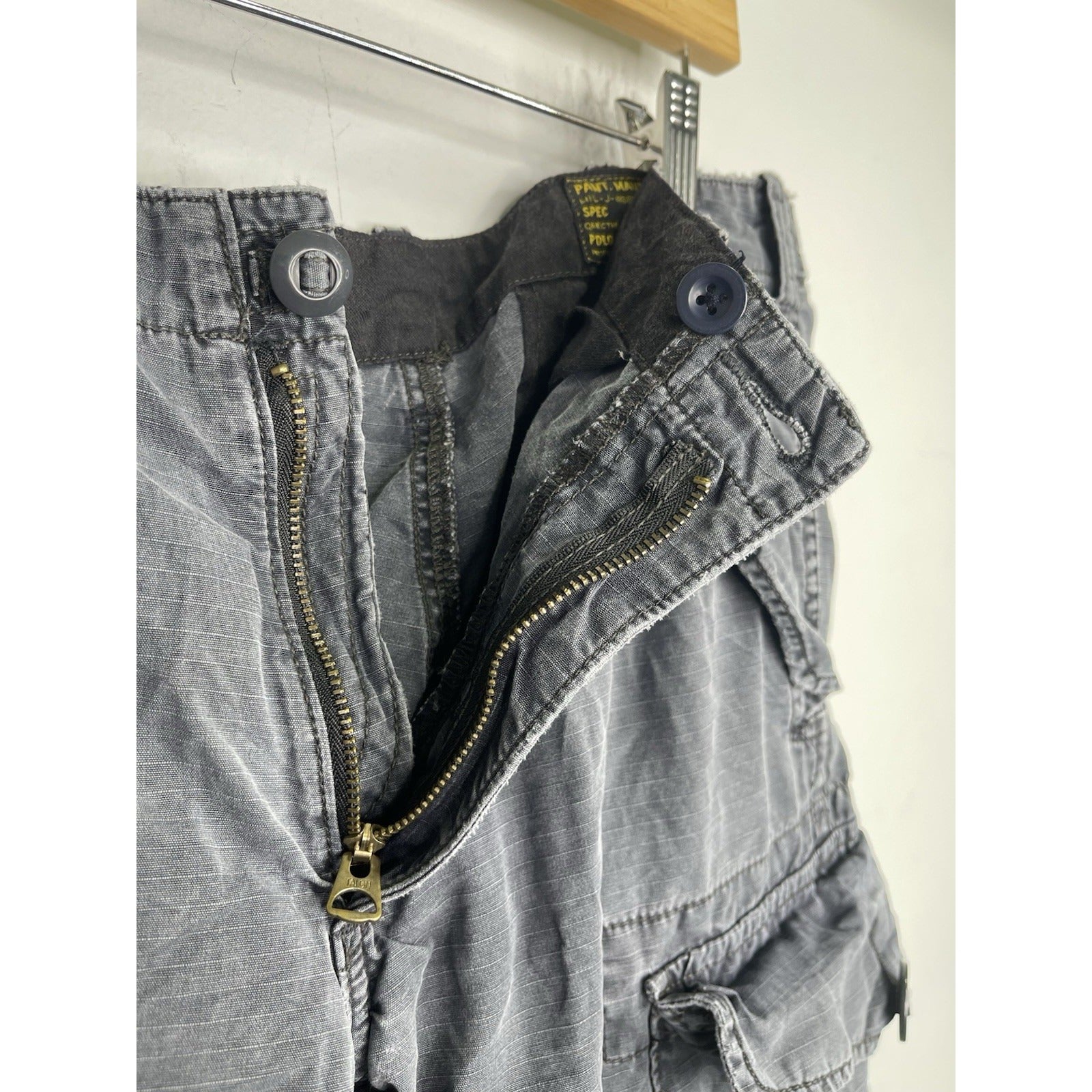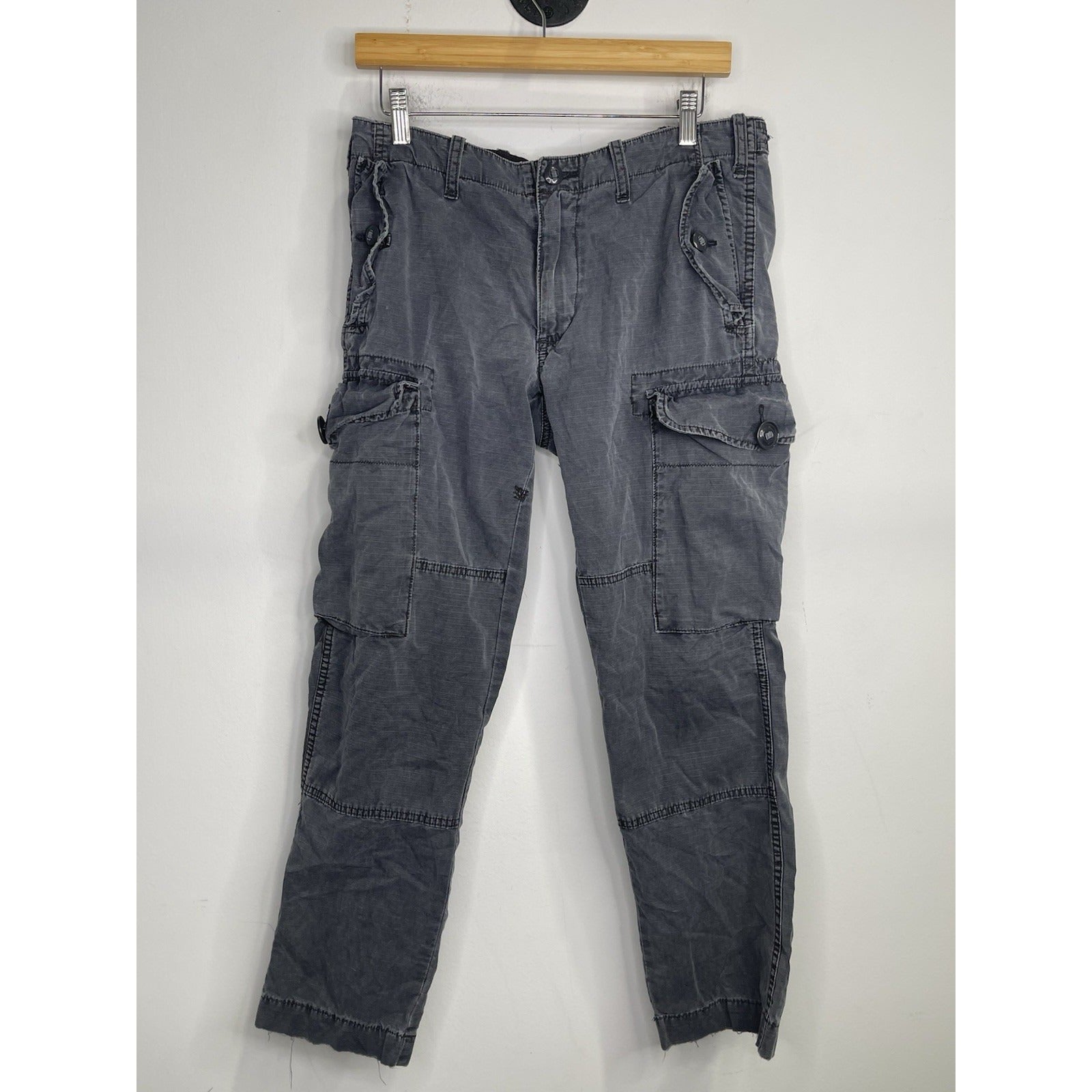 The product is a pair of Men’s Vintage Polo Ralph Lauren Pants in blue, featuring a solid pattern with a zip closure. These cargo-style pants are designed for casual occasions, with a regular fit and a 29-inch inseam. Made from cotton, they have adjustable waist and pockets, embodying a classic workwear look with a nod to a vintage aesthetic. The size indicates a 34-inch waist and 29-inch inseam, catering to the preferences of a modern man seeking a blend of style and comfort.