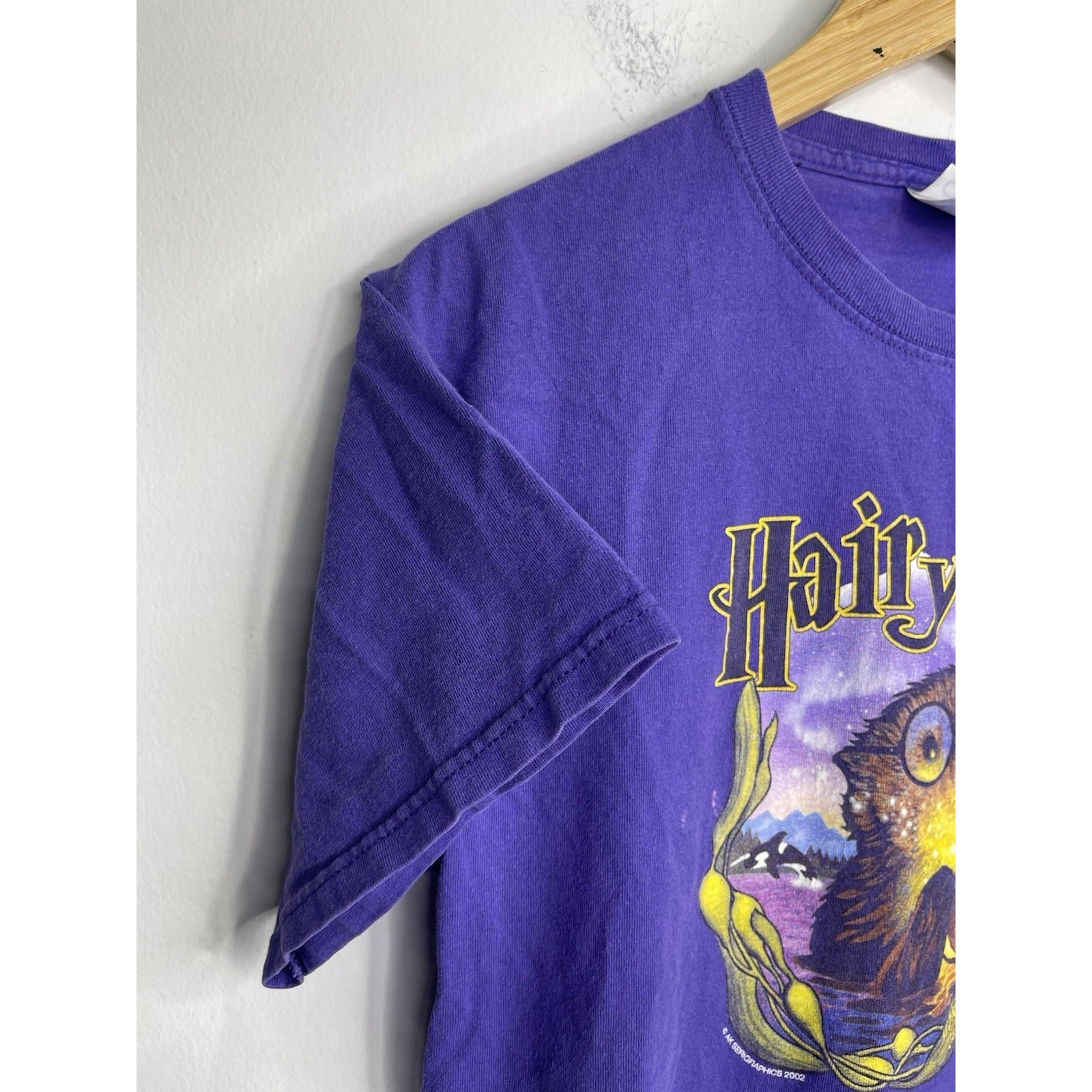 The product is a men's vintage purple hairy otter parody Harry Potter spoof graphic t-shirt in size large. Made of cotton, this short sleeve shirt features a crew neck and a regular fit. The graphic print adds a fun and humorous touch, making it suitable for all seasons. With its unique design and vintage appeal, this t-shirt is a must-have for any fan of Harry Potter or someone looking to add a quirky piece to their wardrobe.
