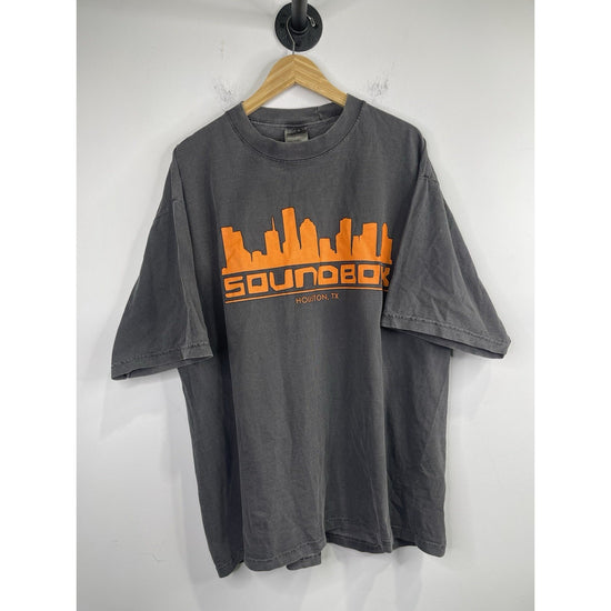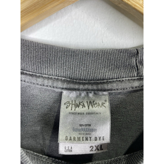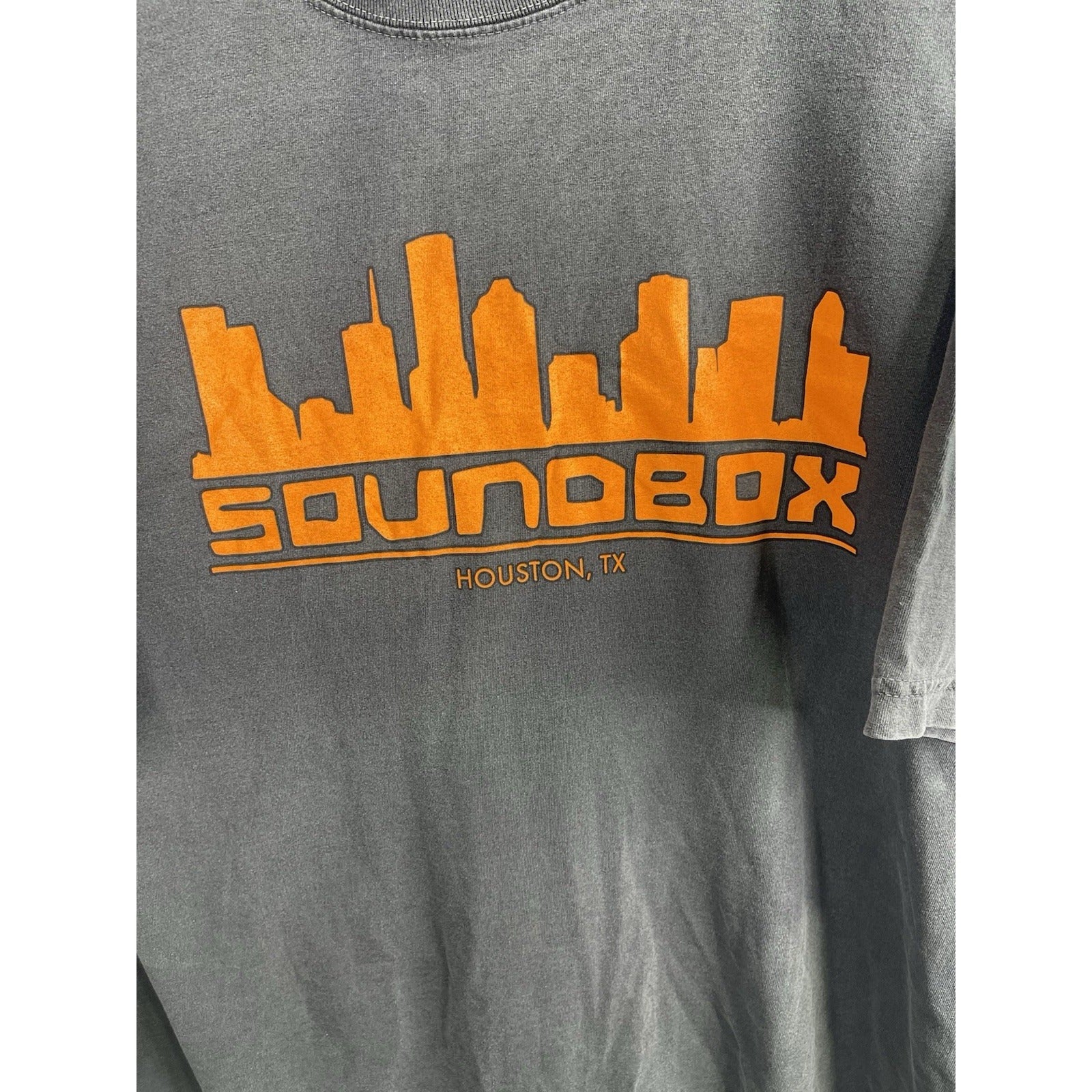 This men's vintage Shaka Wear black T-shirt features a 'Soundbox Houston TX' graphic print, short sleeves, a crew neck, and is made of heavyweight cotton material. The 2XL size offers a regular fit, perfect for those looking for a classic and 90s-inspired style. The brand's vintage aesthetic adds a unique and retro touch to this wardrobe staple.