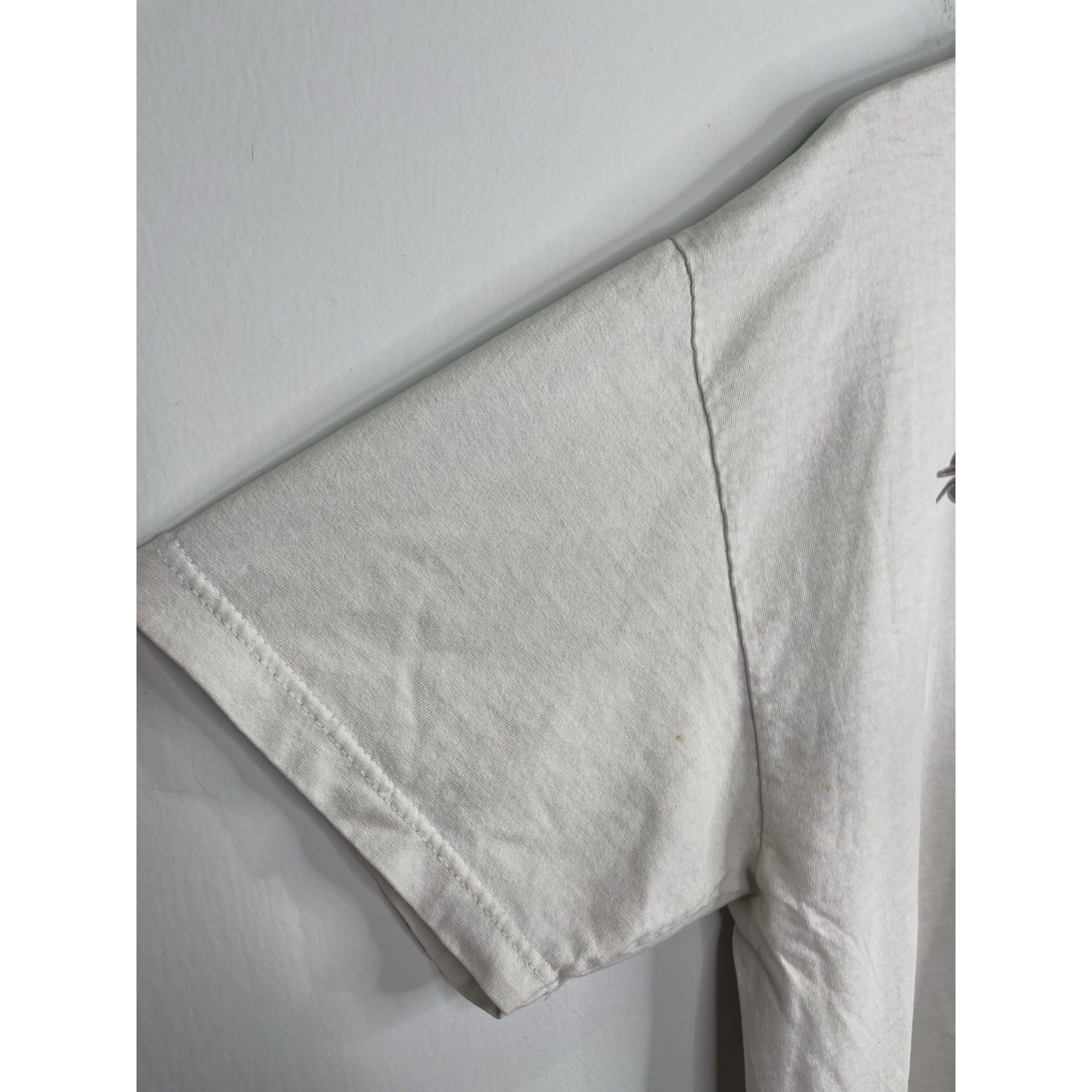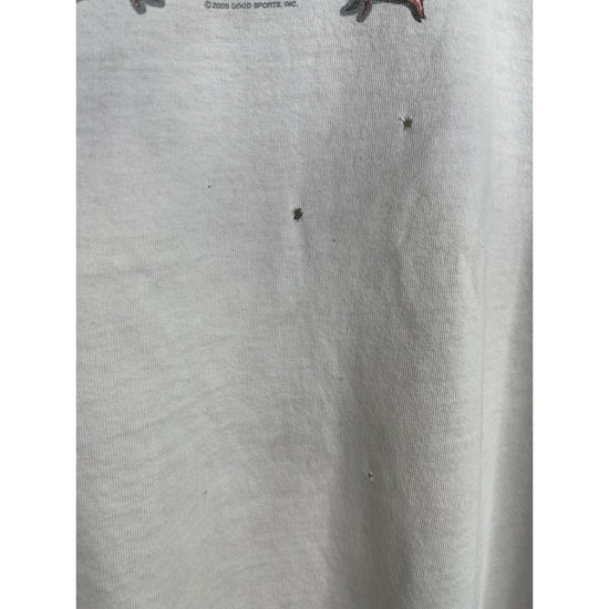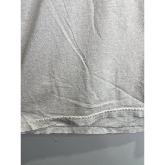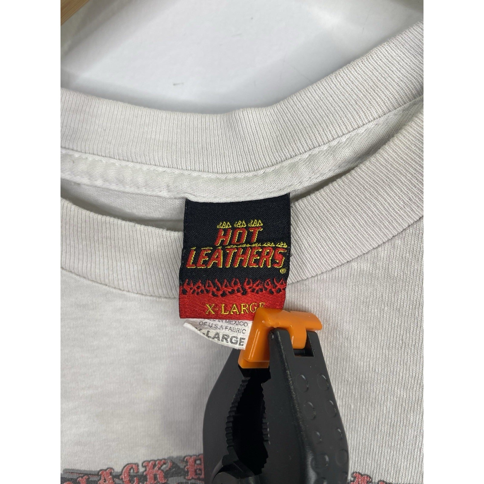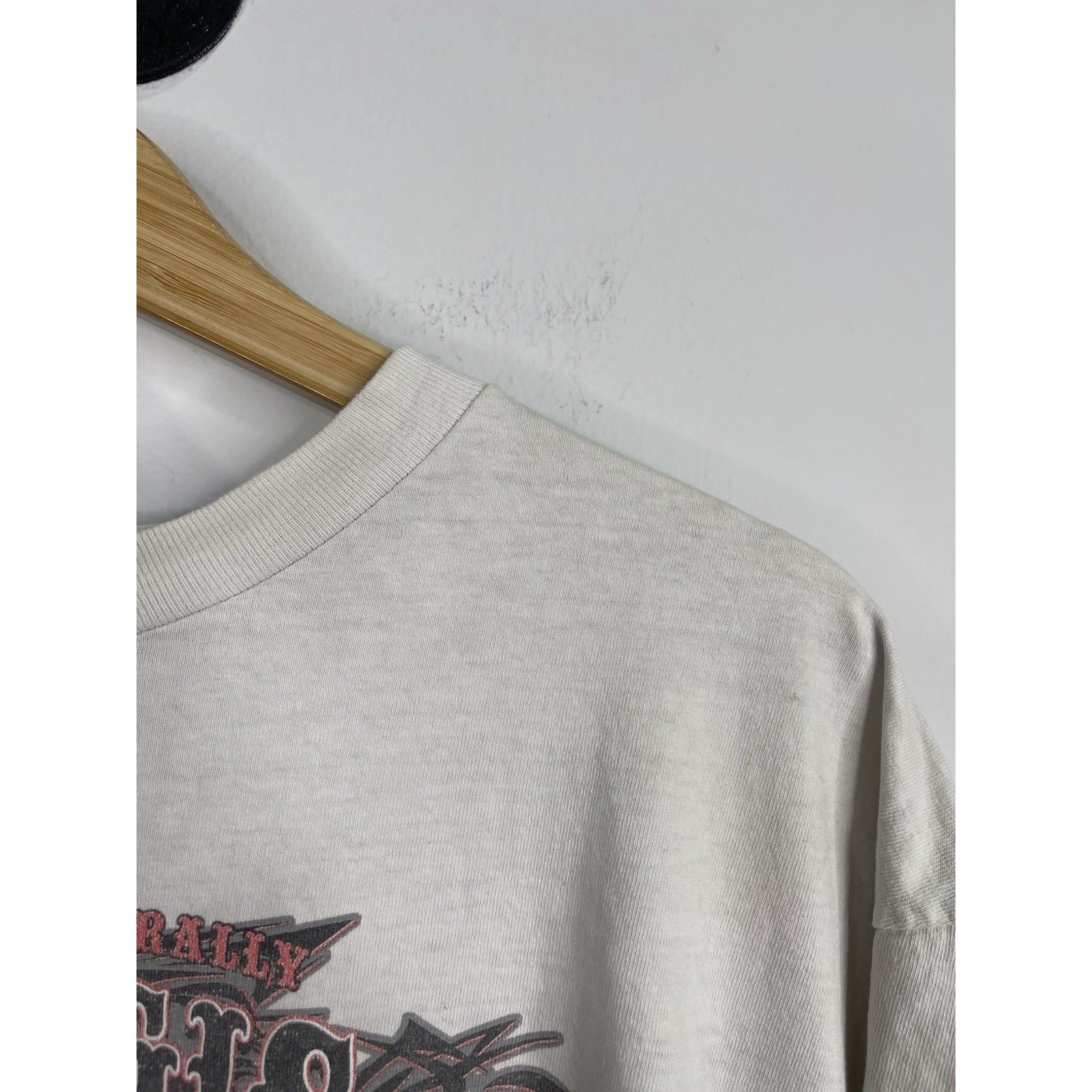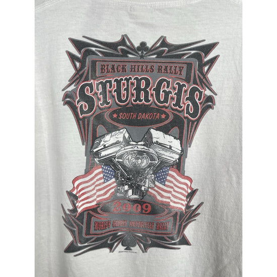 This Men's Vintage Sturgis Motorcycle Black Hills Rally T-Shirt from 2009 in size XL is a classic piece with a graphic print featuring a biker, motorcycle, and 90s theme. Made of cotton and machine washable, this regular fit t-shirt has a white color with a crew neck and short sleeves. The double-sided print adds a unique touch to this vintage piece manufactured by Hot Leathers in the United States during the 1990s. Perfect for any motorcycle enthusiast looking for a nostalgic addition to their wardrobe.