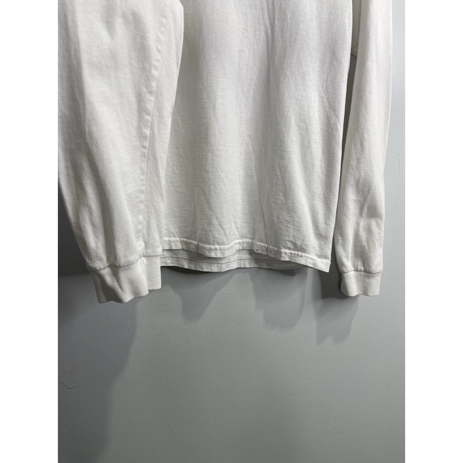 This men's vintage Quiksilver long-sleeve tee in white features a classic crew neckline and is made from breathable cotton knit fabric. The shirt is adorned with the Quiksilver logo and is a part of the Quiksilver Boardriding product line, perfect for fans of surfing and beach themes. With a double-sided design and a regular fit, this shirt is ideal for all seasons and can be easily cared for with machine washing. Ideal for those who appreciate vintage clothing with a touch of surf-inspired style.