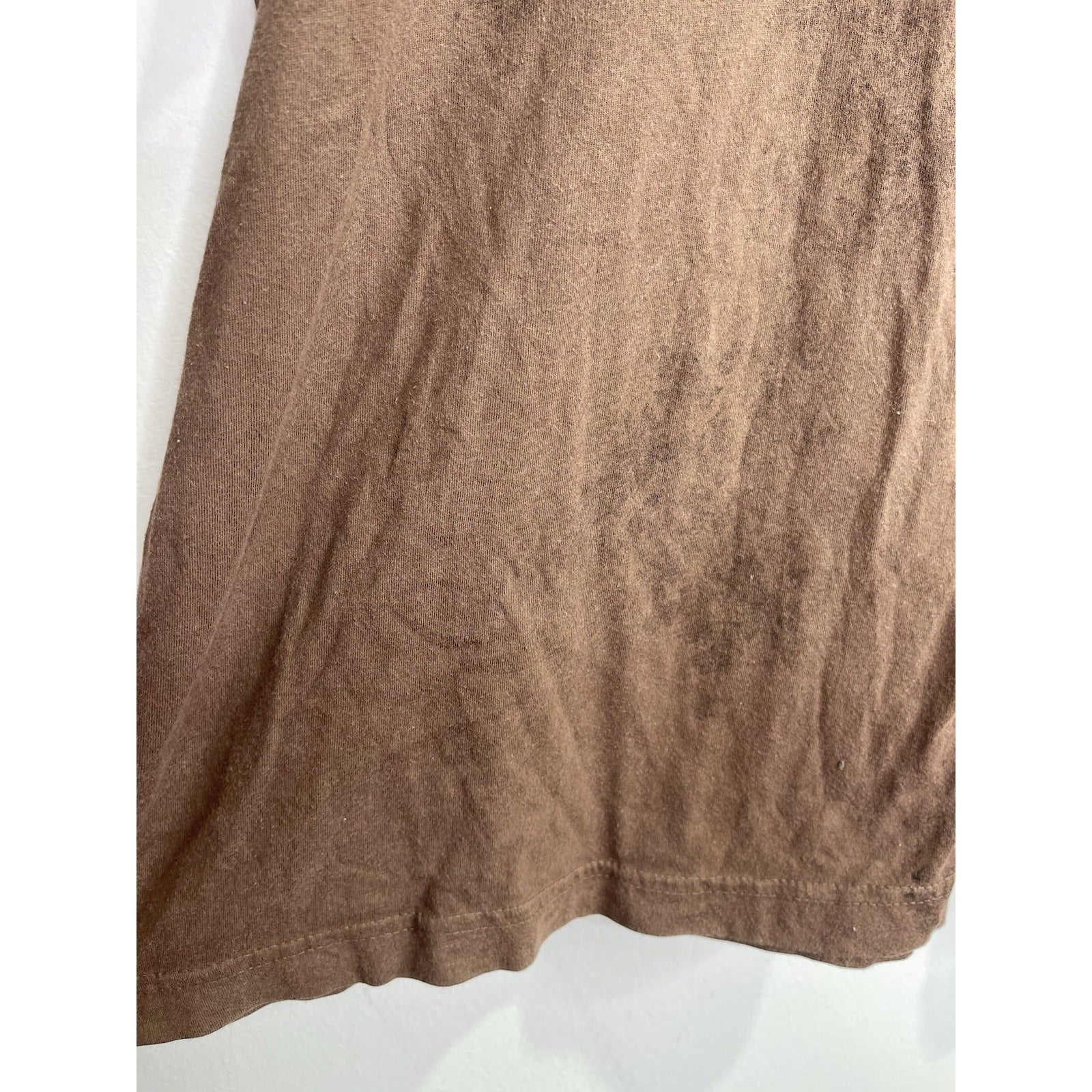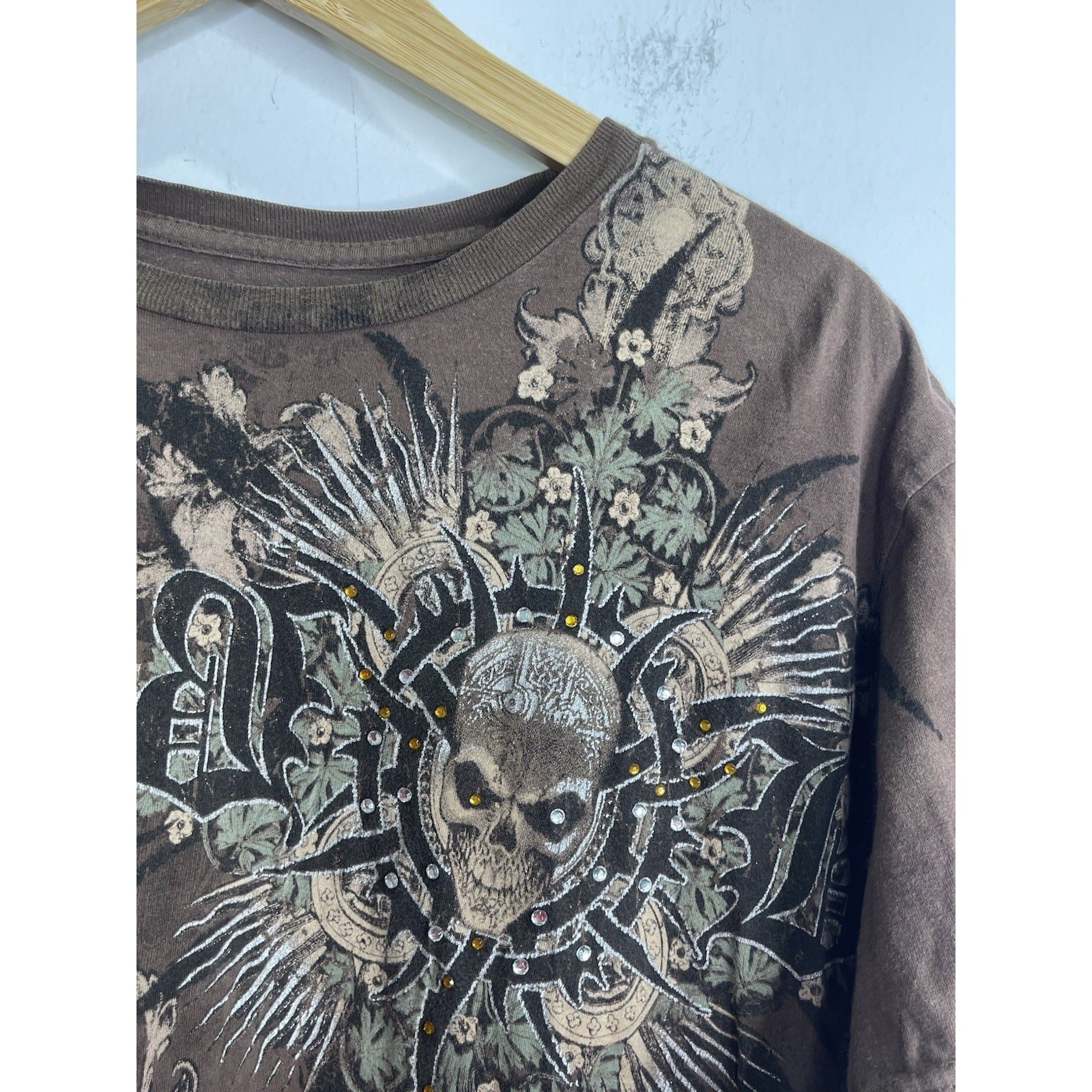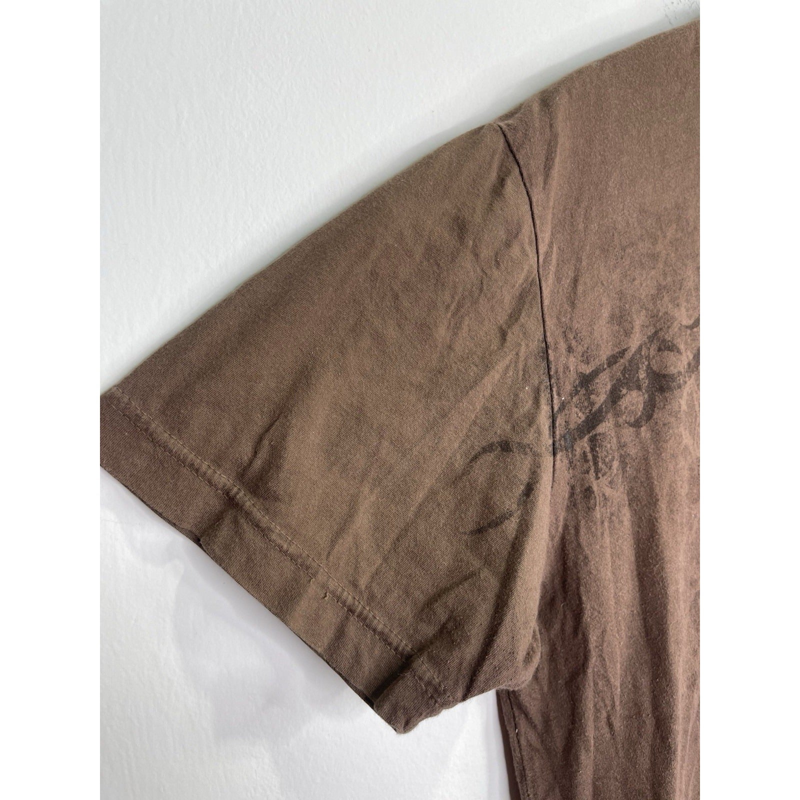 This Men's Vintage Y2K Brad Butter Brown Skeleton Crosses Rhinestone T-Shirt in size Large features a graphic print design with a touch of grunge and gothic themes. Made of breathable cotton material, this classic fit shirt has short sleeves, a crew neck, and is double-sided for added style. The brown color and rhinestone accents give it a unique and edgy look, perfect for men who appreciate vintage fashion with a modern twist. Easy to care for, this shirt is a must-have addition to any hip hop or alternative wardrobe.
