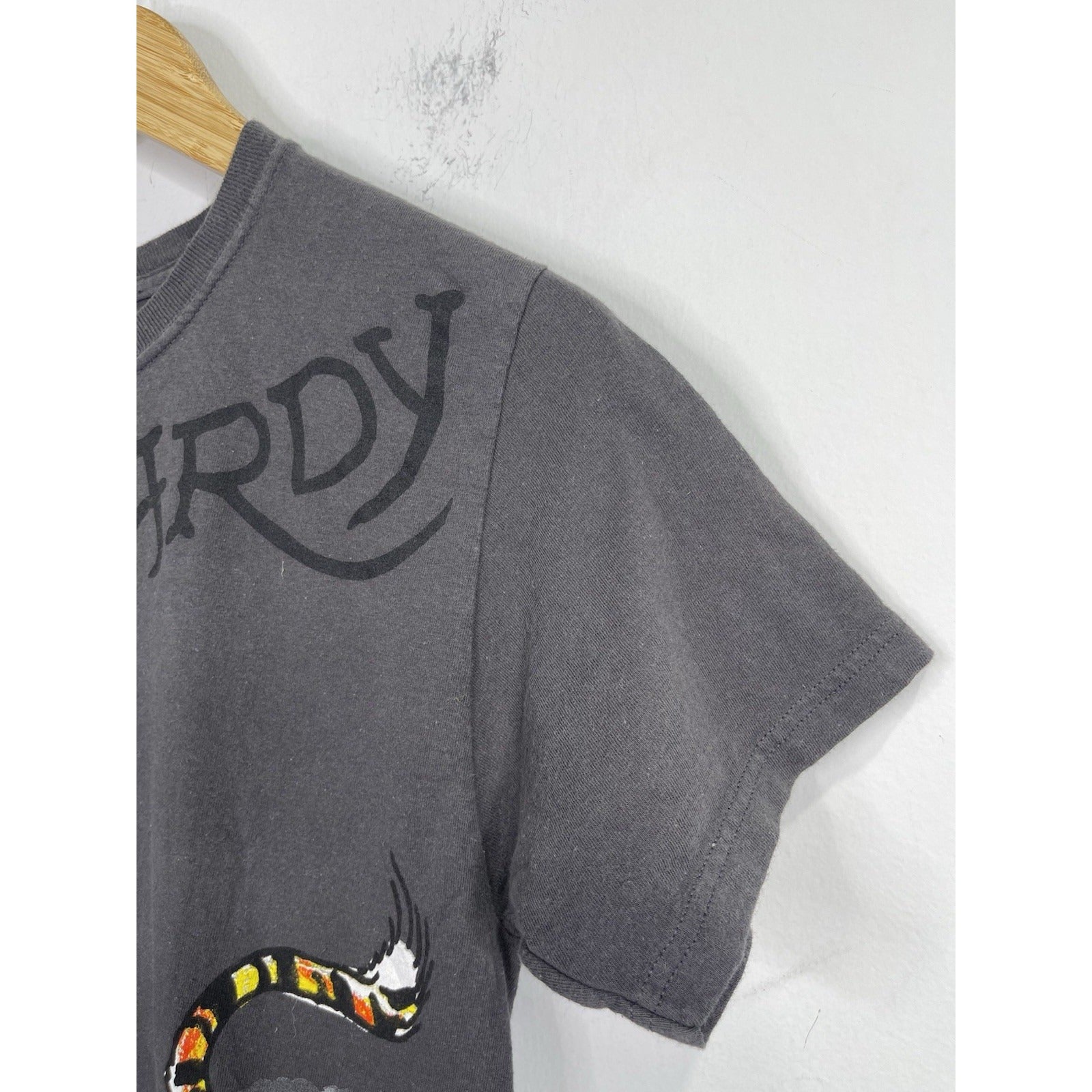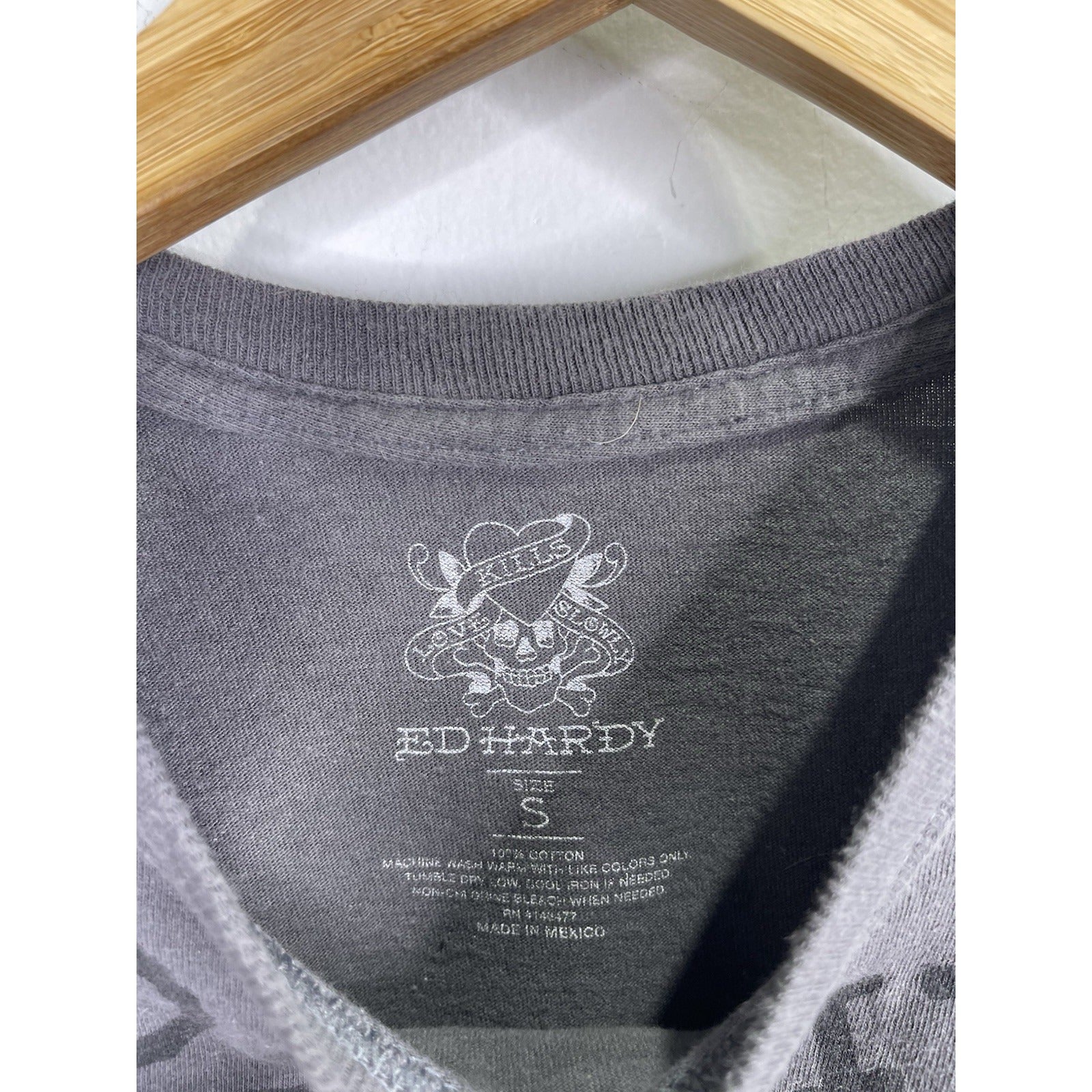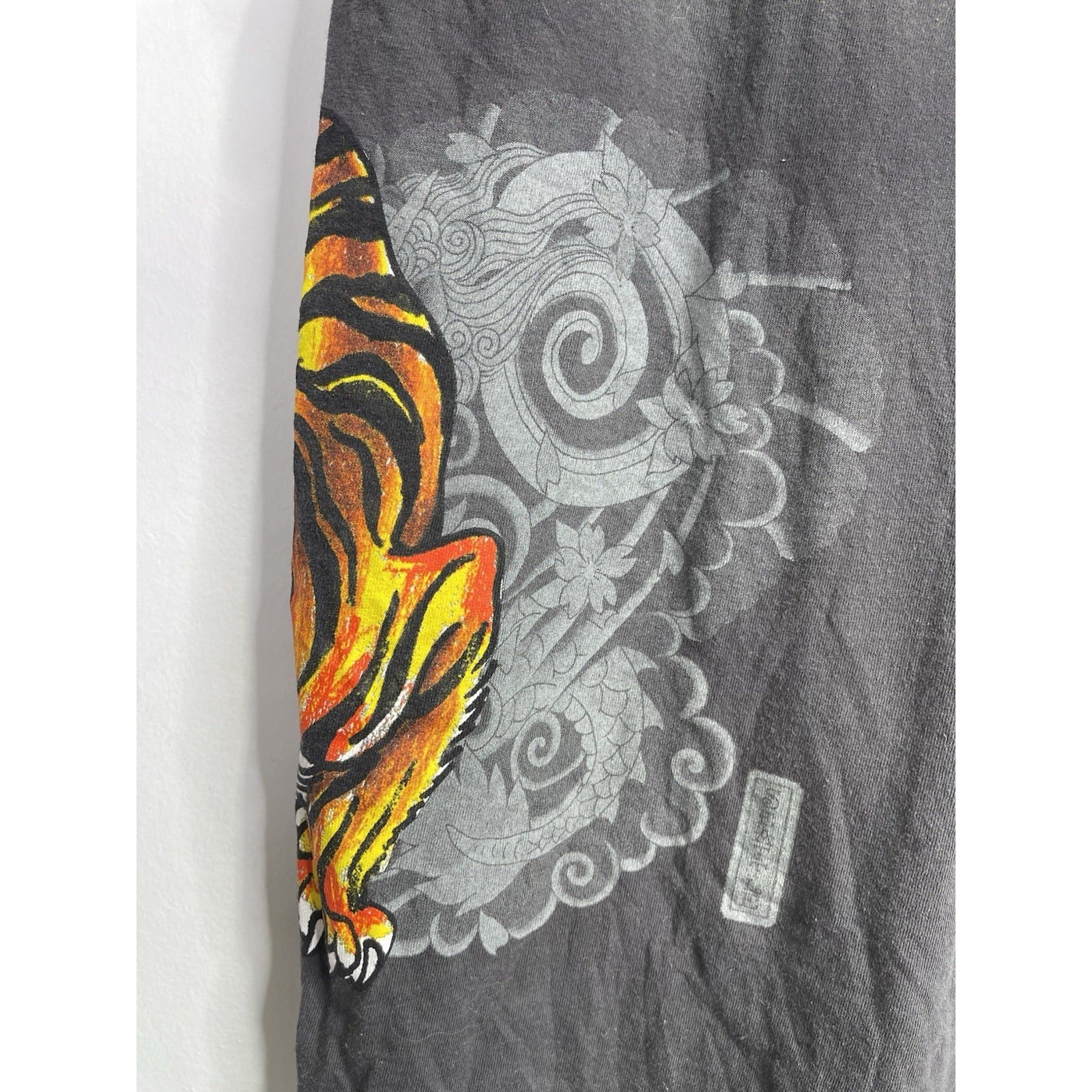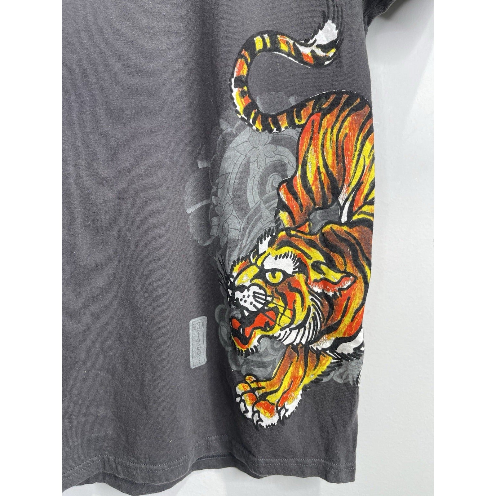 This Men's Vintage Y2K Ed Hardy Graphic Tiger Wraparound Gray T-Shirt in size S is a stylish and unique addition to any wardrobe. Made of cotton, this short sleeve shirt features a striking animal print design with a crew neck and regular fit. The Tiger theme and tattoo-inspired graphics give it a trendy and edgy look, making it perfect for any season and easy to care for. The wraparound design adds a touch of creativity to this designer piece from Ed Hardy.