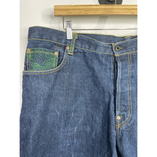 The Men’s Vintage Y2K RMC Dark Wash Embroidered Denim Shorts in size 40x14 are a classic and stylish addition to any man's wardrobe. These solid-colored shorts feature a button closure, flat front, and are made from durable cotton denim fabric. The dark wash and embroidered accents give these shorts a unique and vintage look, perfect for casual occasions. With a waist size of 40 inches and a regular fit, these shorts offer comfort and style for a timeless and iconic look. Upgrade your wardrobe with these timeless denim shorts.
