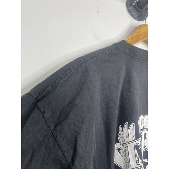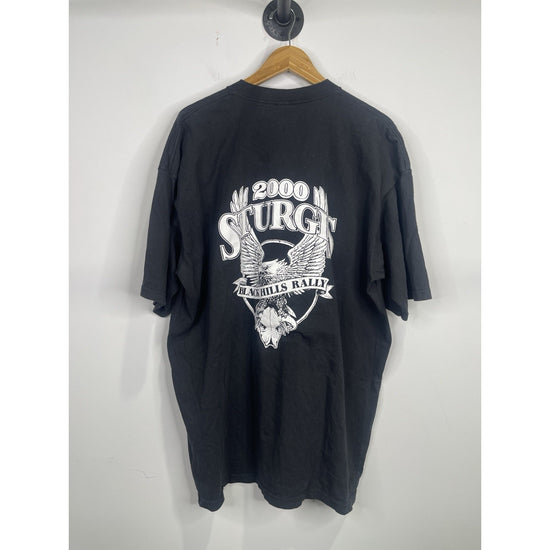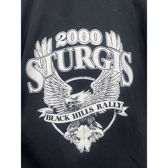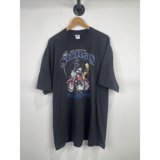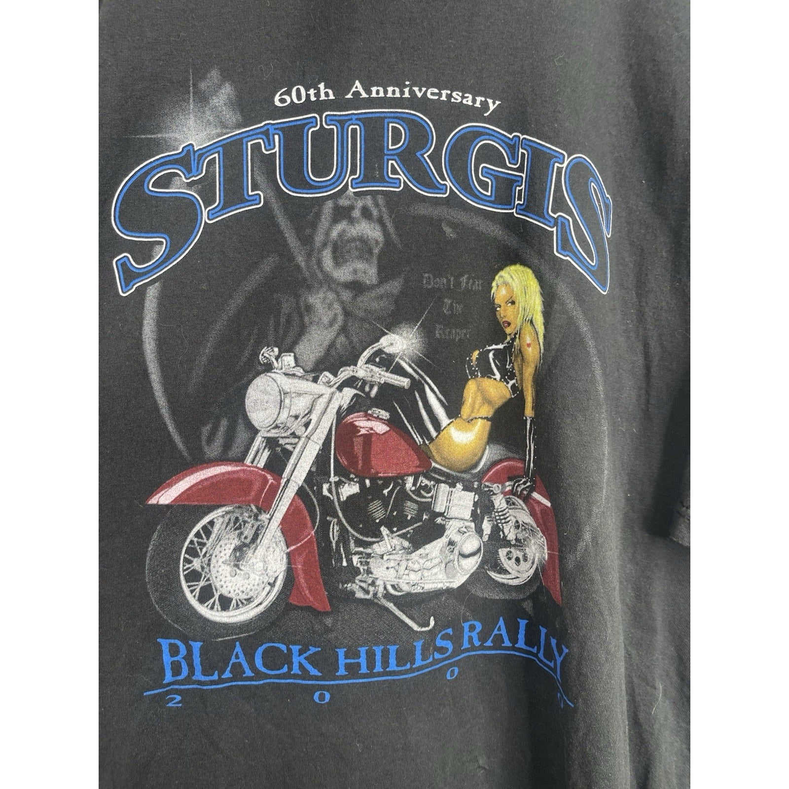 This Men's VTG 2000s Sturgis 60th Anniversary Black Hills Rally Graphic T-shirt in size 3XL is a vintage piece perfect for motorcycle enthusiasts and bikers. The black cotton shirt features a graphic print celebrating the iconic Sturgis event, with a crew neck and short sleeves making it suitable for all seasons. Made in the United States, this regular fit T-shirt from the brand WCW is both easy to care for and double-sided, adding a unique touch to any wardrobe.