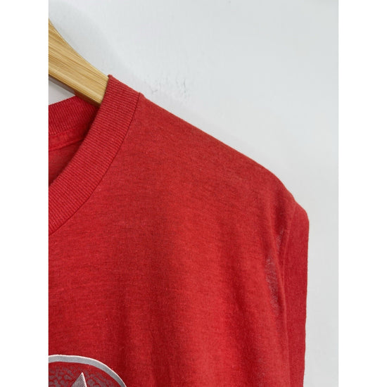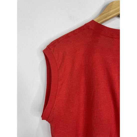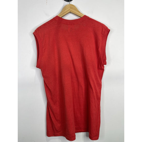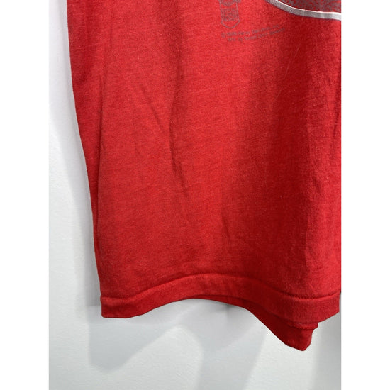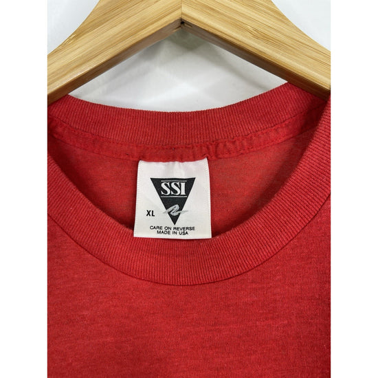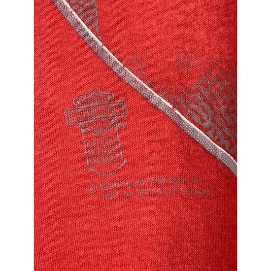 This product is a vintage 80's Harley Davidson motorcycle t-shirt in size XL. The shirt features a round neckline, short sleeves, and is made of a blend of cotton and polyester. It is designed with a slim fit and showcases a classic American biker theme, perfect for fans of motorcycle culture and vintage style. Made in the United States, this t-shirt is a stylish and nostalgic addition to any wardrobe for those who appreciate American iron and the biker lifestyle.
