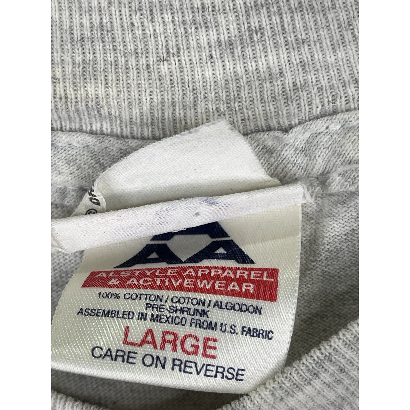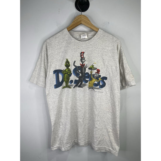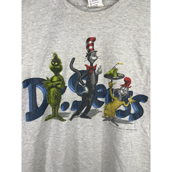 This Men's VTG 90s Dr. Seuss Grinch Cat In The Hat Green Eggs & Ham Gray T-Shirt in size L features a graphic print with characters from Dr. Seuss, including the Grinch and Cat in the Hat. Made of breathable cotton material, this regular fit t-shirt has a crew neck and short sleeves, making it suitable for all seasons. The vintage design and classic theme make it a unique and nostalgic addition to any wardrobe, perfect for fans of Dr. Seuss and classic children's literature.