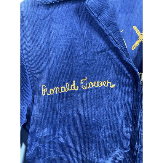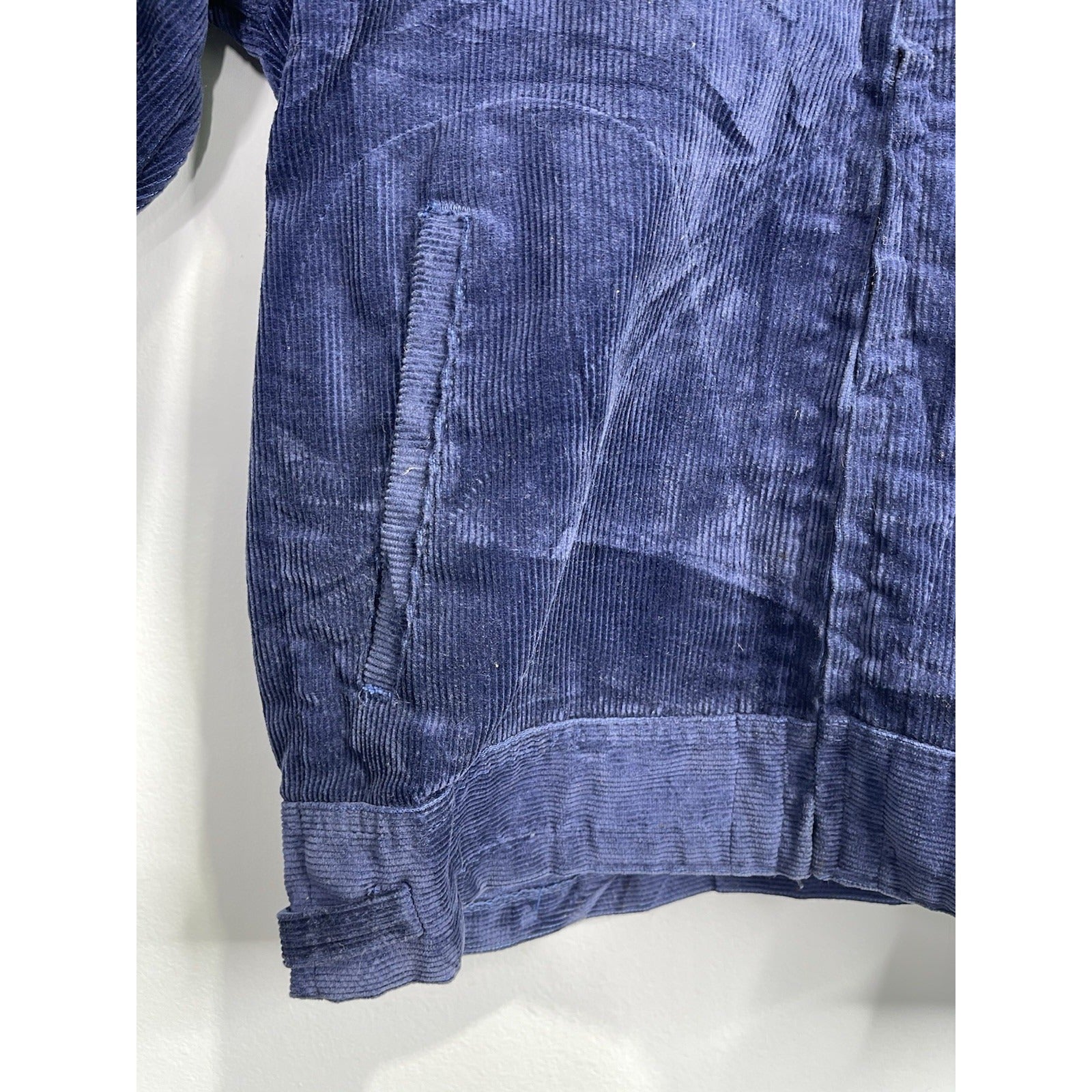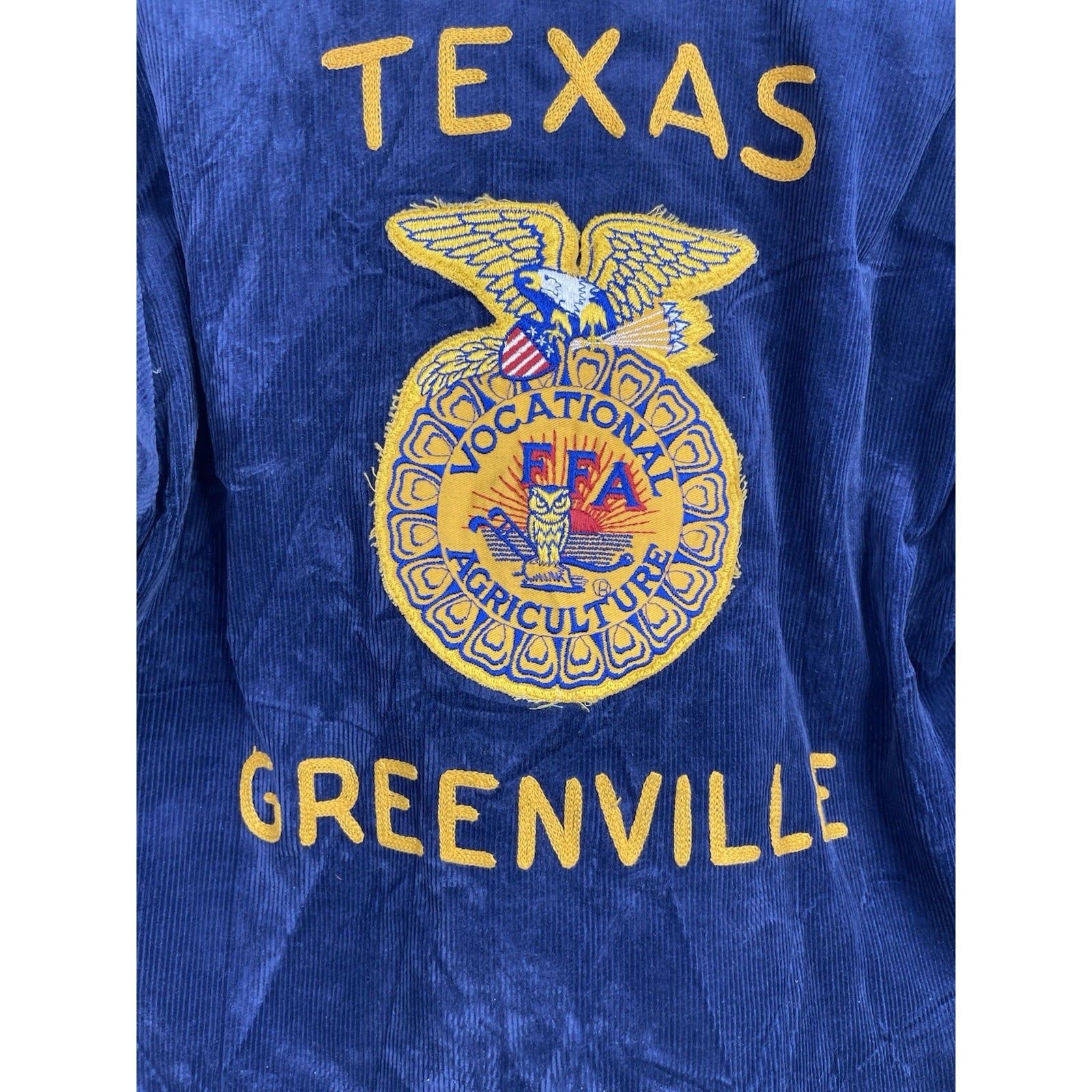 The Men’s VTG FFA Jacket in Blue Navy Corduroy is a vintage piece perfect for those who appreciate classic 80s and 90s style. Made of cotton corduroy with a polyester lining, this mid-length bomber jacket features a spread collar, full zip closure, and National FFA logo accents. Ideal for workwear or outdoor activities like walking, hunting, or hiking, this jacket is a timeless addition to any wardrobe. Made in the United States, this jacket in size 36 exudes a rugged, retro charm that is sure to make a statement.