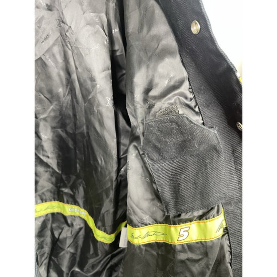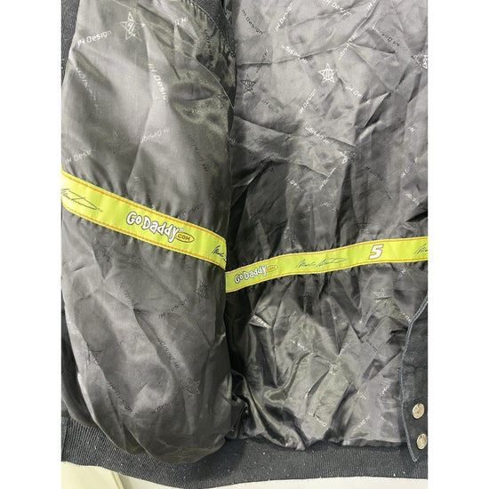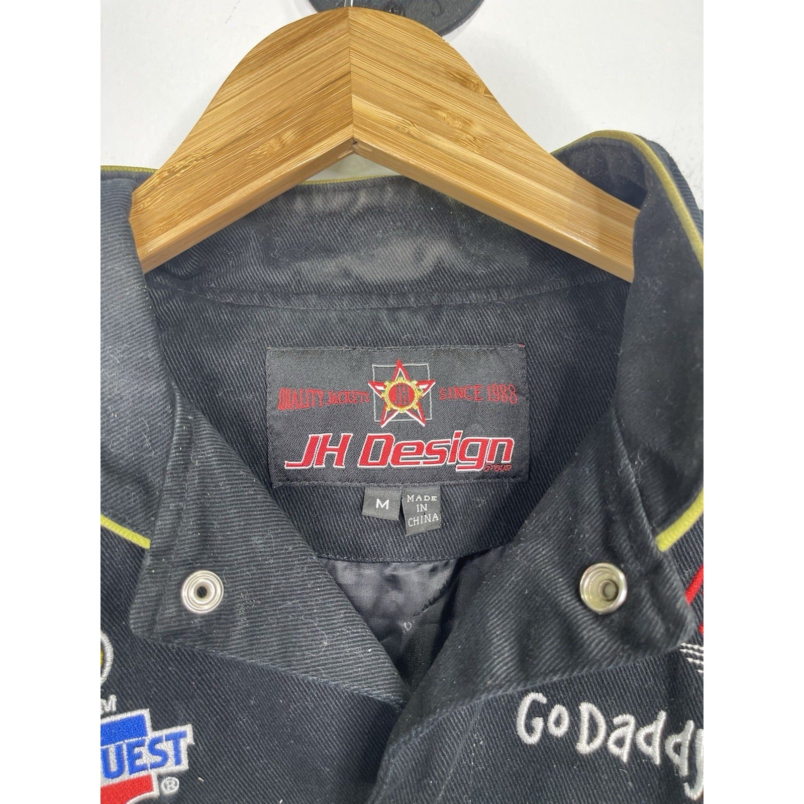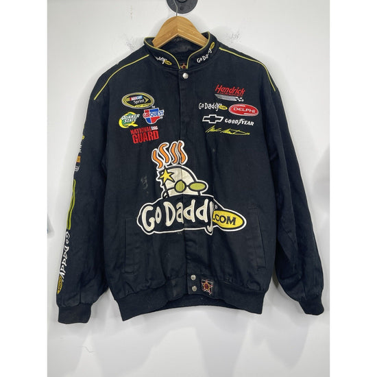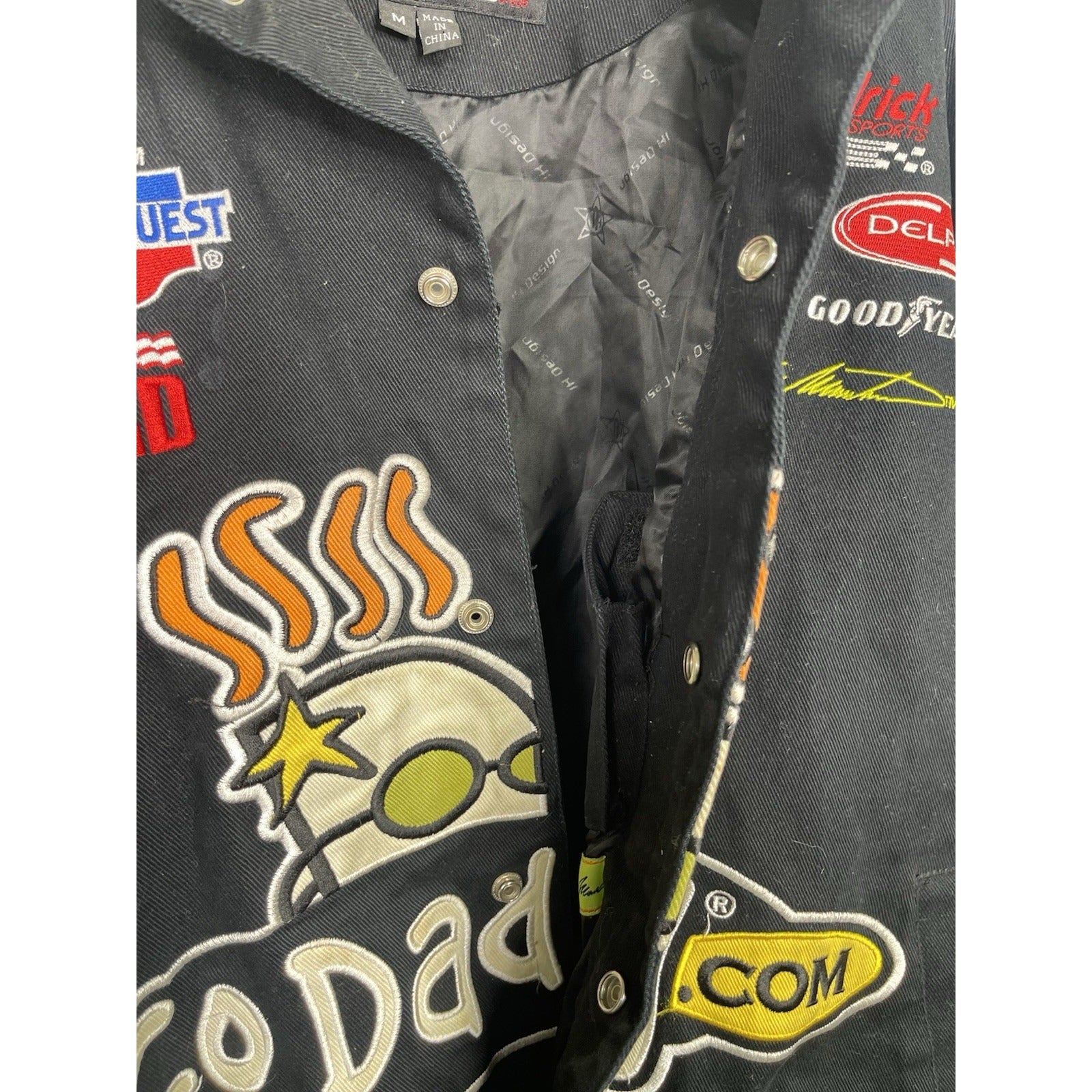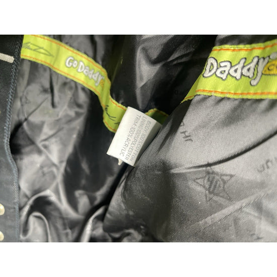 This Men's VTG Go Daddy Nascar Jacket by JH Design is a vintage inspired piece with a 90's logo, perfect for those who appreciate retro style. The black suede jacket features a solid pattern with embroidered accents and a zip, tie, button, and buckle closure. With a long length and a polyester lining, this jacket is suitable for various occasions including casual, formal, and workwear. The jacket is lightweight and designed for all seasons, making it a versatile and stylish addition to any wardrobe.