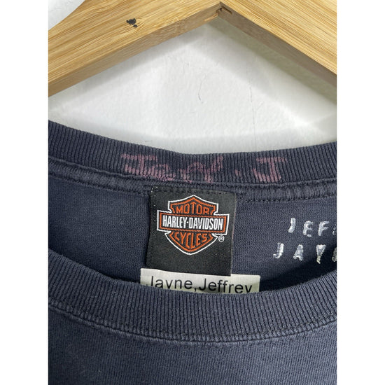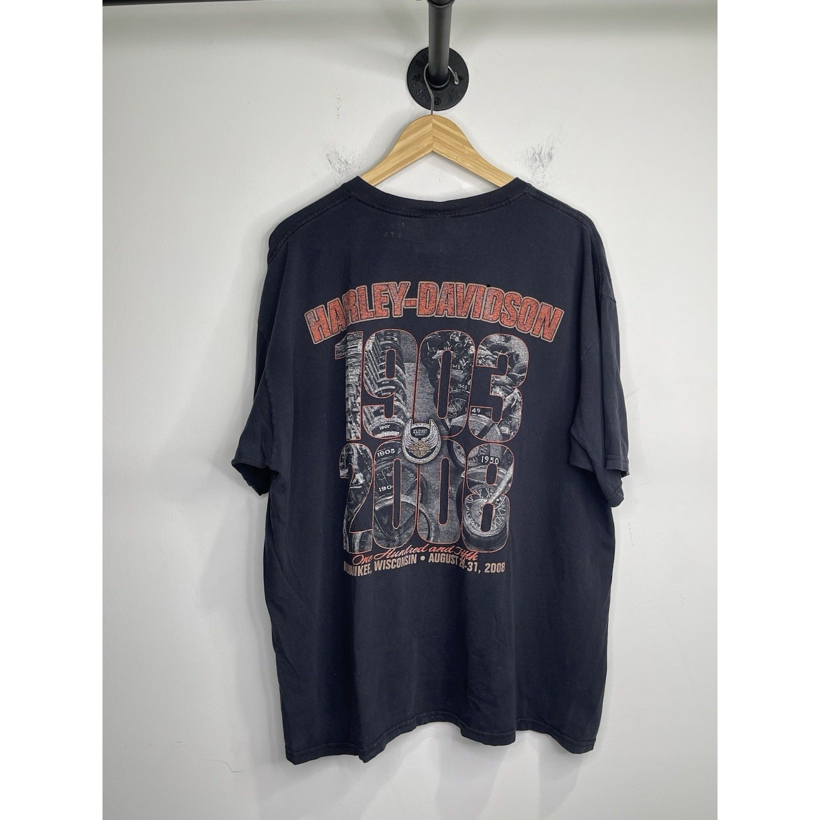 This Men’s VTG Graphic Harley-Davidson T-Shirt celebrates the 105th anniversary of the brand, featuring a black shirt with a crew neck and short sleeves. Made of comfortable cotton material, this regular fit shirt is machine washable and perfect for any biker or motorcycle enthusiast. The graphic print design showcases the iconic Harley-Davidson brand, representing American culture and themes of freedom and adventure. Ideal for casual wear, this timeless shirt is a must-have for any fan of the brand.