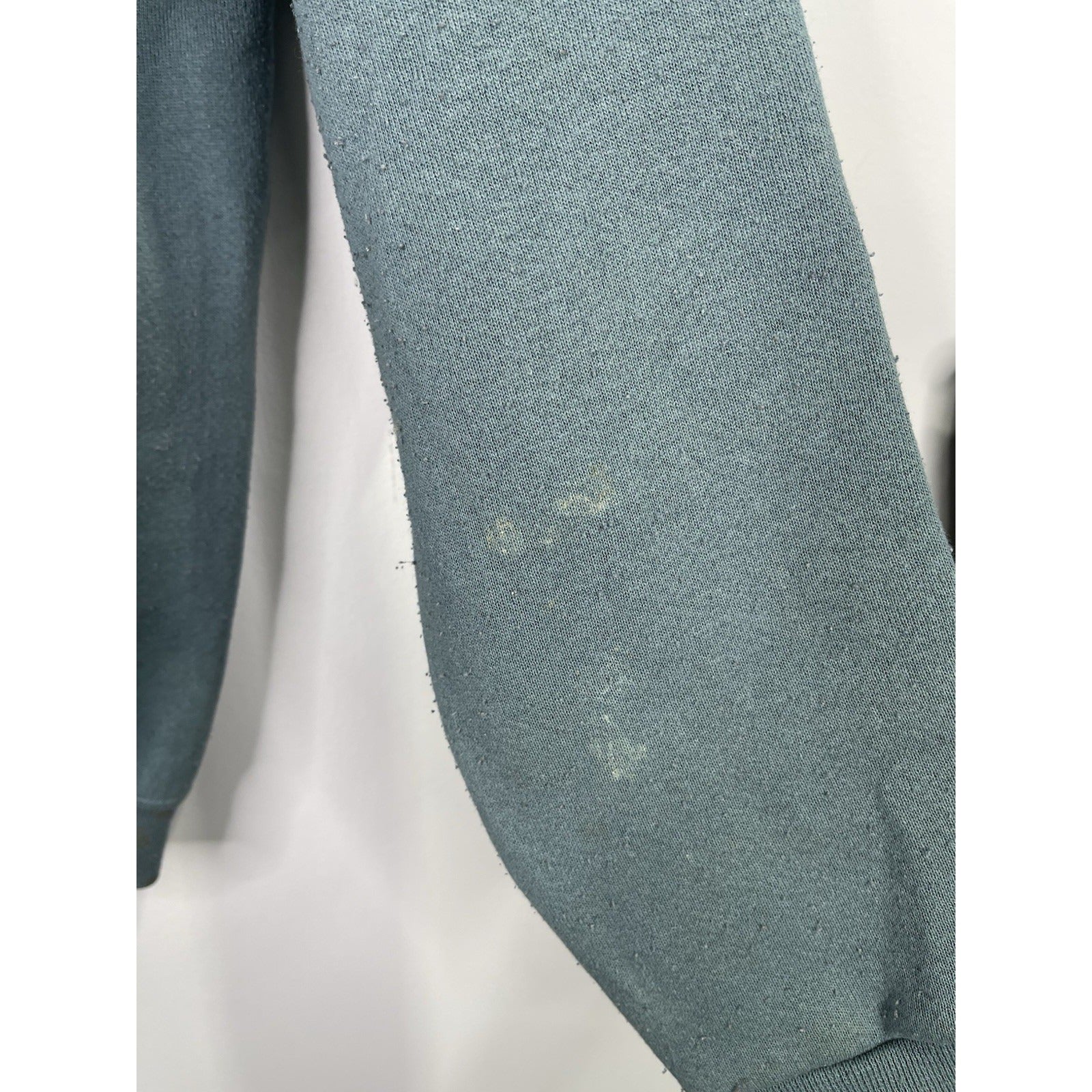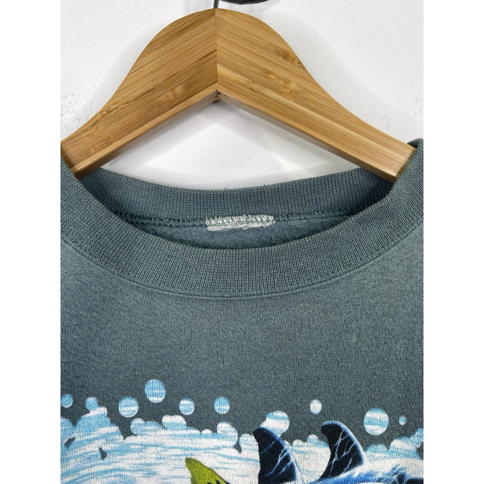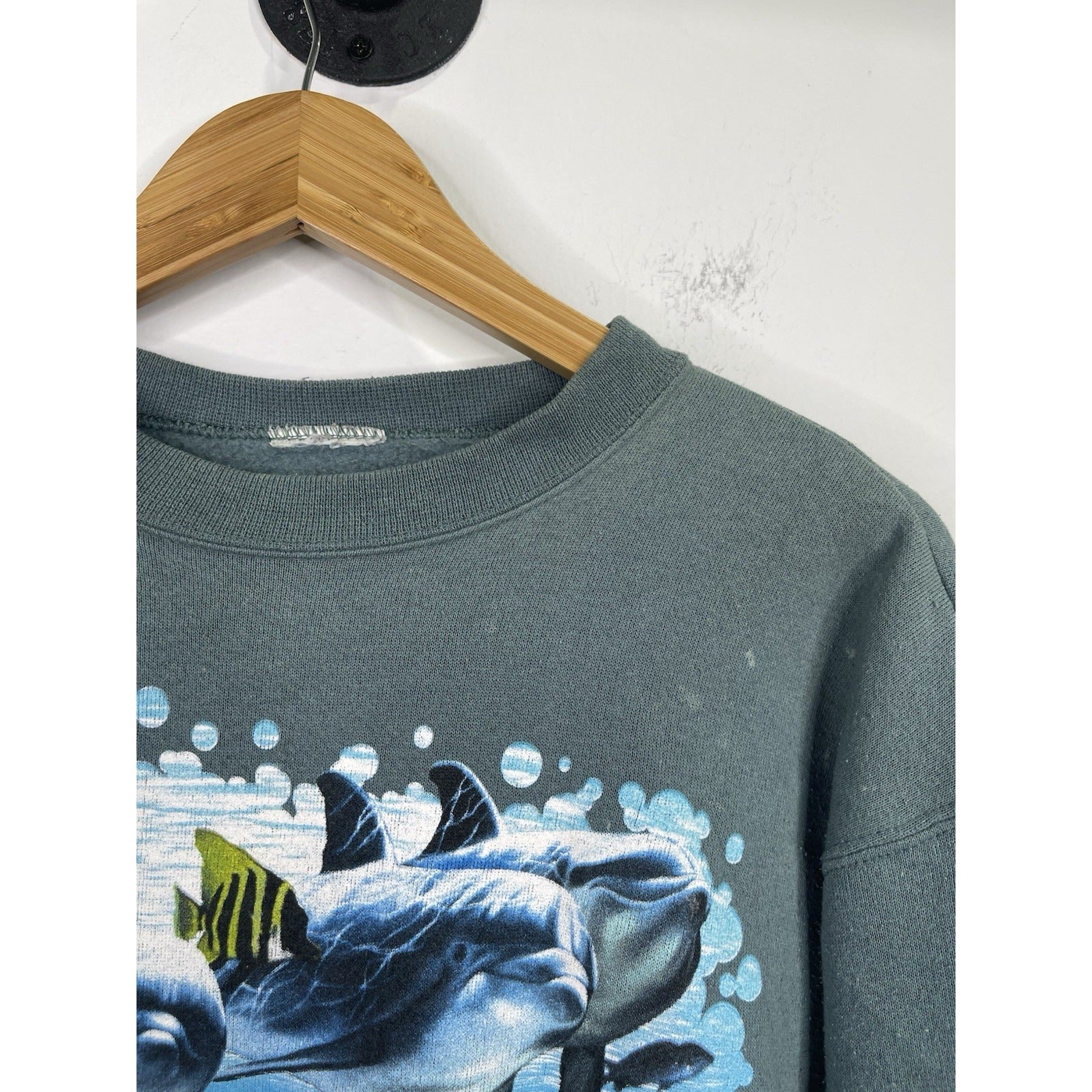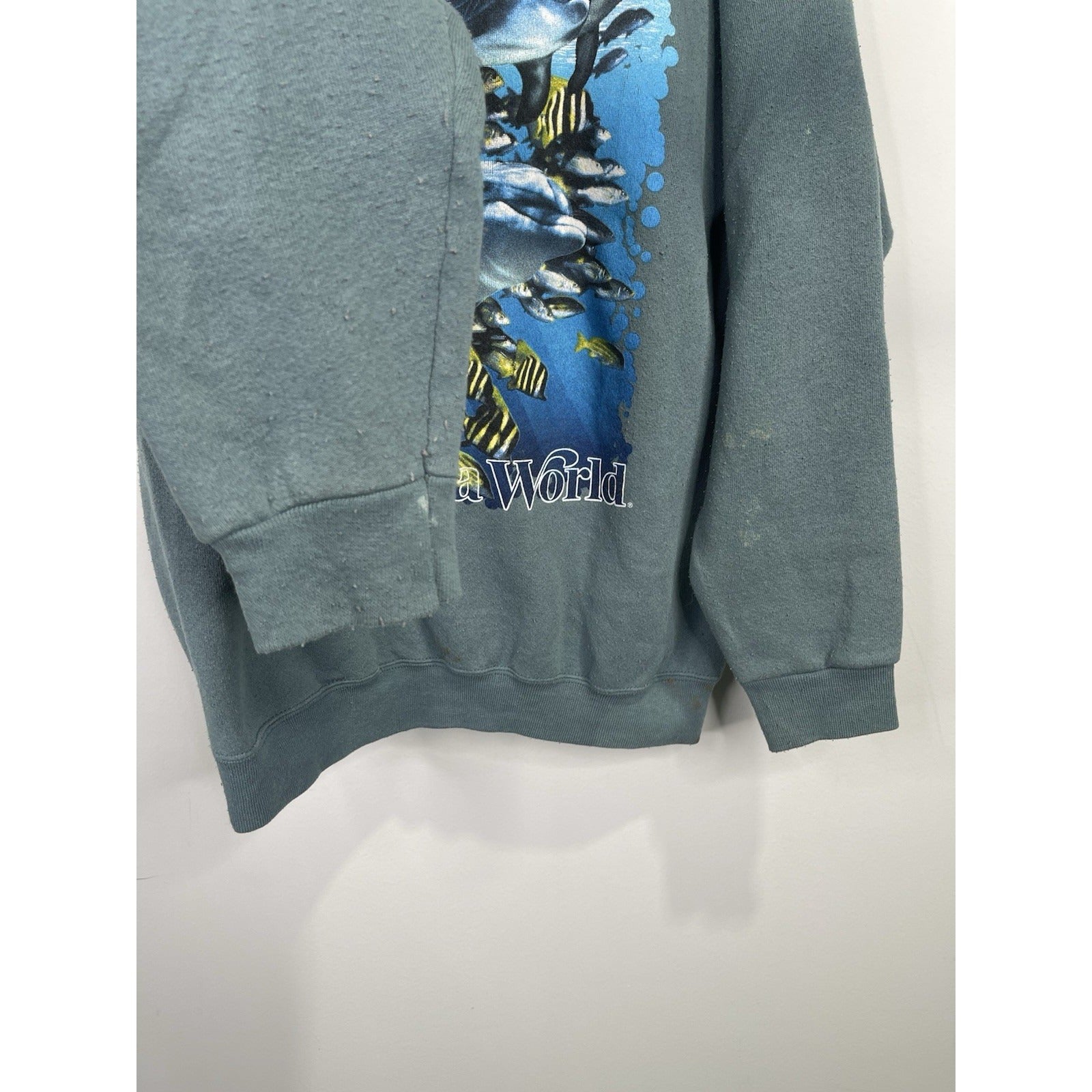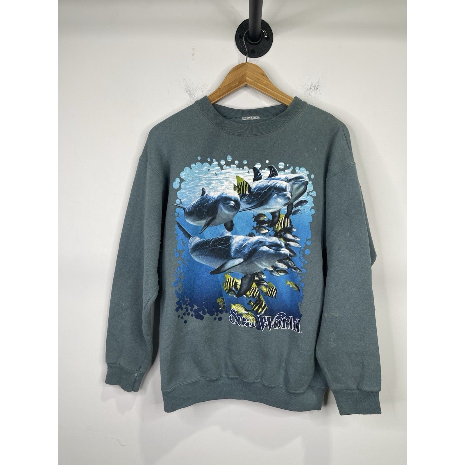 The Men’s VTG Green Seaworld Graphic Dolphin Print Pullover Sweatshirt in size Large is a vintage piece featuring a graphic print of dolphins in a seaworld theme. Made of breathable cotton knit fabric, this sweatshirt is perfect for all seasons and activities like walking. The crew neck and long sleeves add to the comfortable fit, while the logo accents add a touch of nostalgia to the 90s-inspired design.