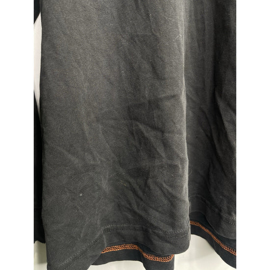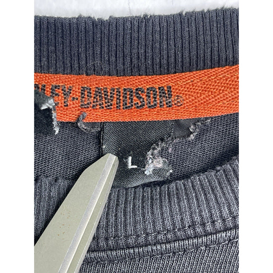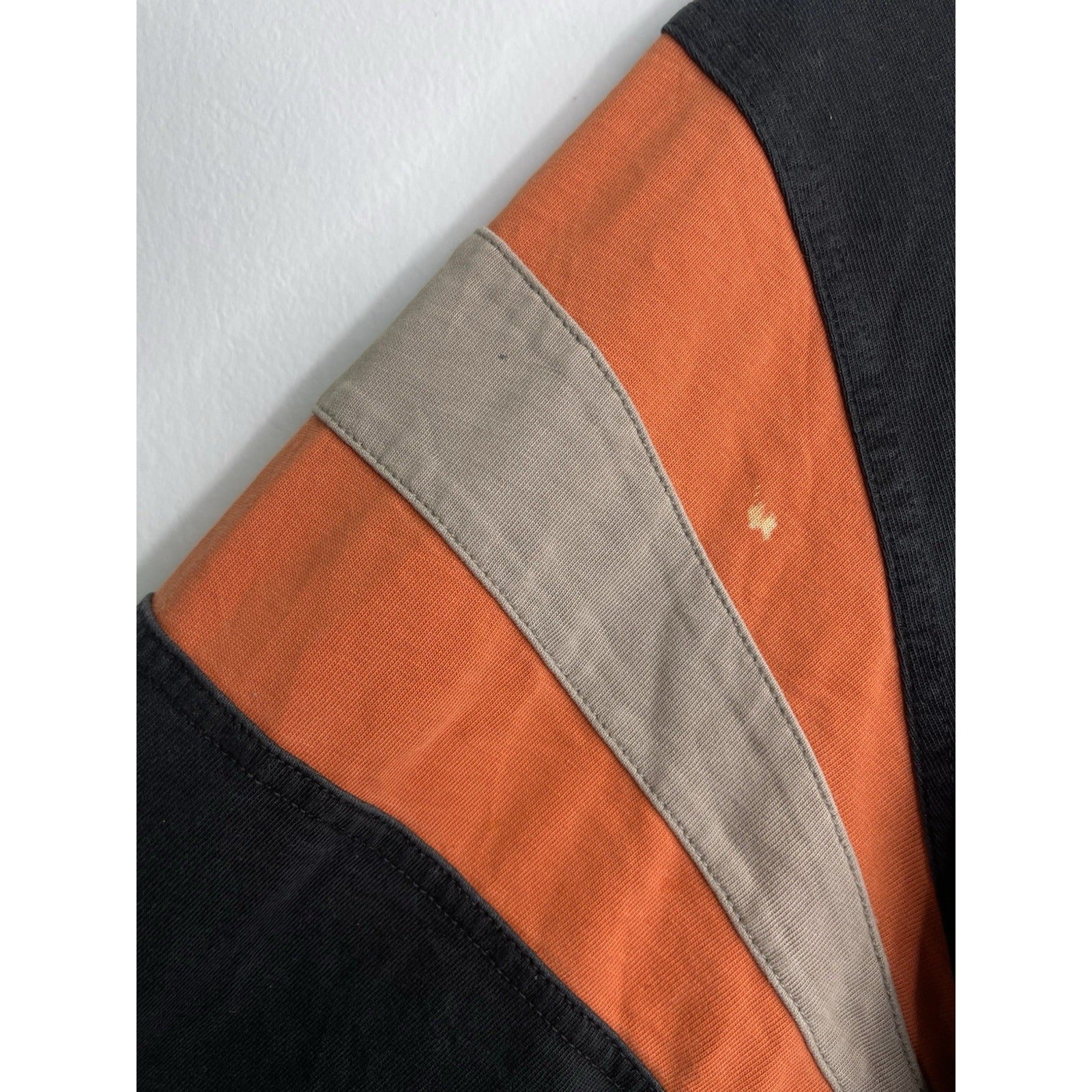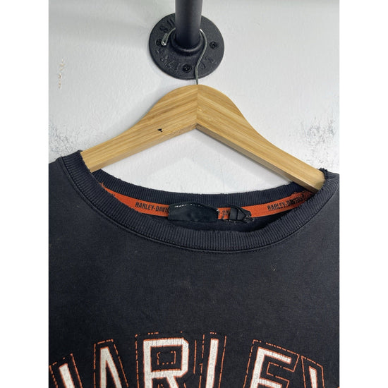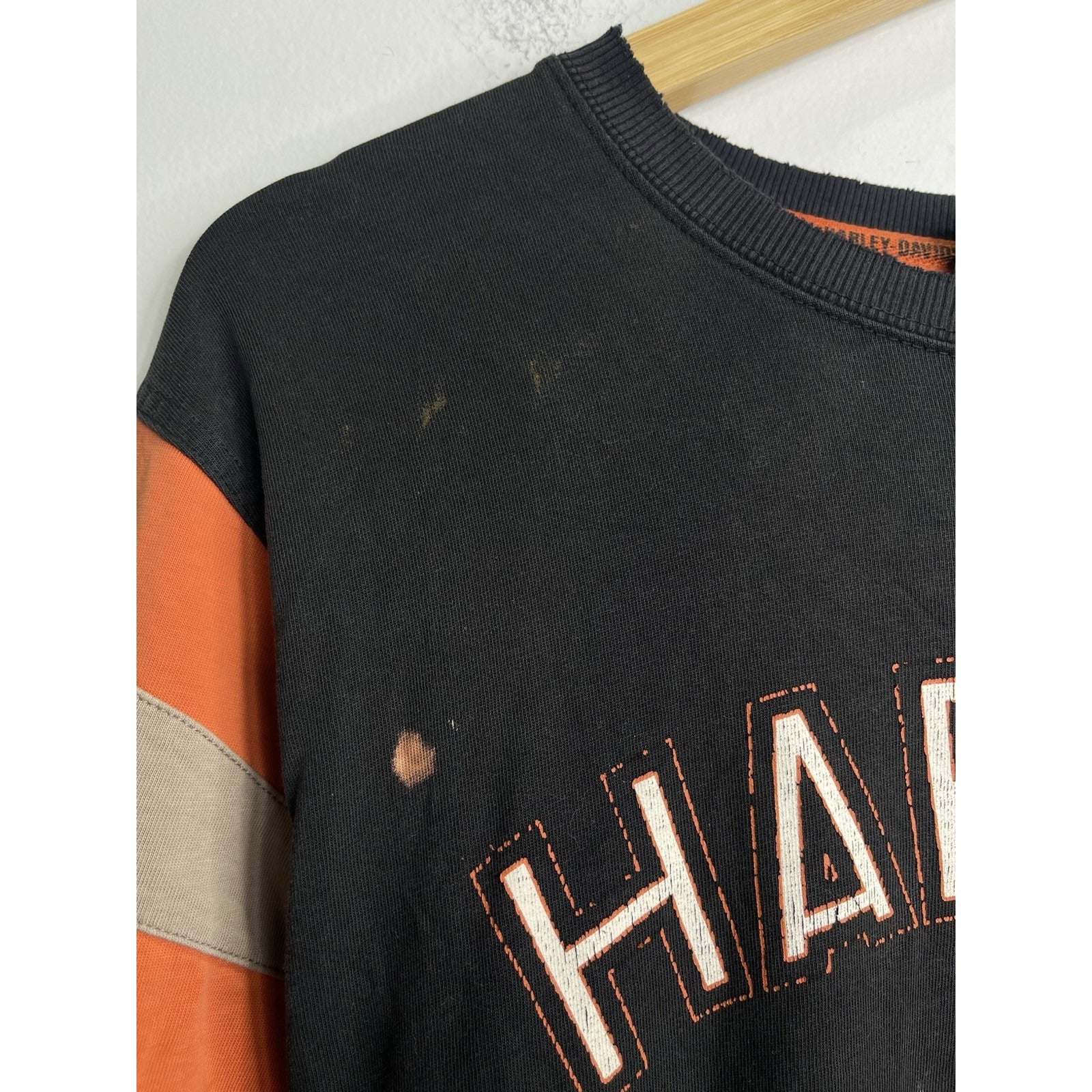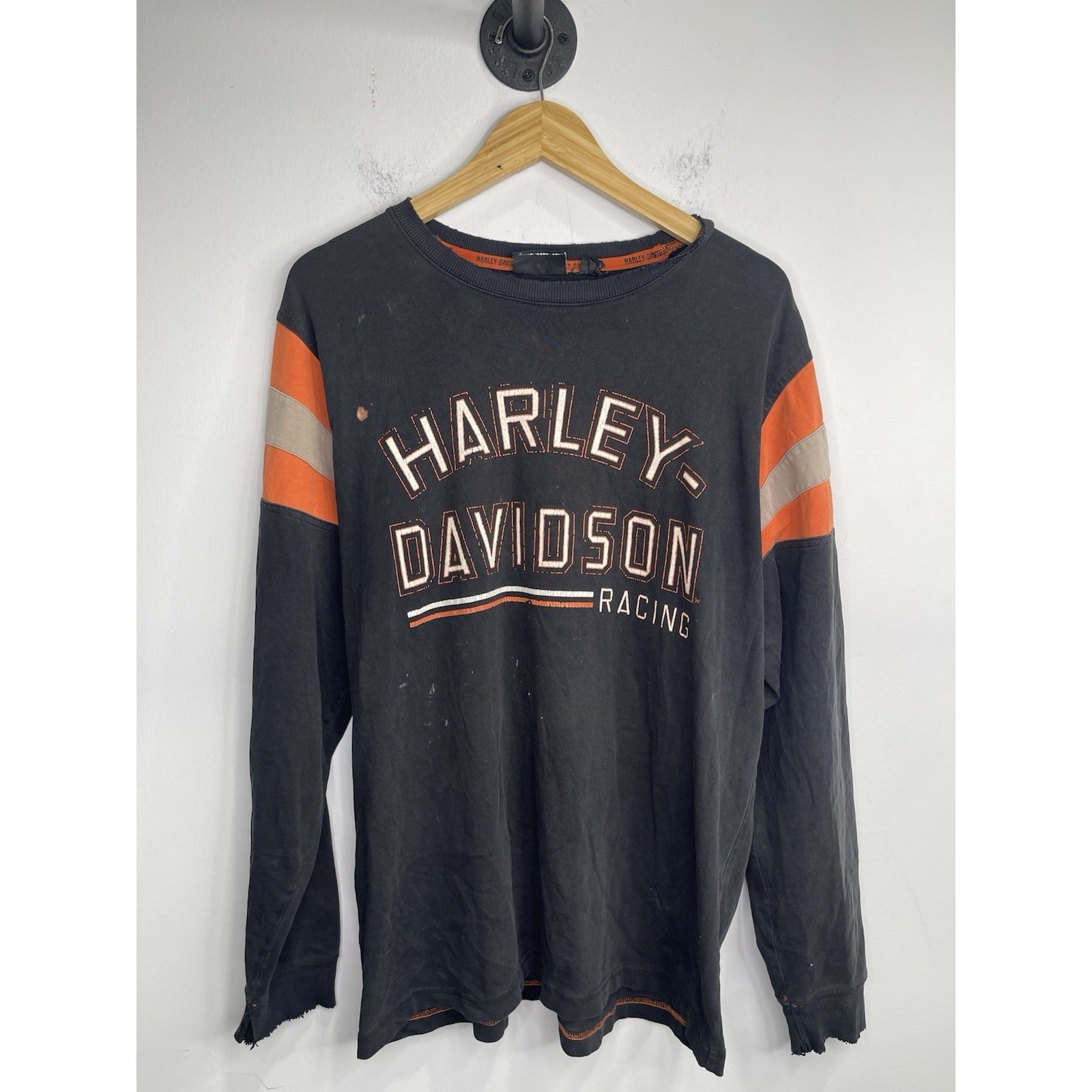 The product is a Men's VTG Harley Davidson Racing T-Shirt in orange with a long sleeve, featuring a graphic print design. It is a size Large with a regular fit and a crew neckline. This vintage shirt is perfect for any season, making it a versatile addition to any man's wardrobe. The Harley Davidson branding adds a touch of classic style and nostalgia to the overall look.
