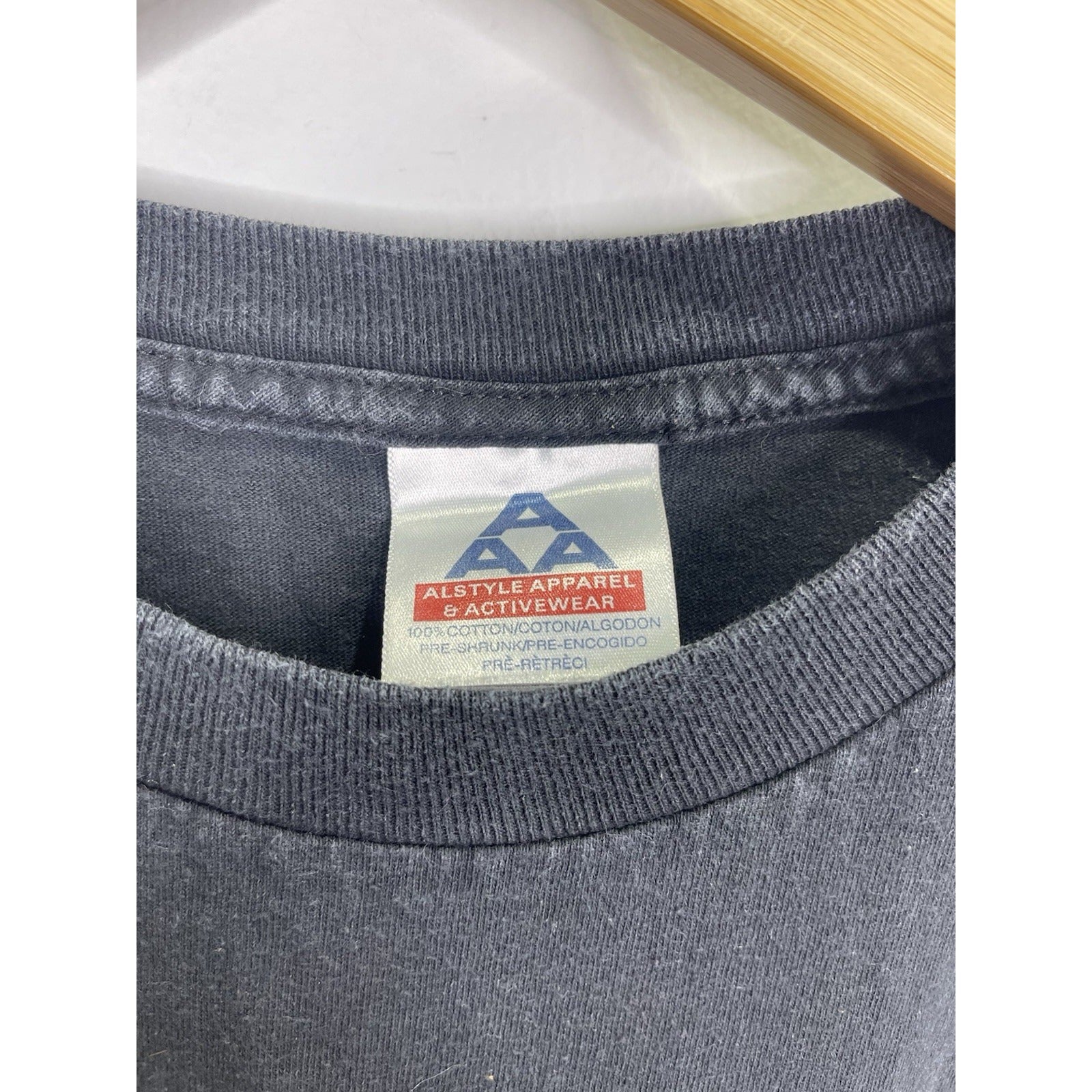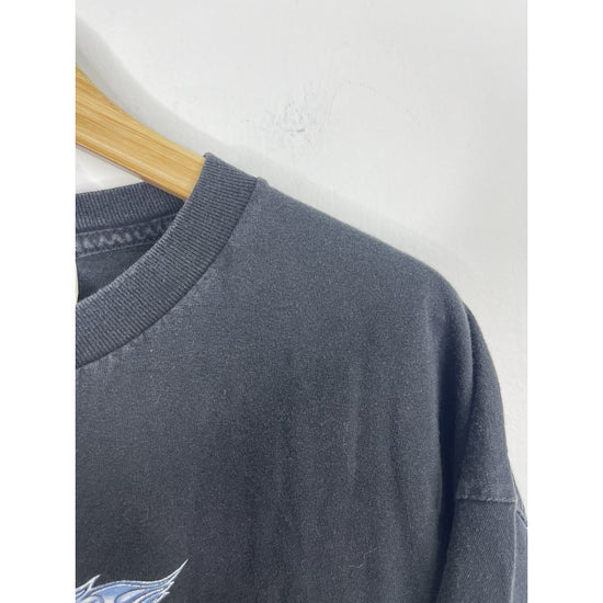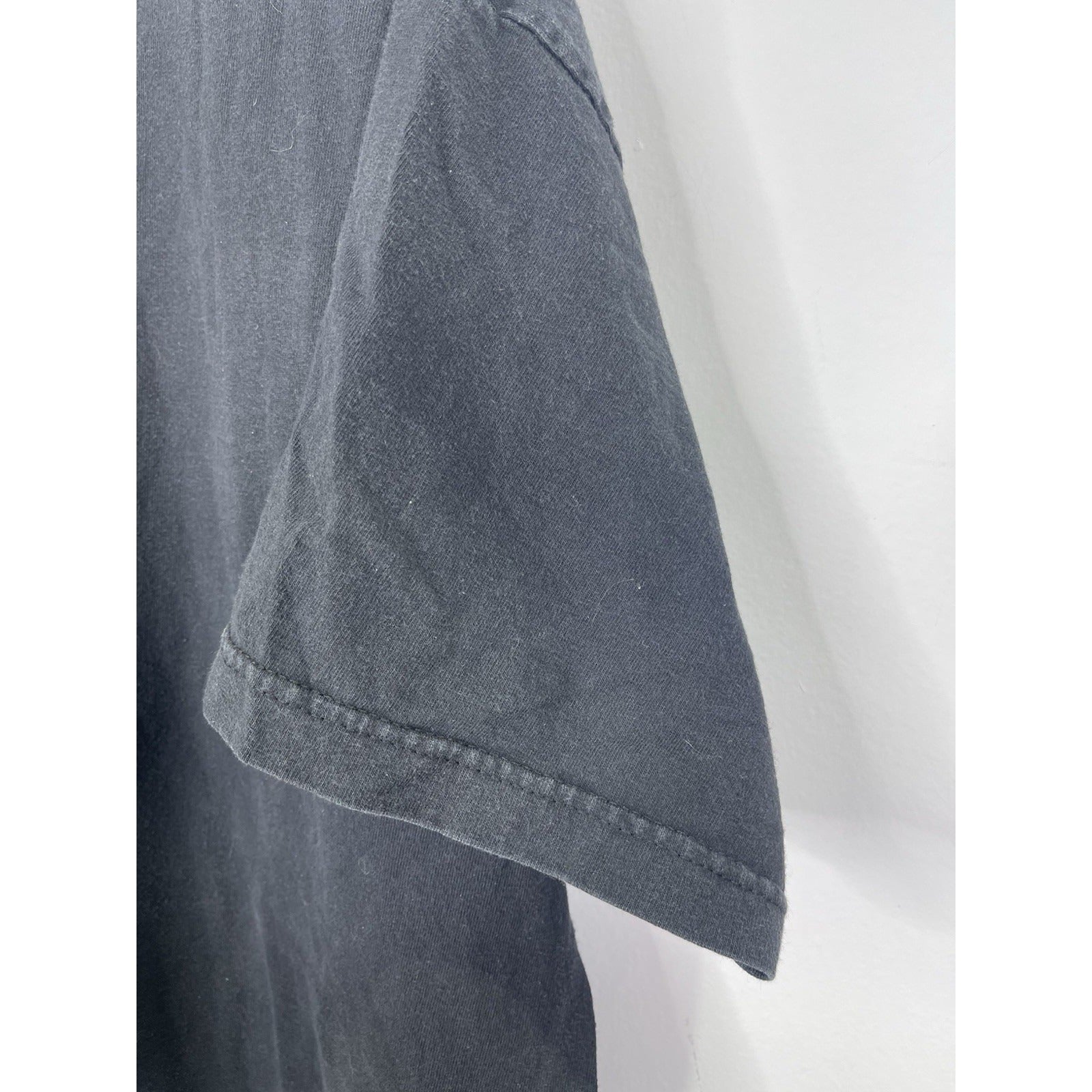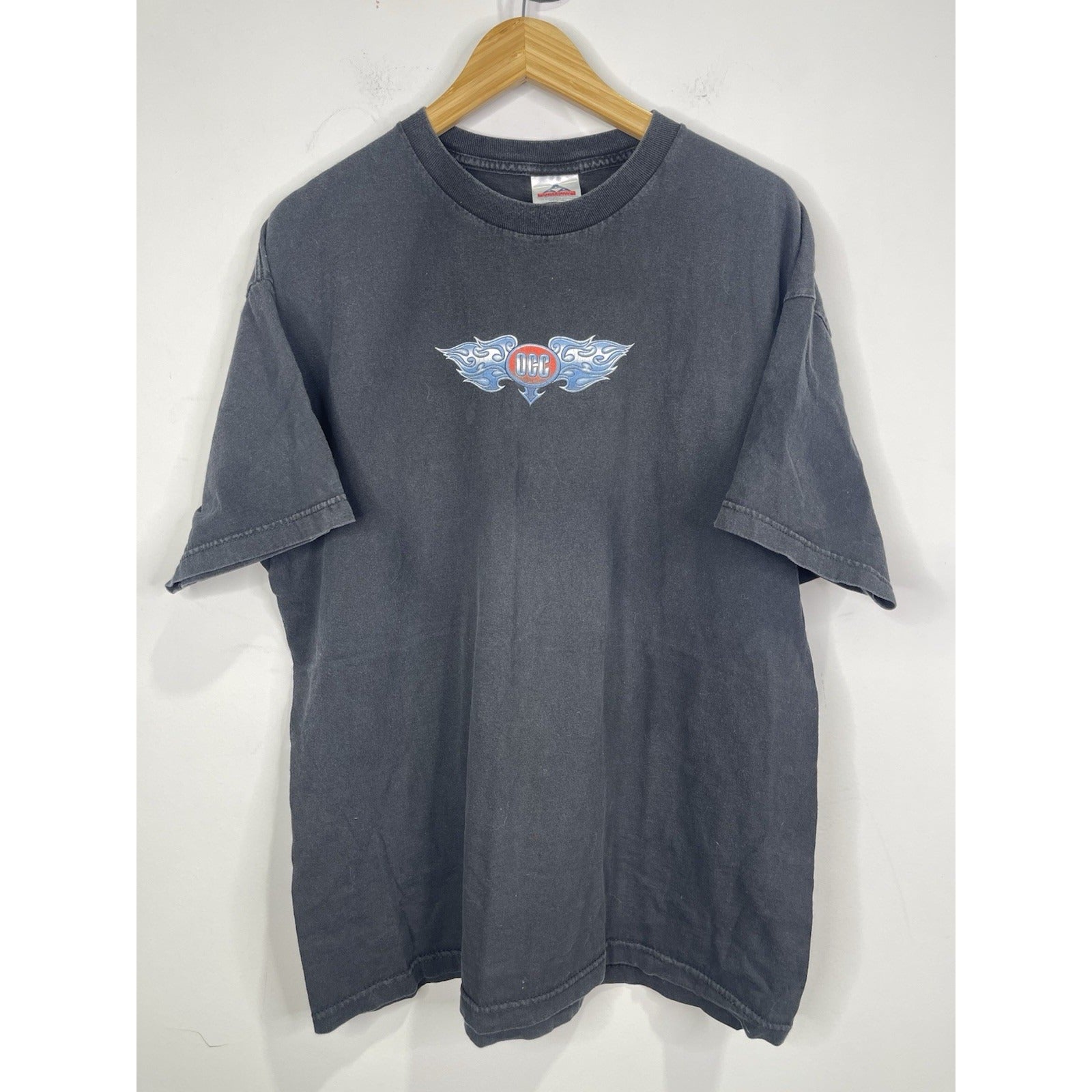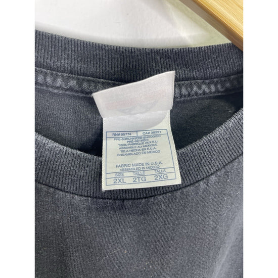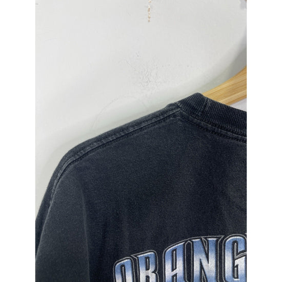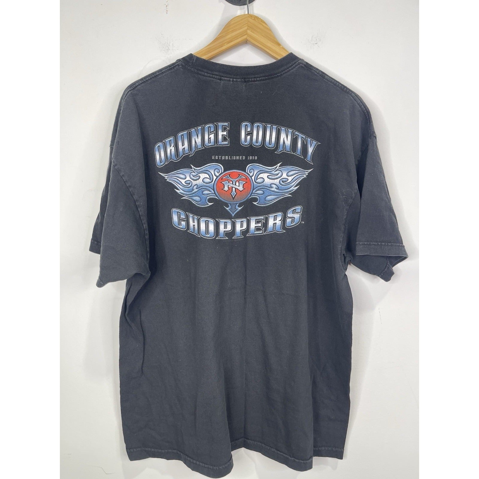 The product is a vintage Men's Orange County Choppers NY double-sided T-shirt in size 2XL. Made of heavy cotton with a black color and crew neck design, this relaxed fit shirt features graphic prints related to biker, motorcycle, and USA themes. Machine washable and part of the brand's collection from the 2000s, this T-shirt is a stylish choice for men who appreciate quality and unique designs.