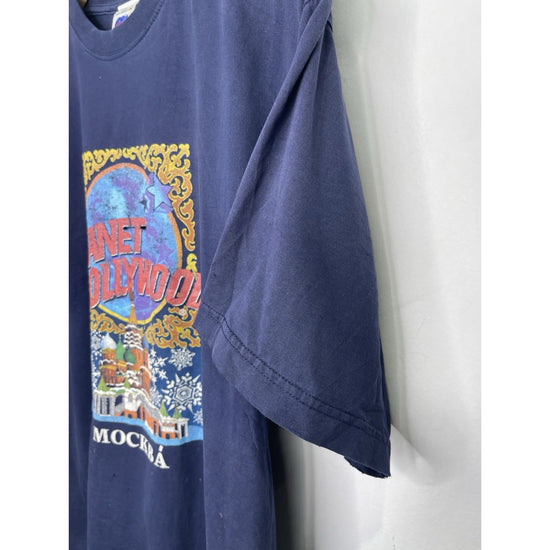 The Men’s VTG Planet Hollywood Moscow T-Shirt in Navy Blue is a vintage USA-made shirt from 1991. This t-shirt features a graphic print of the iconic Planet Hollywood logo, stitch character detail, and a double-sided design. Made of cotton with a regular fit, this crew neck t-shirt is perfect for all seasons. It is a nostalgic piece of men's clothing that celebrates the theme of USA culture and history.