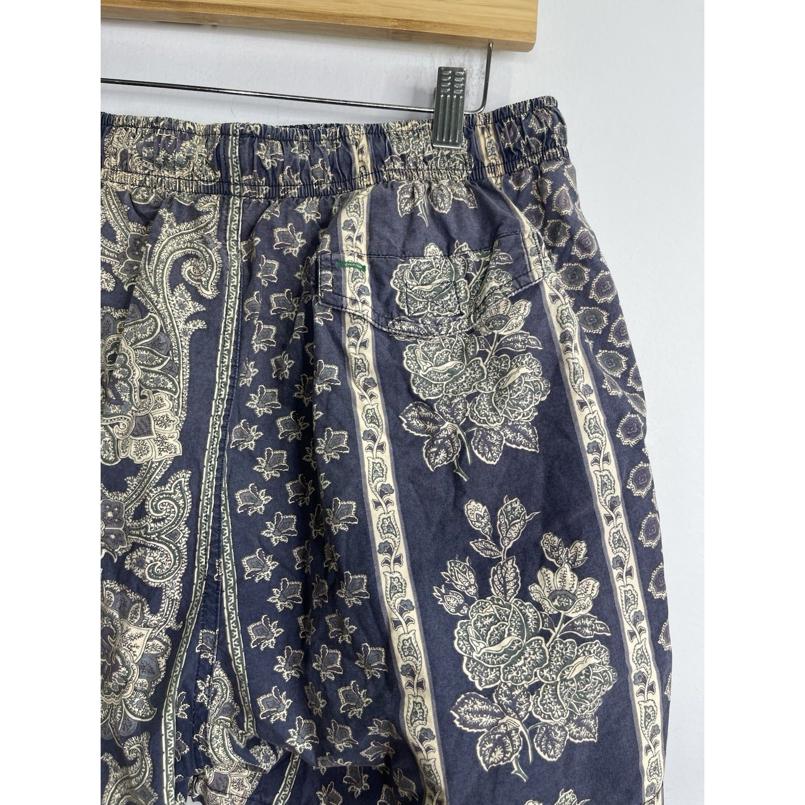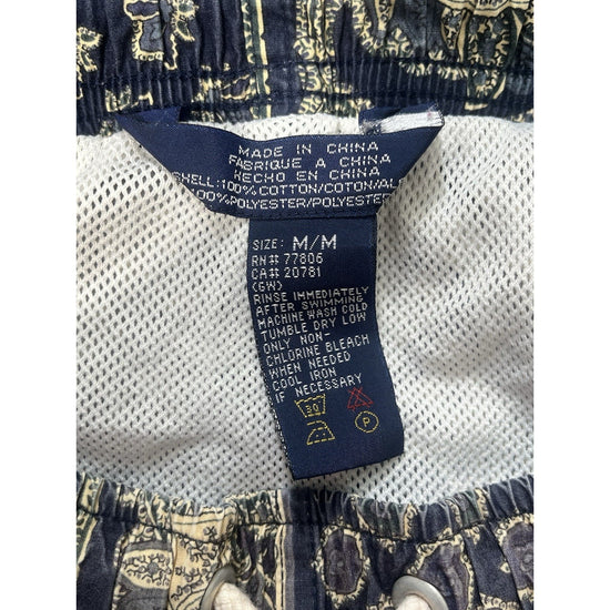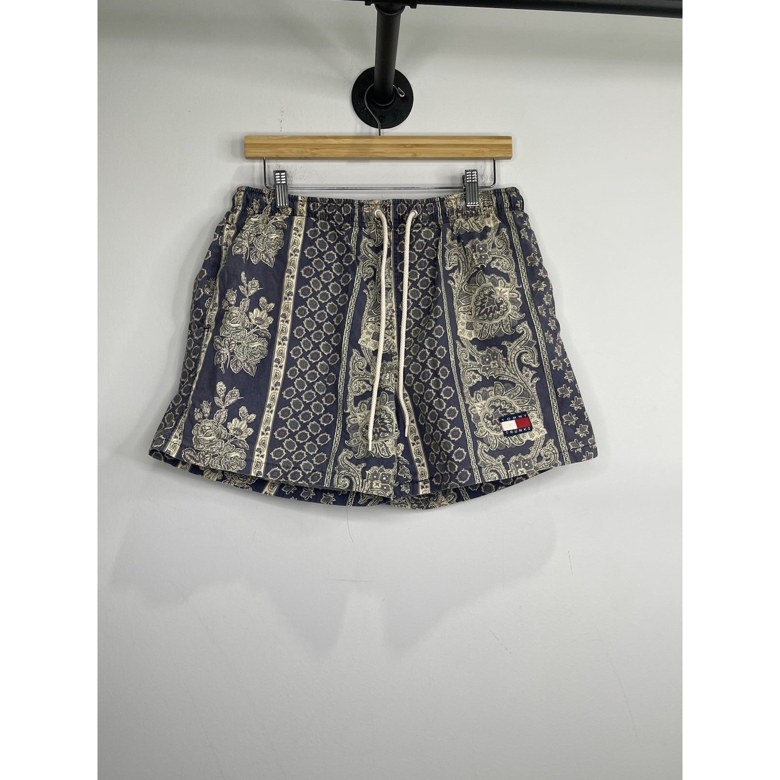 These Men's VTG Tommy Hilfiger Swim Shorts in Blue Paisley are a stylish and comfortable choice for the beach or pool. Made of cotton with a polyester lining, they feature an elastic waistband and pockets for convenience. The drawstring tie adds a customizable fit, while the playful paisley pattern adds a fun and colorful touch. Perfect for outdoor activities like surfing or recreational swimming, these Tommy Hilfiger swim shorts are a 90s-inspired classic that is sure to make a statement.