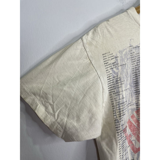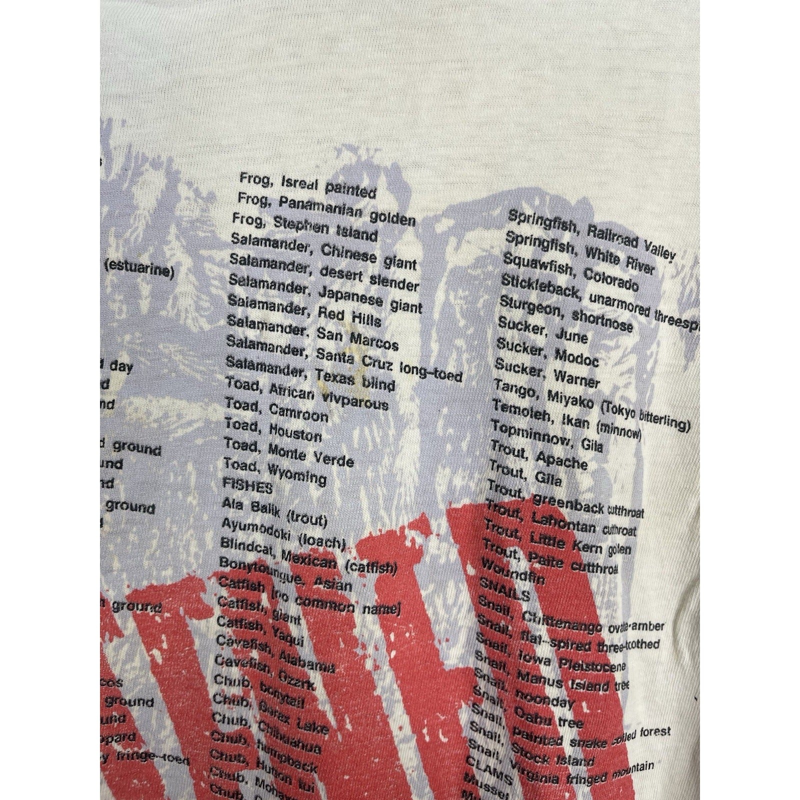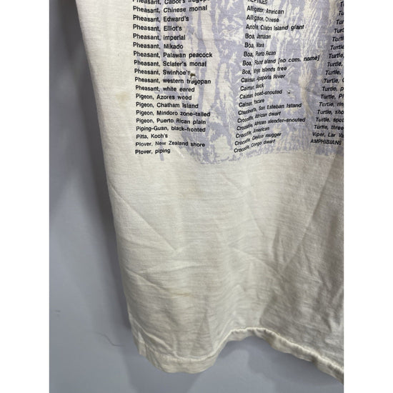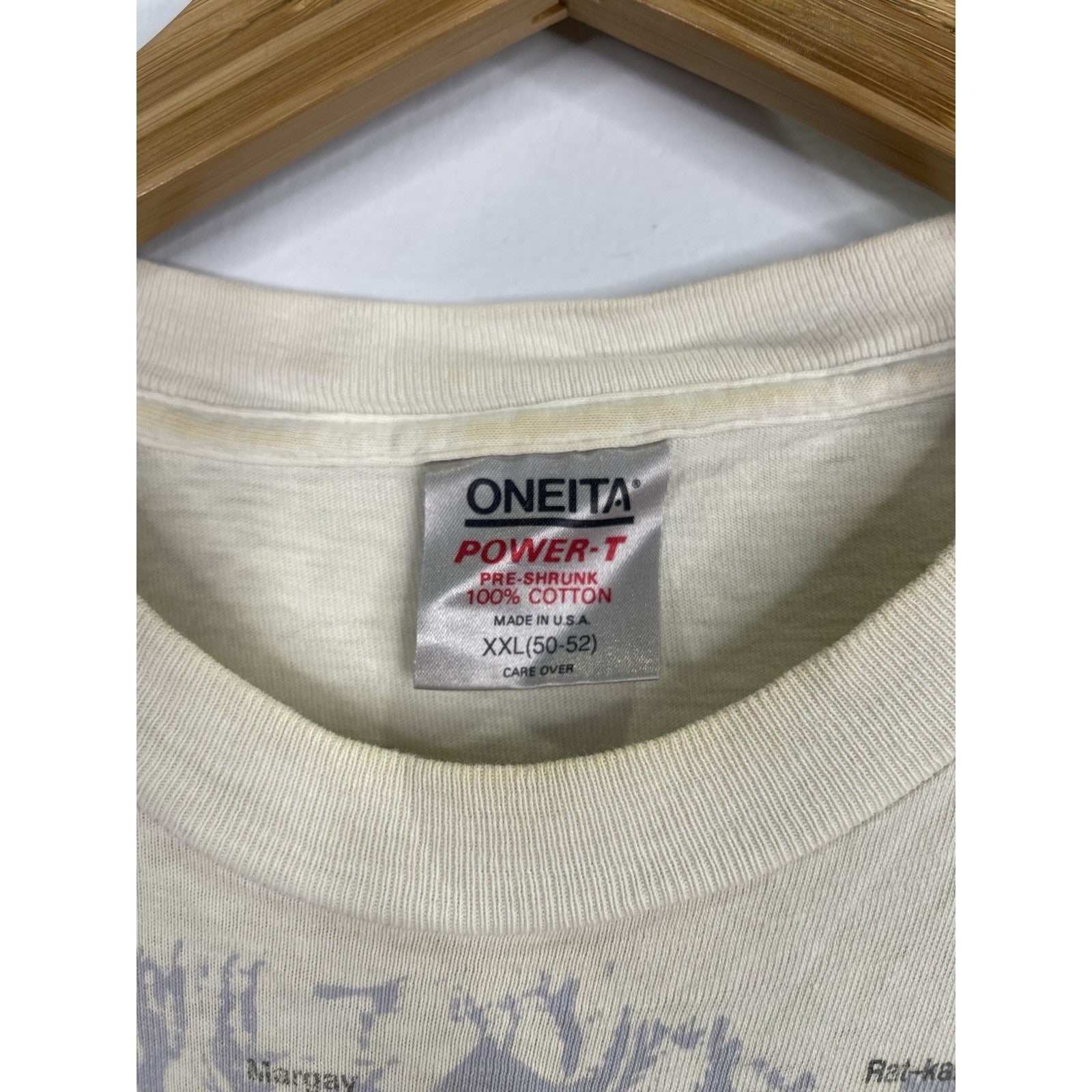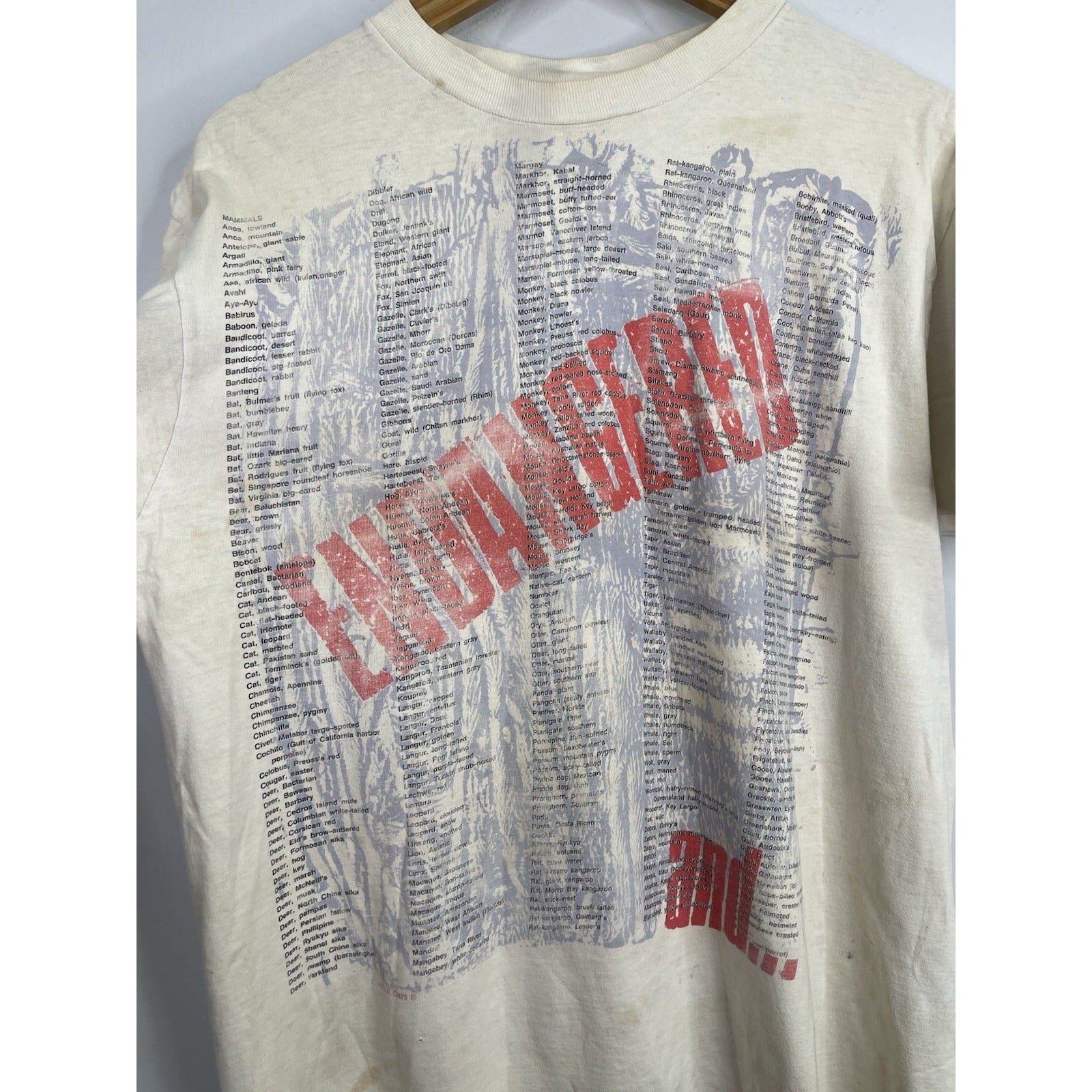 This Men's VTG Wild Oats Endangered And Threatened Animal List T Shirt in size XXL features a graphic print design with a music character theme. Made from cotton, the shirt has a crew neck and short sleeves, offering a regular fit. The vintage design by Oneita adds a unique touch to the white T-shirt, making it a stylish choice for men who appreciate anime-inspired fashion. Perfect for those looking to make a statement with their clothing choices.