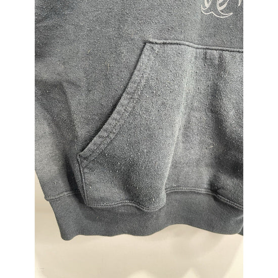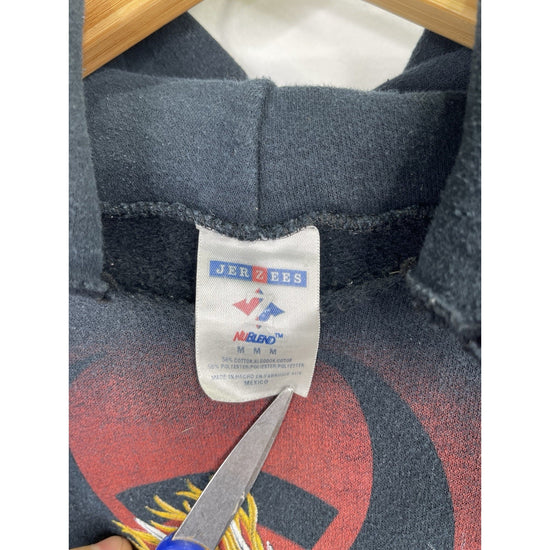 This Men's VTG Y2K Biohazard Dragon Graphic Black Hoodie in size Medium is a vintage piece from the year 2000 featuring a unique biohazard and dragon theme. Made of cotton with long sleeves and a pullover style, this hoodie is perfect for casual wear or various activities such as riding, cross training, basketball, racing, and running & jogging. The black color, graphic print, hooded design, and pockets add to the style and functionality of this iconic piece from the brand JERZEES. Made in Mexico, this hoodie combines retro flair with modern comfort and style.