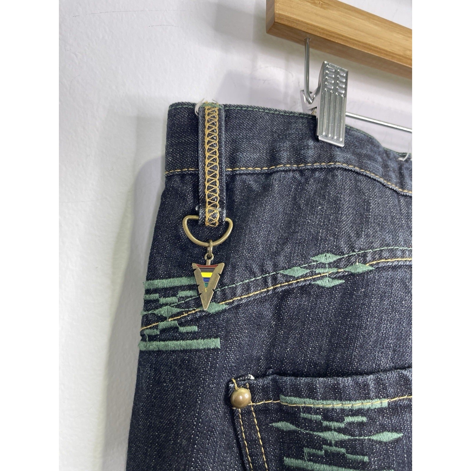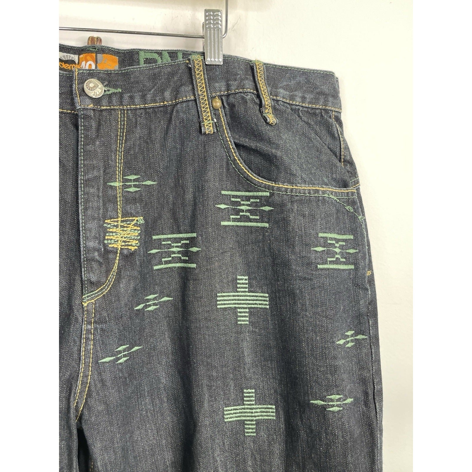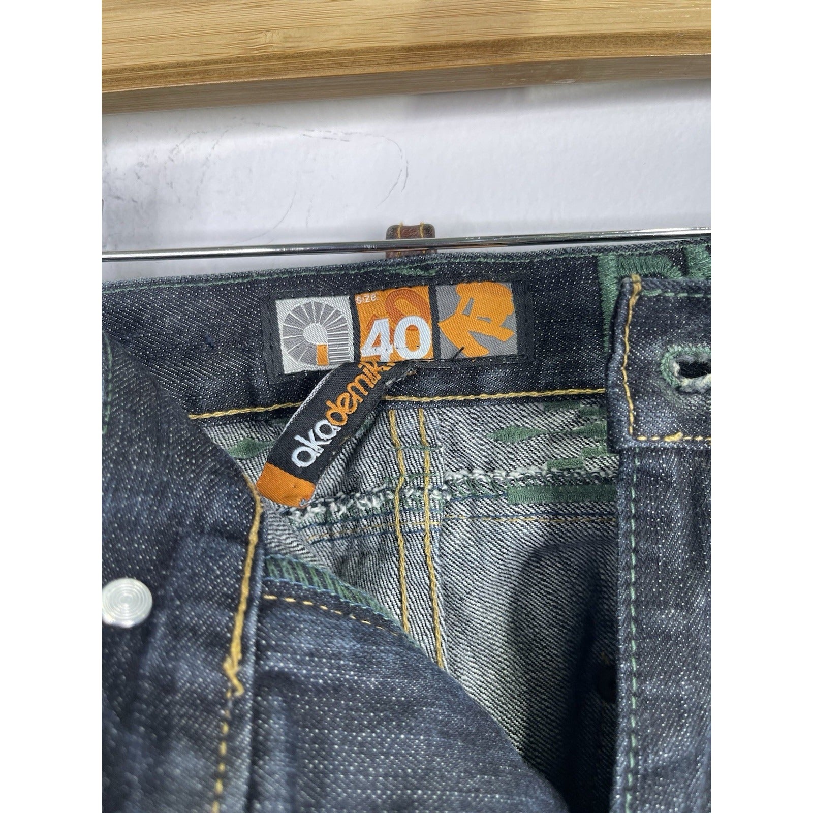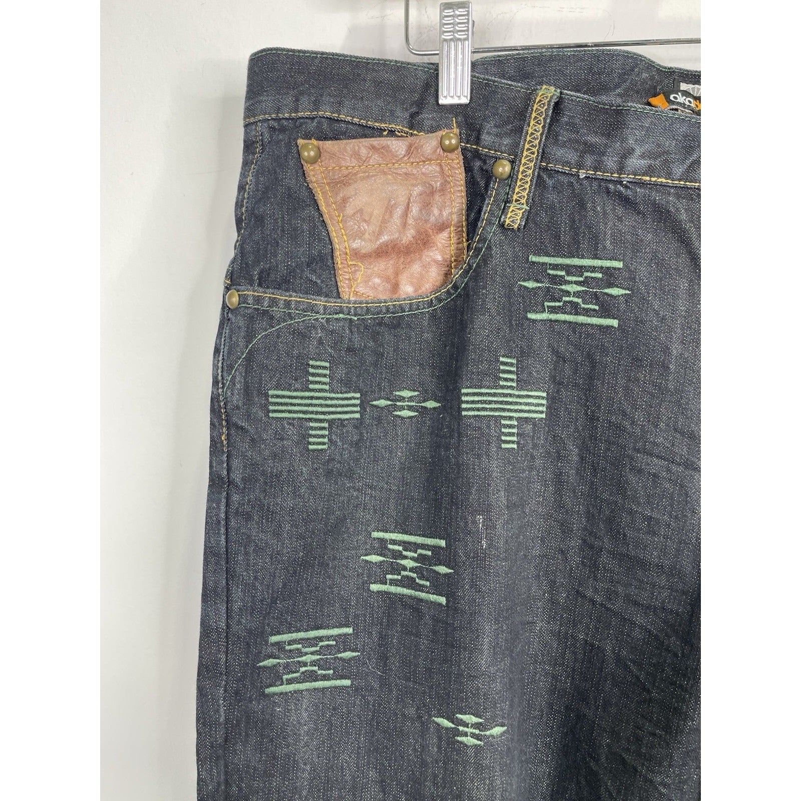 This product is a pair of Men’s Vintage Y2K Streetwear Southwester Fiesta Warrior Baggy Wide Leg Jeans in size 40x37. Made of cotton with a dark fabric wash, these black jeans feature a relaxed fit and zipper accents. The brand is Akademiks, and they are designed for regular size men. The wide leg style gives them a unique and stylish look, perfect for those looking to add a touch of retro flair to their wardrobe.