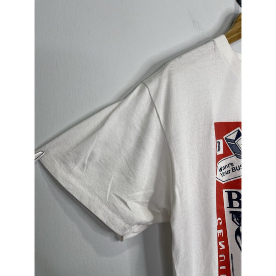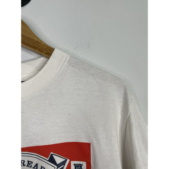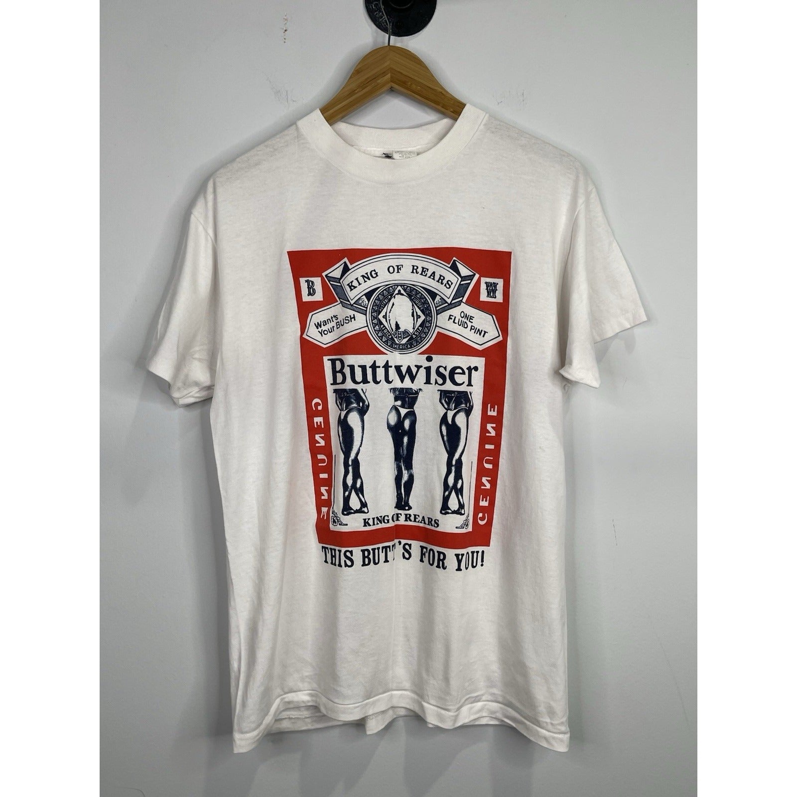 This Men’s White and Red King of Rears Buttwiser Short Sleeve T-Shirt in size Large features a graphic print design on the front. Made from cotton, this regular fit shirt is perfect for summer and is a statement piece for men looking to make a bold fashion statement. Ideal for casual wear, this shirt is comfortable and stylish, showcasing a classic crew neck and short sleeves for a versatile look. Made in the United States, this T-shirt is a must-have for those looking to add a touch of whimsy to their wardrobe.