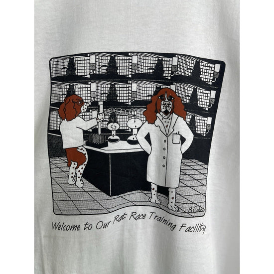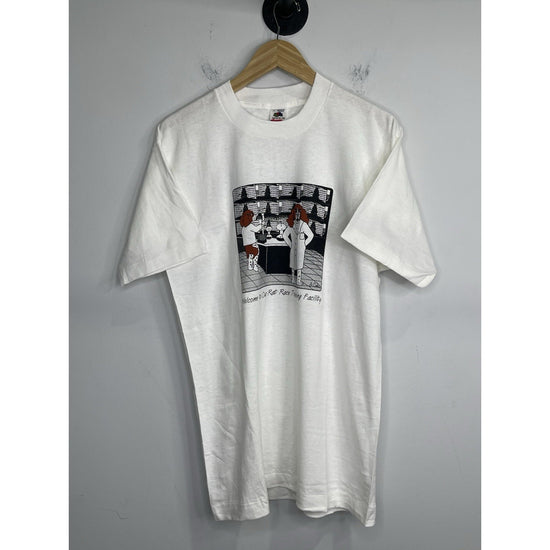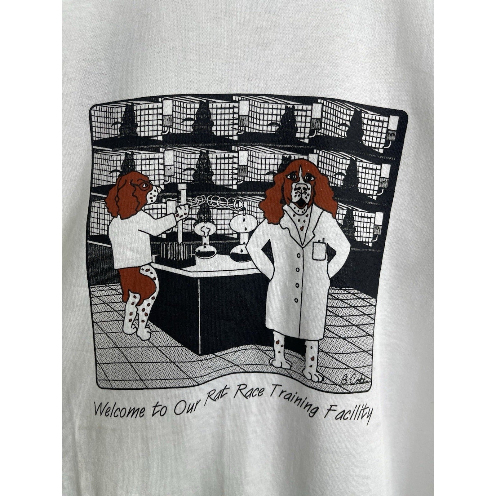 This Men’s White Graphic Design Discovery Rat Race Facility T-Shirt in size L is made from comfortable cotton material with a crew neck and short sleeves, perfect for all seasons. The shirt features a designer graphic print, making it a stylish addition to any man's wardrobe. With a regular fit and breathable properties, this T-shirt from Fruit of the Loom is easy to care for and suitable for everyday wear.