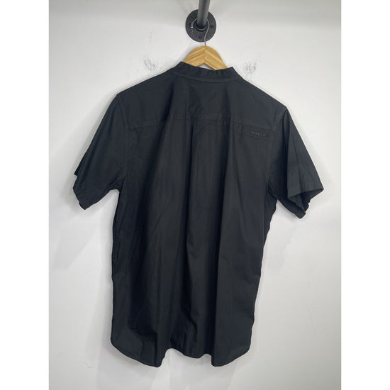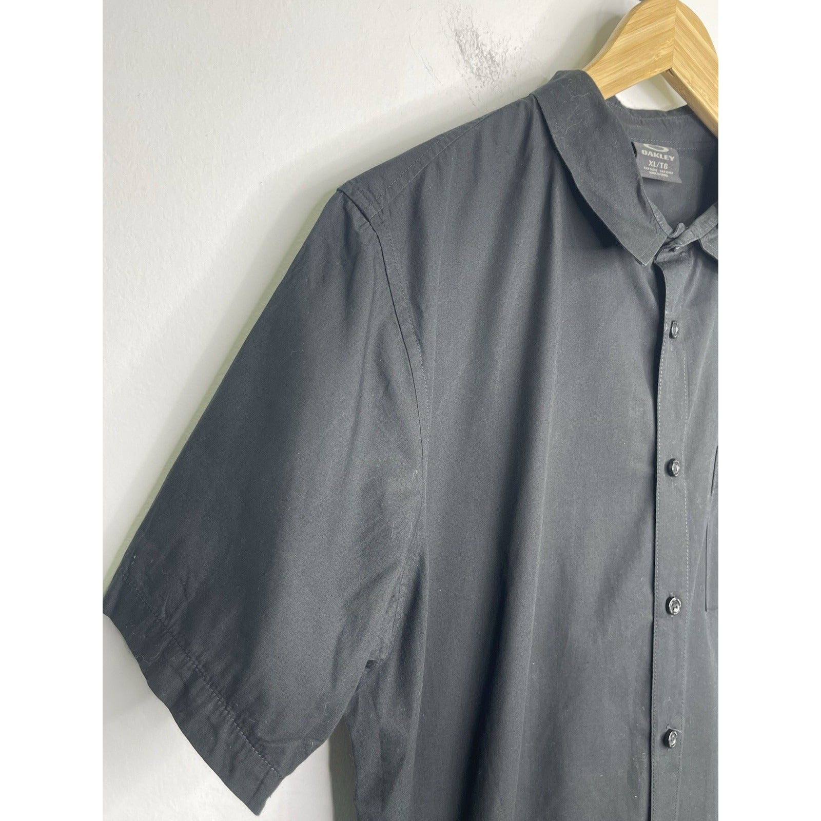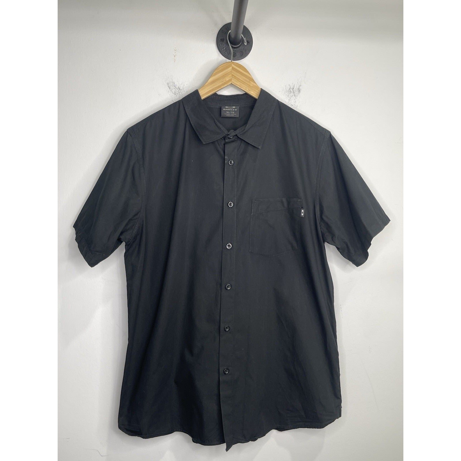 This Men's Oakley Button Up Short Sleeve Shirt in size XL is a stylish and versatile addition to any man's wardrobe. With a classic solid black color and silver metal button accents, this shirt is perfect for casual outings, parties, or even travel. Made from a comfortable blend of polyester and cotton, this lightweight and breathable shirt features a collared neckline, shirt pocket, and 3D metallic Oakley logo for added flair. The vintage-inspired design with a camp collar and classic theme make it a standout choice for the warmer seasons of summer, fall, and spring.