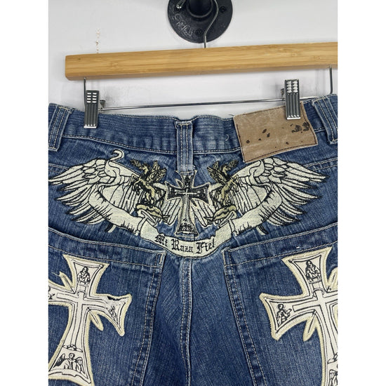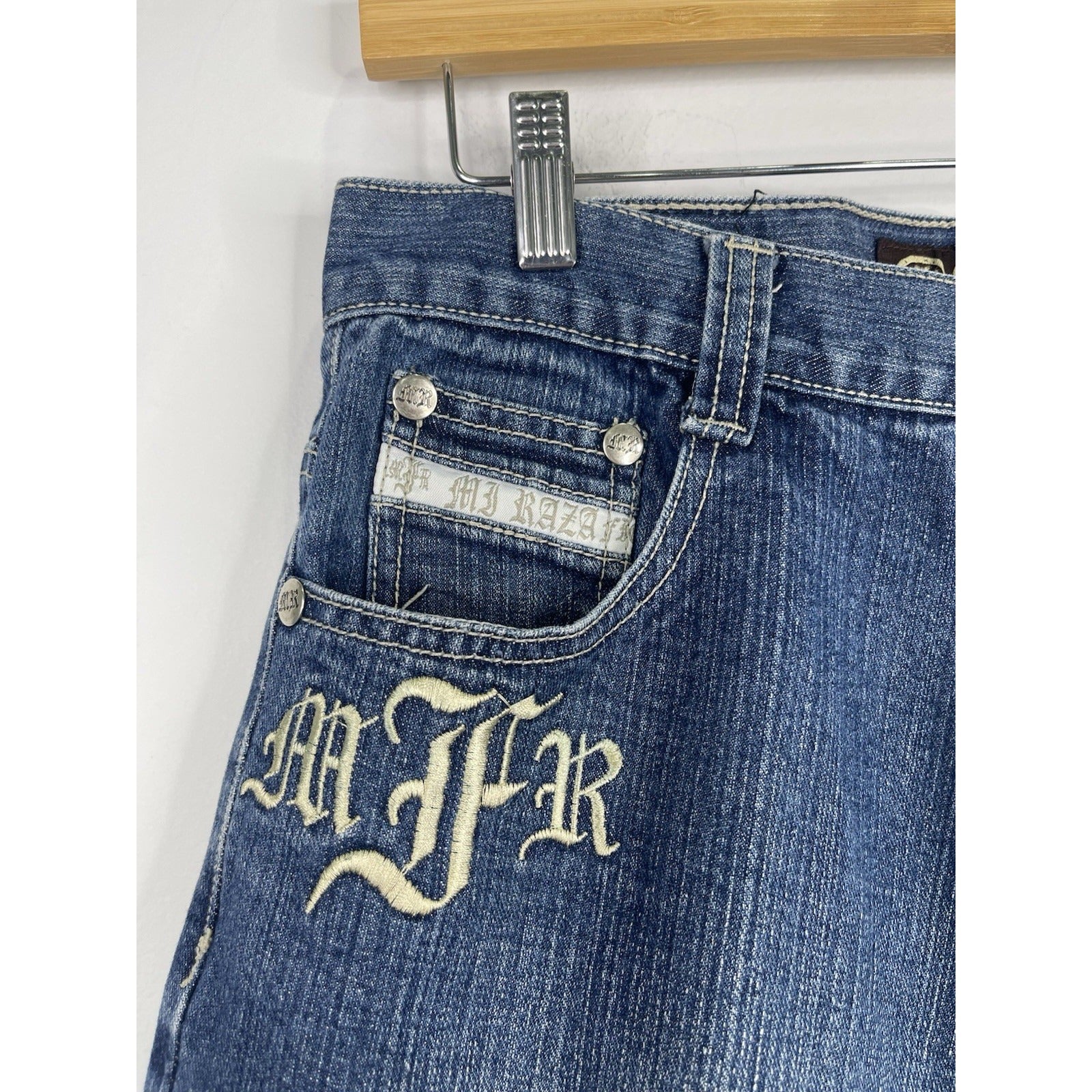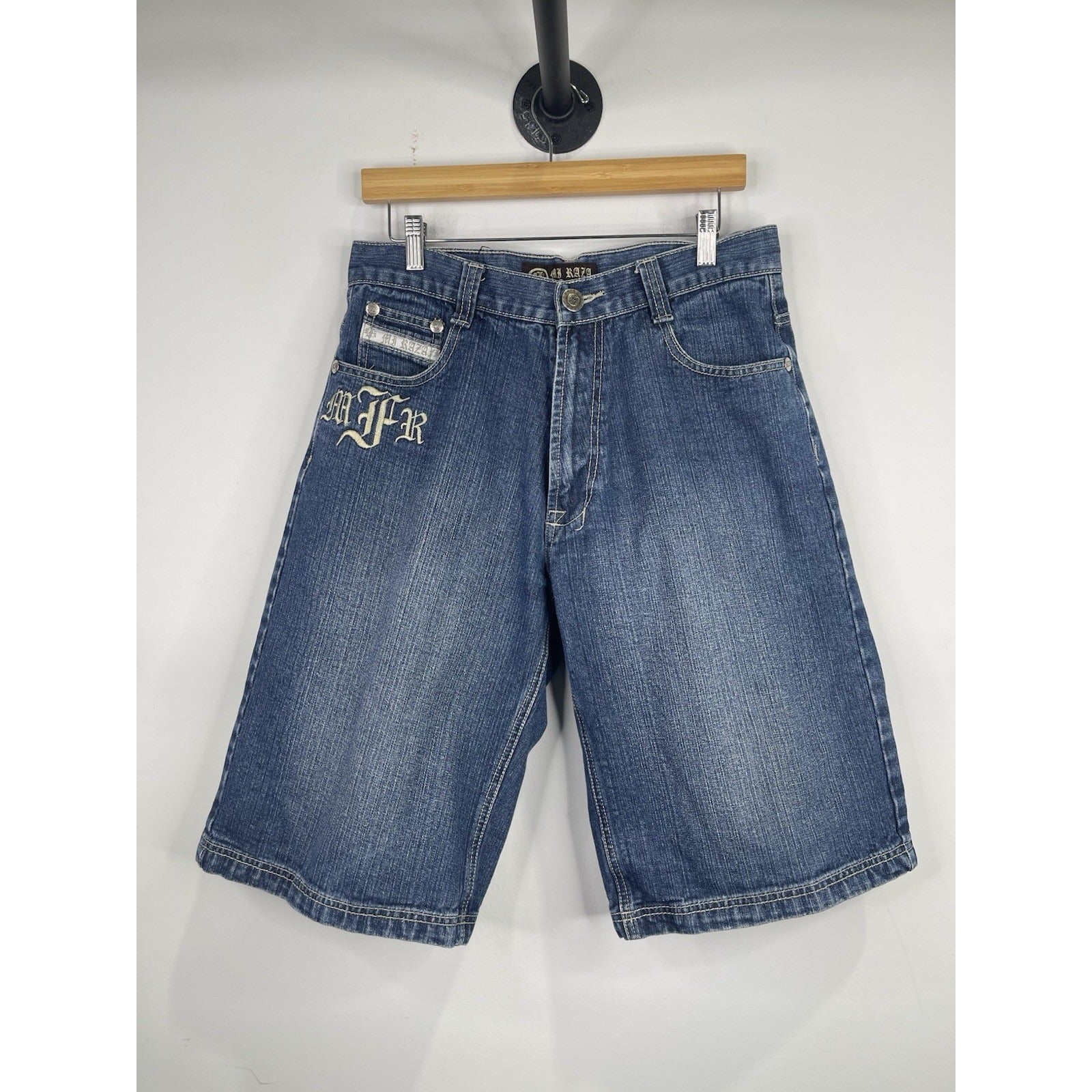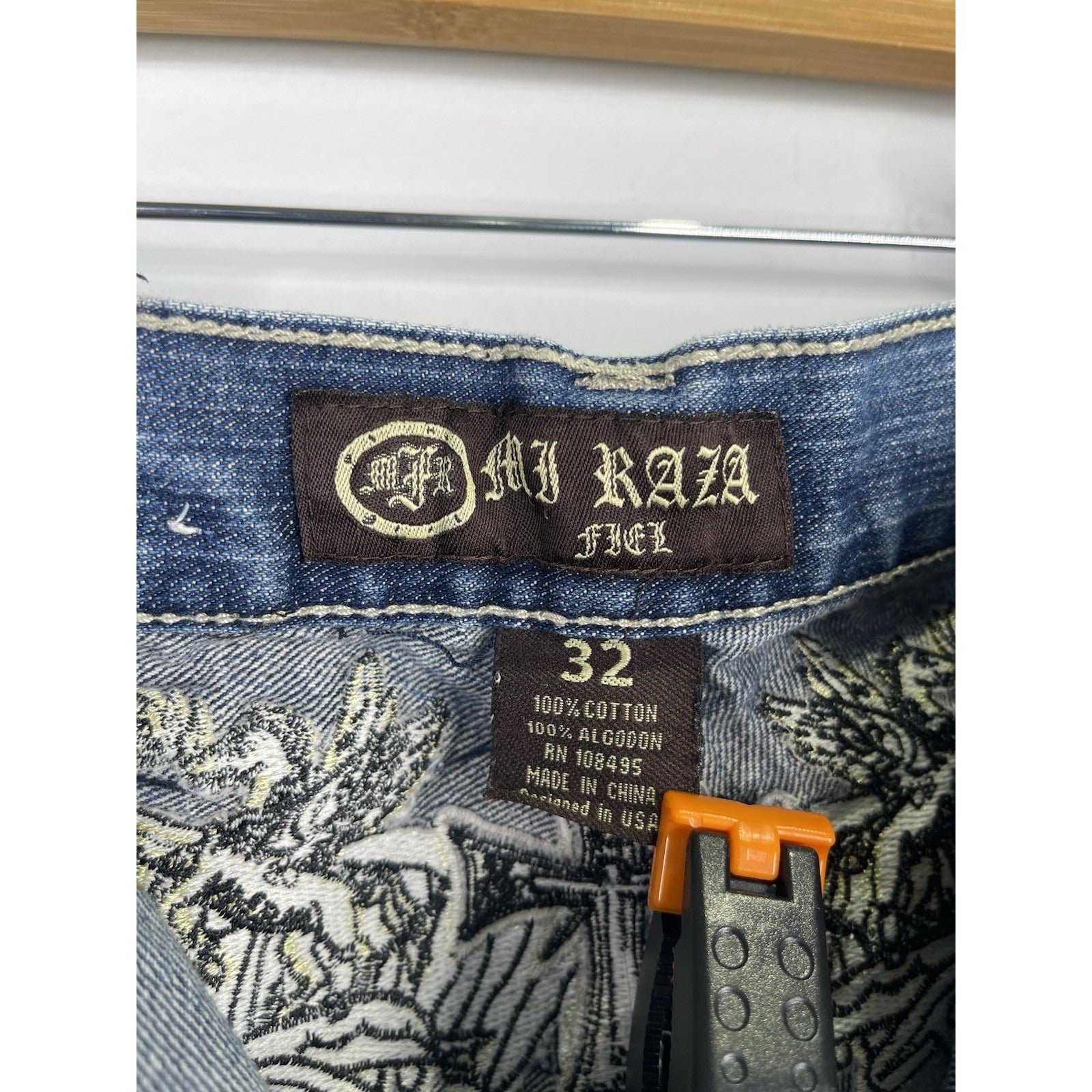 The product is a pair of men's Mi Raza Fiel blue wash jorts with a fully embroidered back design. These Bermuda-style shorts have a solid pattern, zip closure, and are made of cotton denim fabric with a light wash. The embroidered accents add a unique touch, while the regular fit and flat front make them perfect for casual occasions. With a 32-inch waist and 12-inch inseam, these shorts are a stylish choice for those who appreciate grunge and hip hop themes in their clothing.