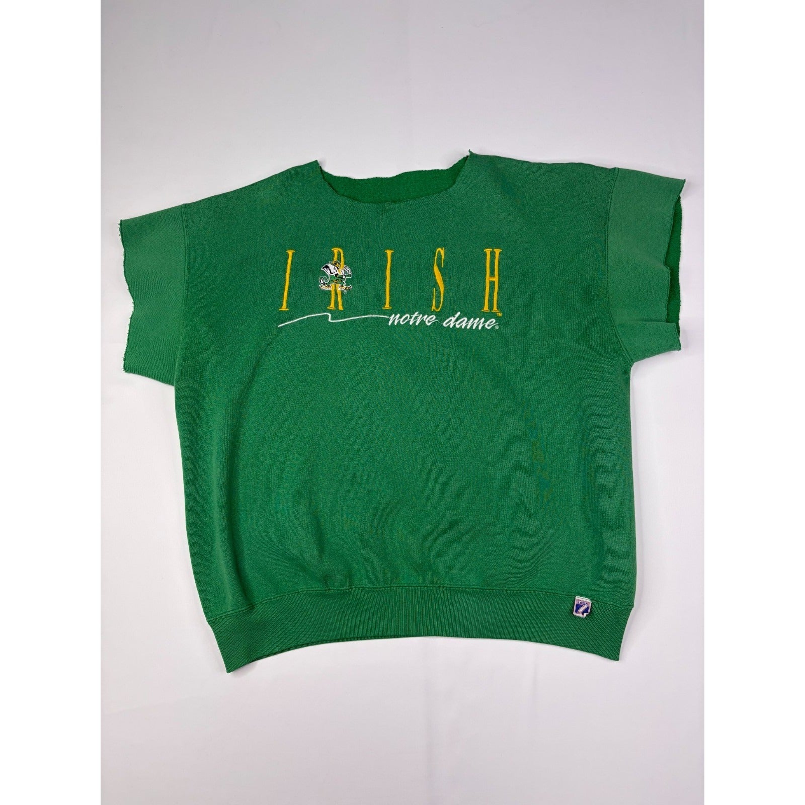 The Men's 90s Notre Dame Sleeveless Collarless Sweatshirt in size XL is a vintage-inspired pullover made from cotton material. This regular fit sweatshirt features long sleeves and is perfect for the winter, fall, and spring seasons. With a 90s theme and personalization option of none, this sweatshirt is a stylish and comfortable addition to any man's wardrobe. Perfect for casual wear or activewear for football enthusiasts, this sweatshirt is sure to make a statement with its sleeveless design and collarless style.