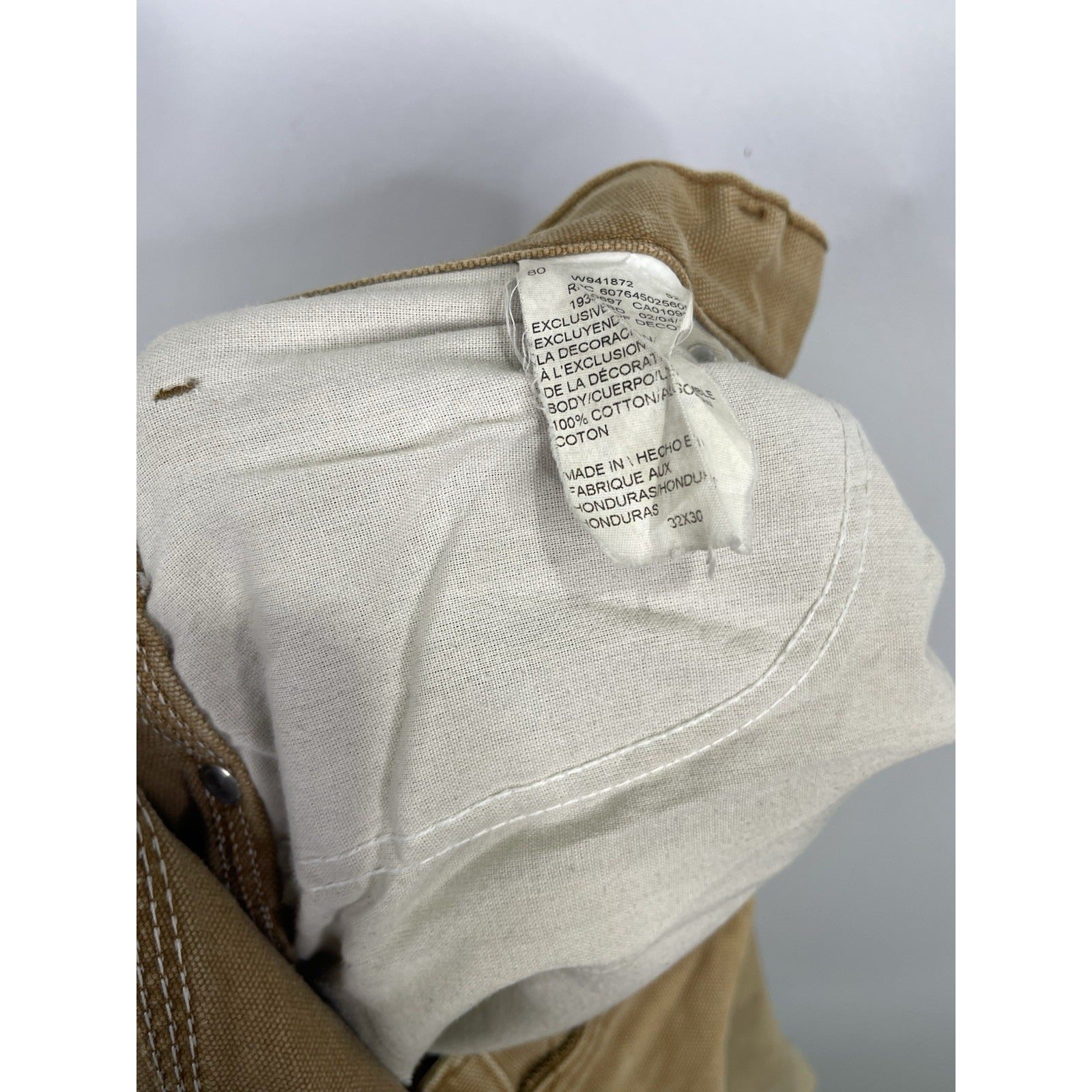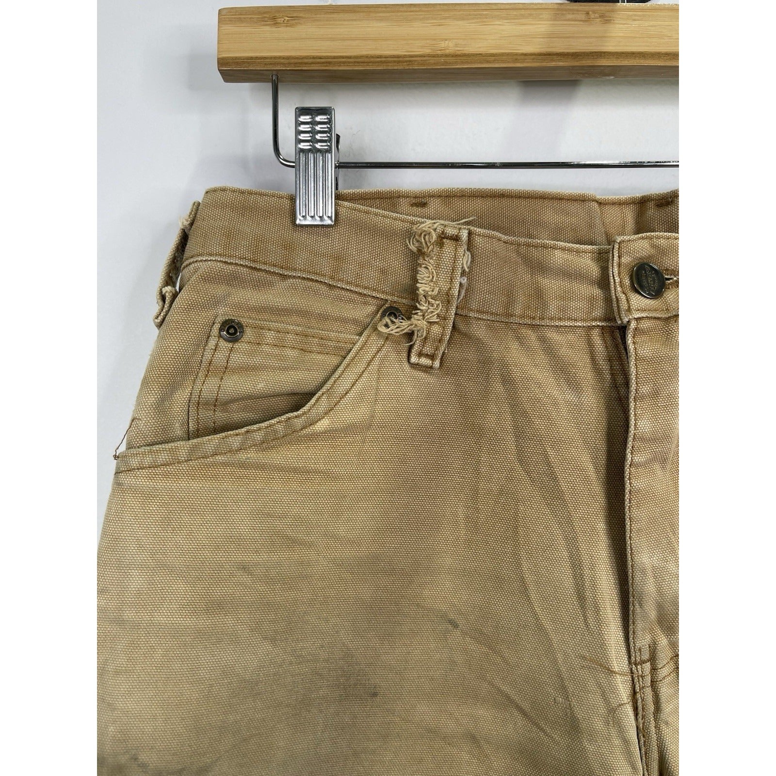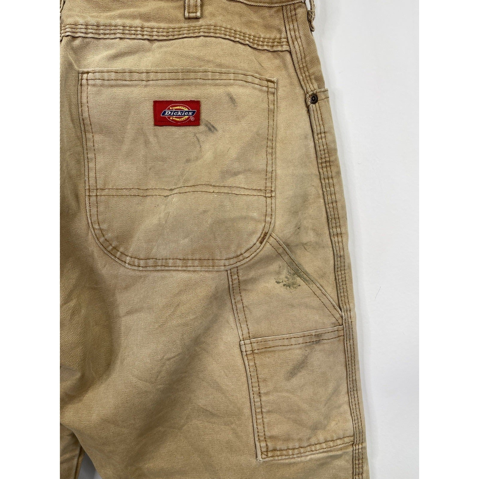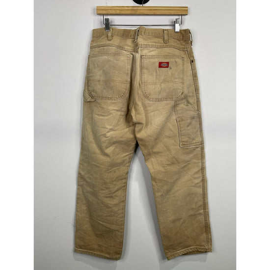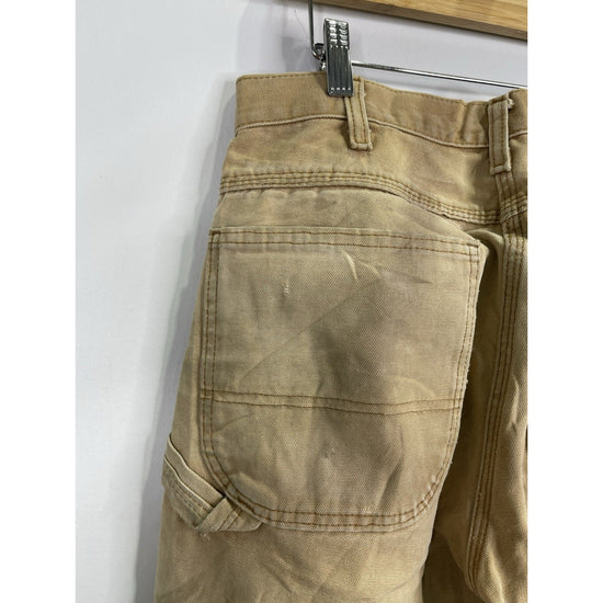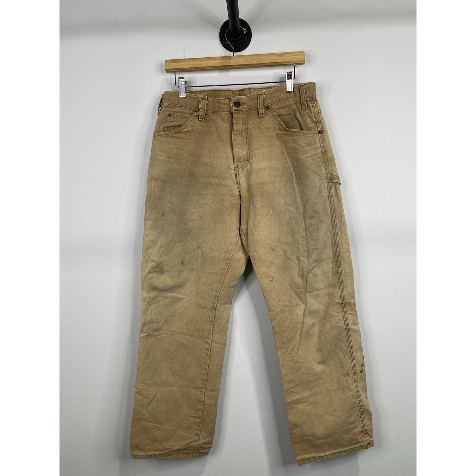 The Mens Dickies Khaki Carpenter Work Pants 32x30 are durable and reliable workwear made of cotton canvas fabric. With a regular fit and straight leg style, these pants feature a flat front design with a zipper and button closure. They are perfect for work situations and have a classic brown color, making them versatile for various occasions. The pants also include pockets for added functionality, making them a practical and stylish choice for men looking for quality workwear.