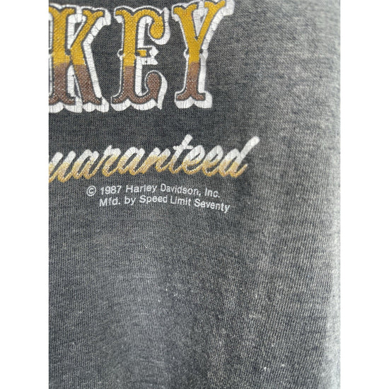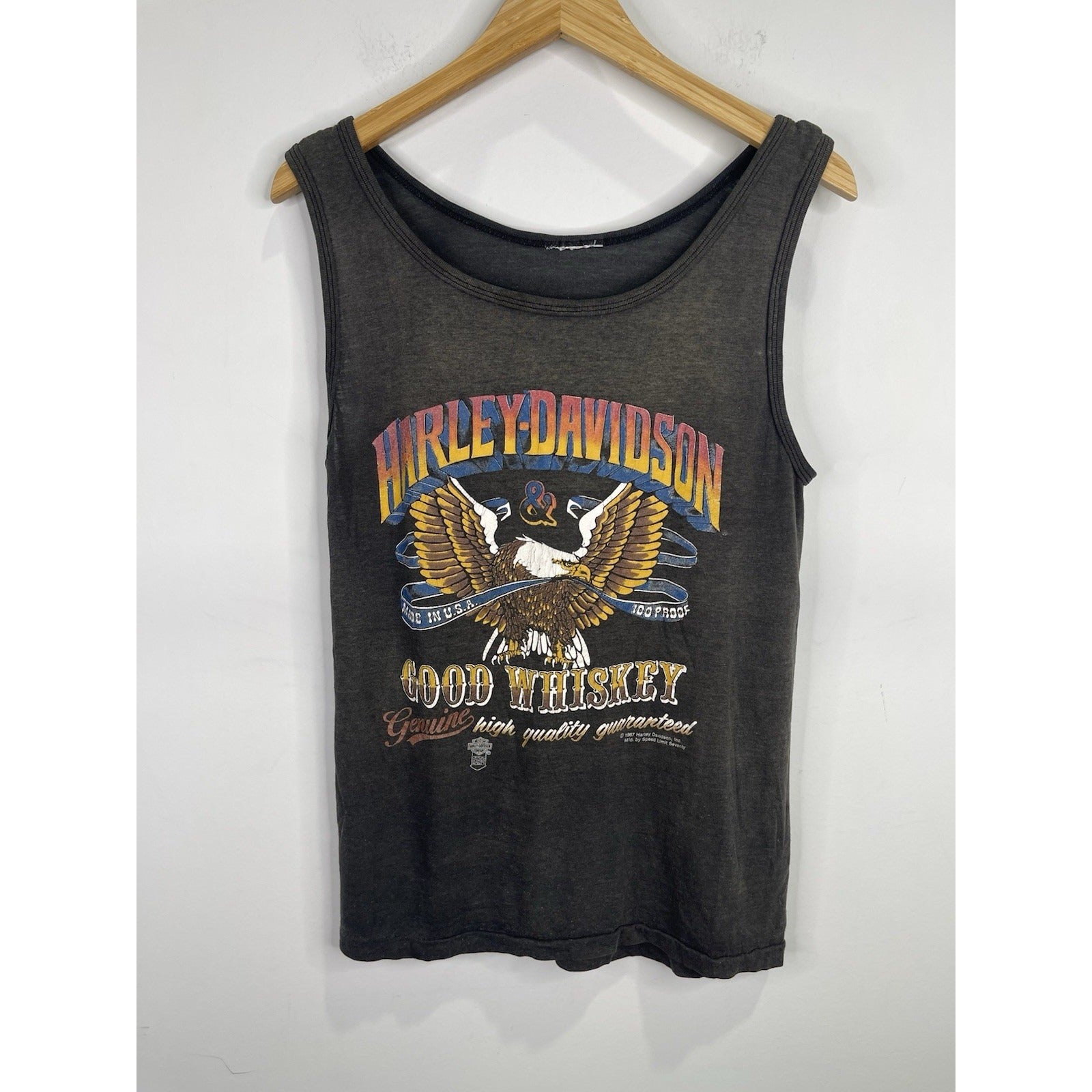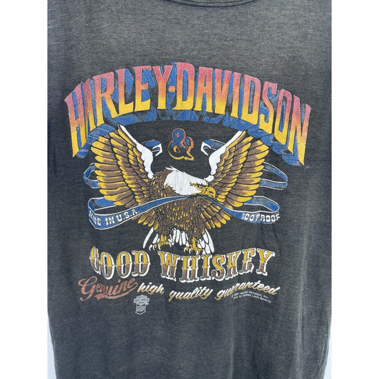 This product is a men's vintage 80s Harley Davidson Motorcycle USA whiskey eagle tank top in size M. Made of cotton, this sleeveless top features a round neck and a relaxed fit. The graphic print design in black and white embodies the motorcycle theme, with the iconic Harley-Davidson brand adding a touch of Americana flair. Perfect for all seasons and with breathable material, this tank top is a stylish and comfortable addition to any man's wardrobe. Made in the United States, this top captures the essence of classic motorcycle culture.