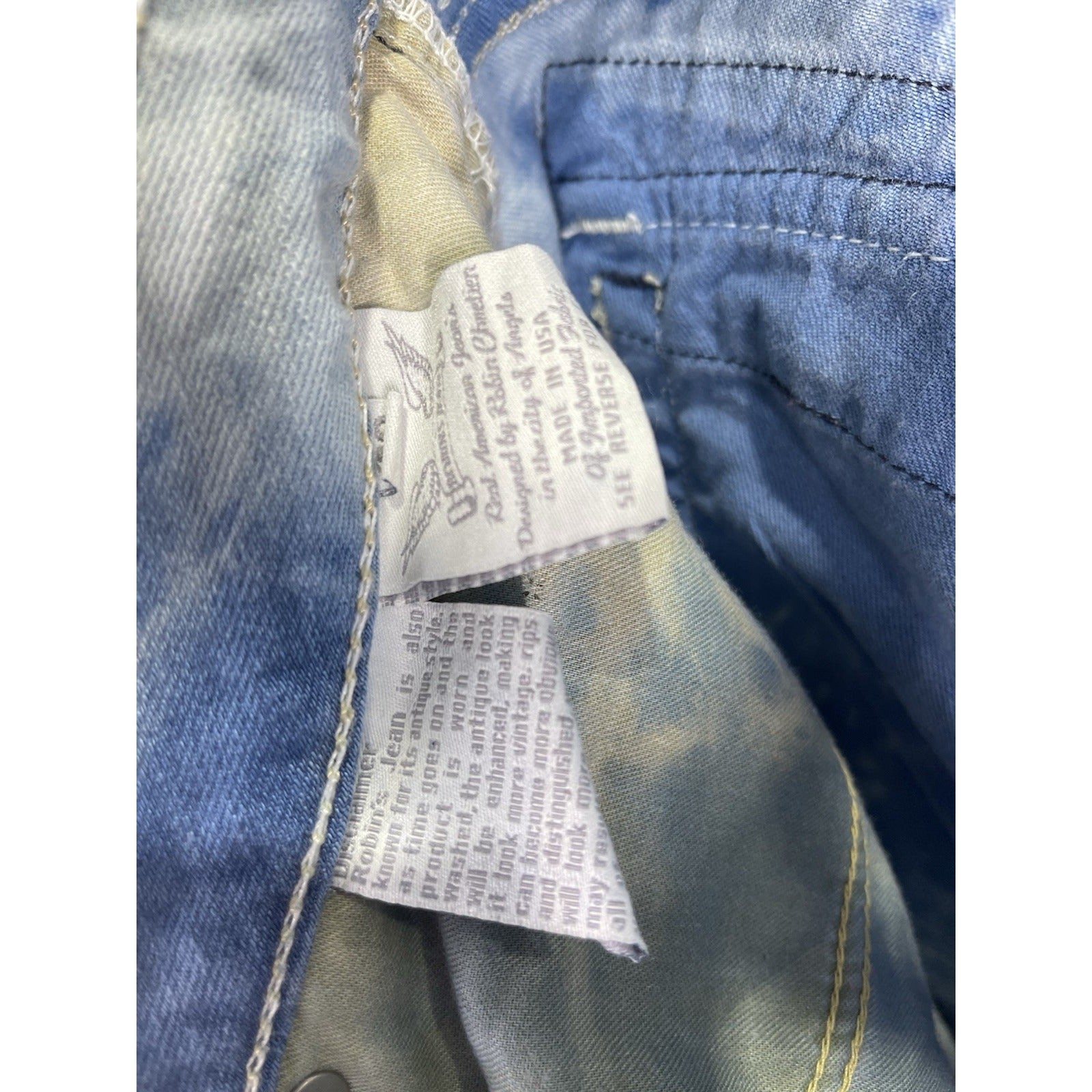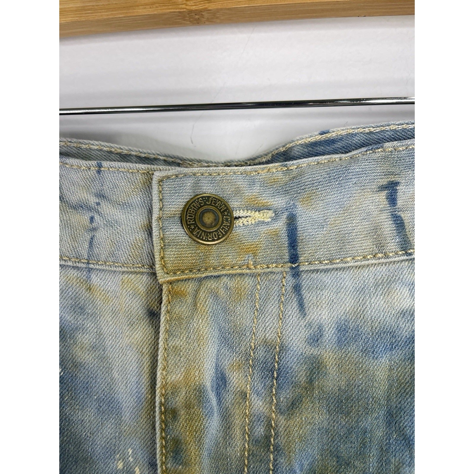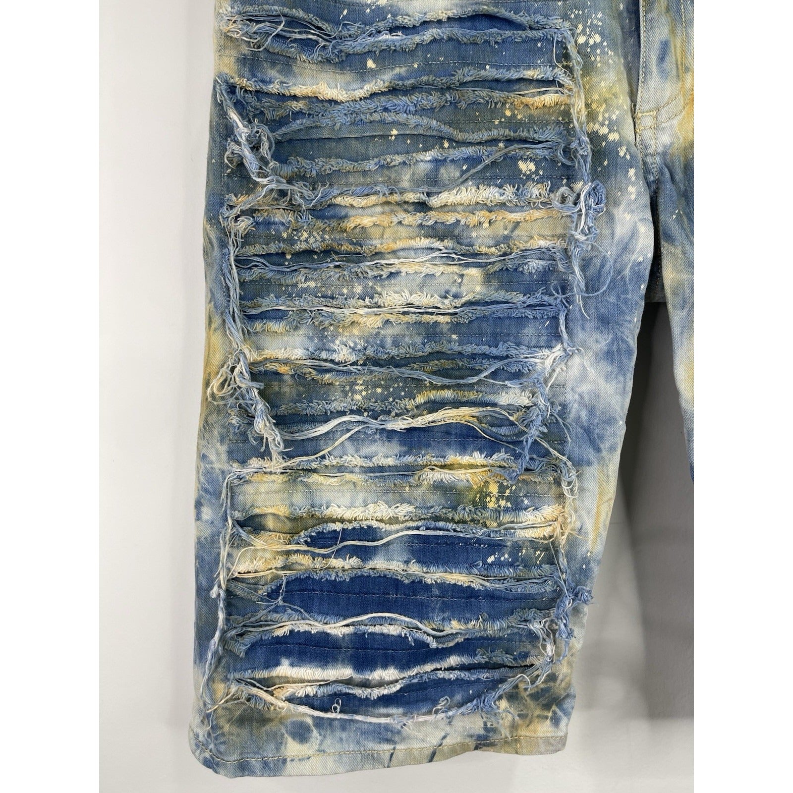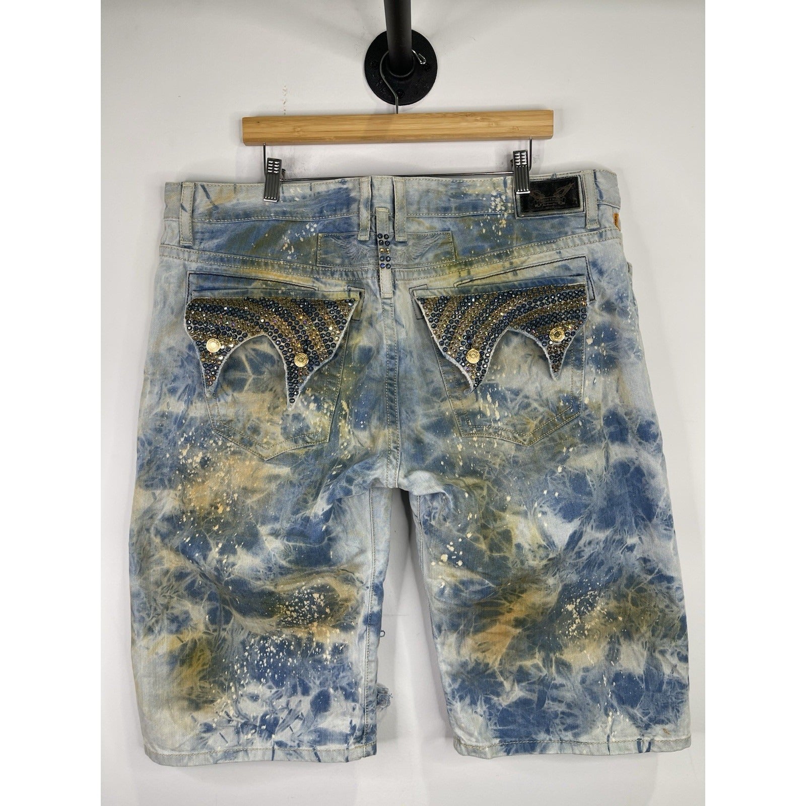 The product is a pair of men's Robin's distressed blue jean denim shorts in size 42. These Bermuda style shorts feature a solid pattern with rhinestone accents, adding a touch of hip hop flair to the vintage design. Made of cotton denim with a waist size of 44 inches, they are perfect for casual occasions and add a unique twist to the classic blue shorts style. Perfect for those looking to make a fashion statement with their clothing.