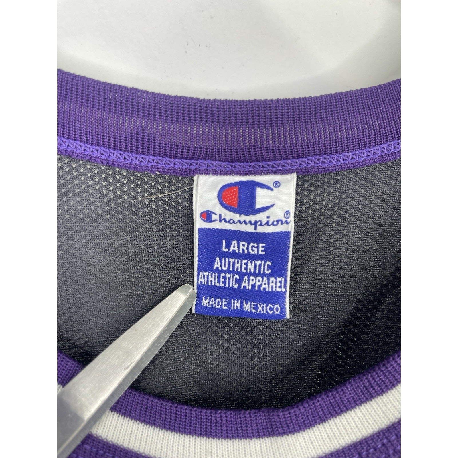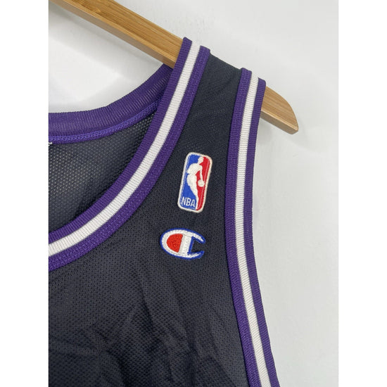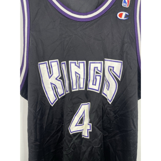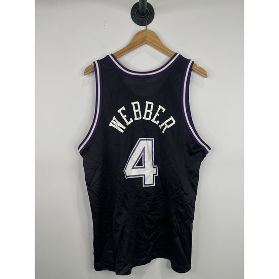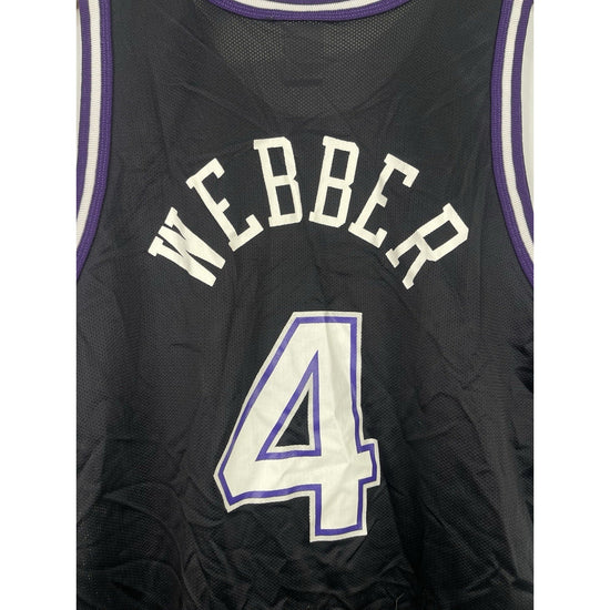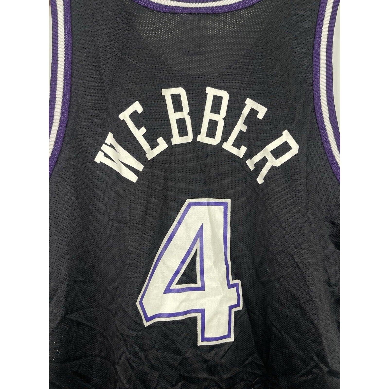 This product is a Champion NBA basketball jersey featuring the player Chris Webber and the team Sacramento Kings. It is officially licensed by the National Basketball Association (NBA) and is in size large, designed for men who are fans of the team. The jersey is in black color and is made in Mexico. Perfect for basketball enthusiasts looking to show their support for the Sacramento Kings and Chris Webber during the regular NBA season.