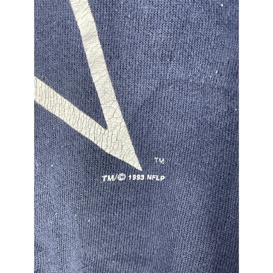 This men's vintage 1993 Dallas Cowboys sweatshirt is a classic piece of fan apparel that celebrates the iconic NFL team. Officially licensed by the National Football League, this crewneck sweater in size M features the team's signature blue color and Delta brand logo. Made in the United States, this sweatshirt is a must-have for any Dallas Cowboys fan looking to show their support for their favorite team during regular season games. Perfect for any football enthusiast looking to add a piece of NFL history to their collection.
