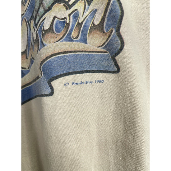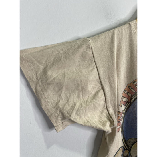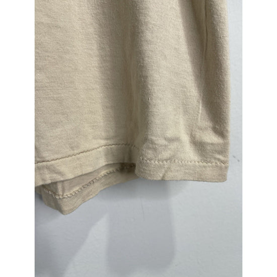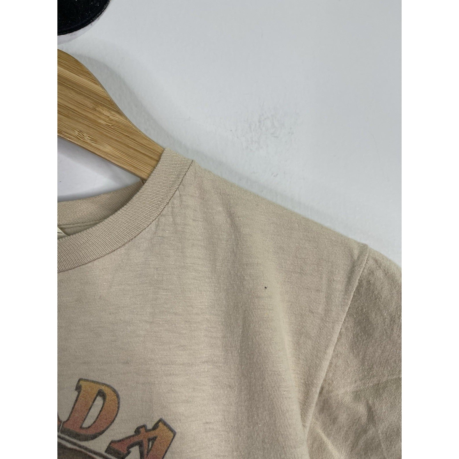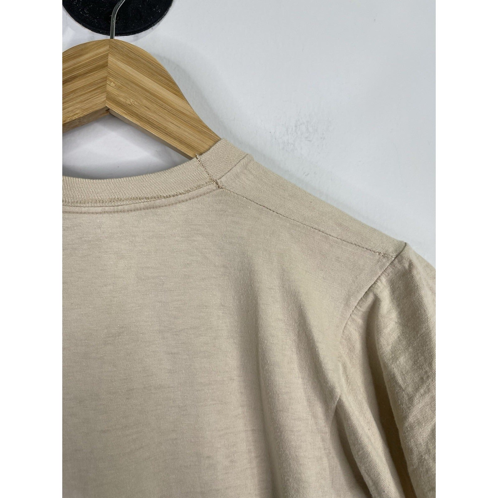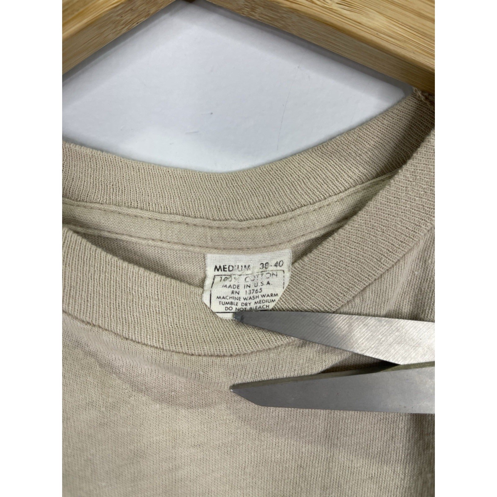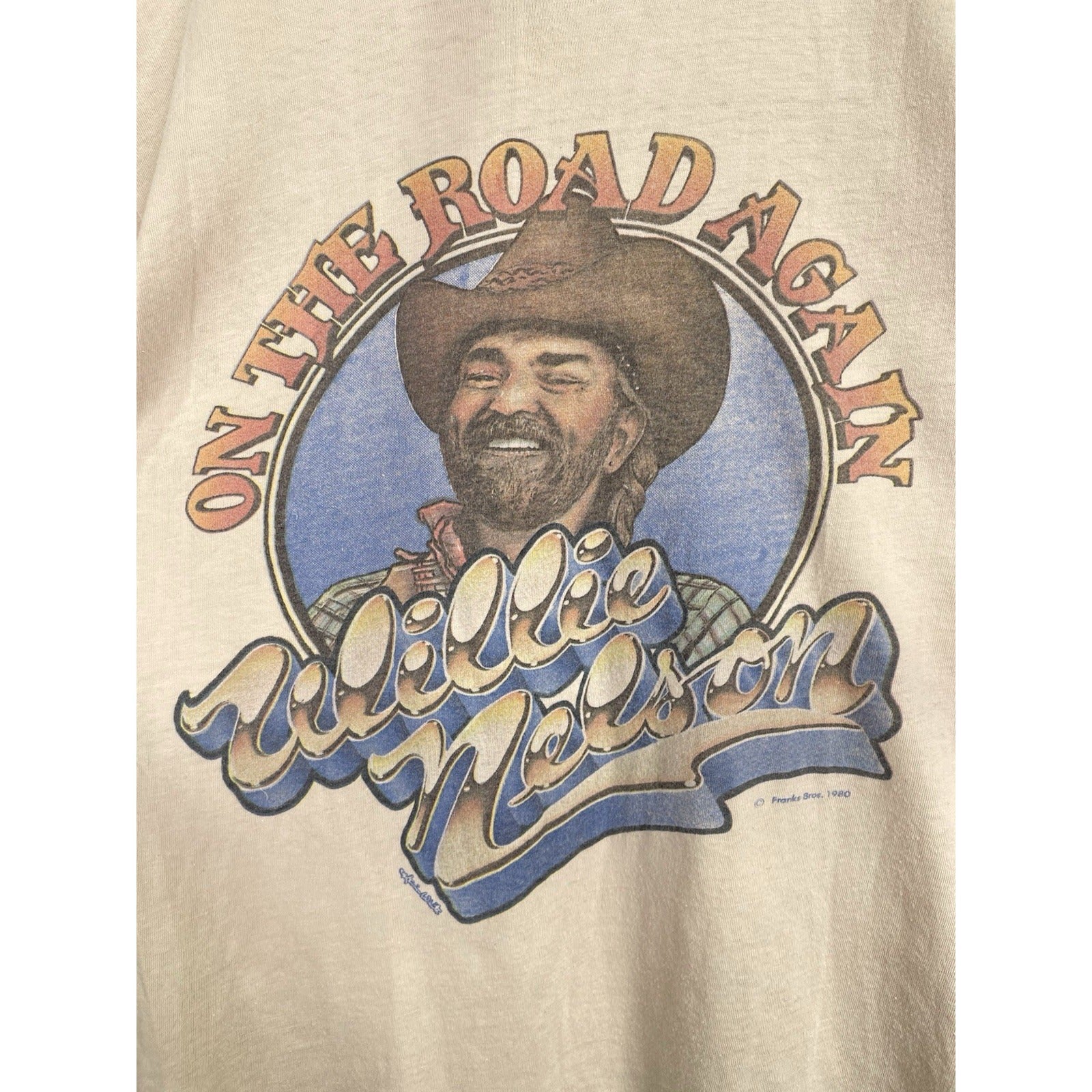 This vintage men's beige T-shirt from the 1980s features a solid pattern with a short sleeve design and a classic crew neckline. Made from cotton, this shirt showcases a Willie Nelson theme, perfect for fans of the legendary musician. The shirt is a medium size, suitable for a regular fit, and bears the brand Frank Bros, adding to its nostalgic charm. Made in the United States, this T-shirt embodies the 80s style with a timeless appeal.