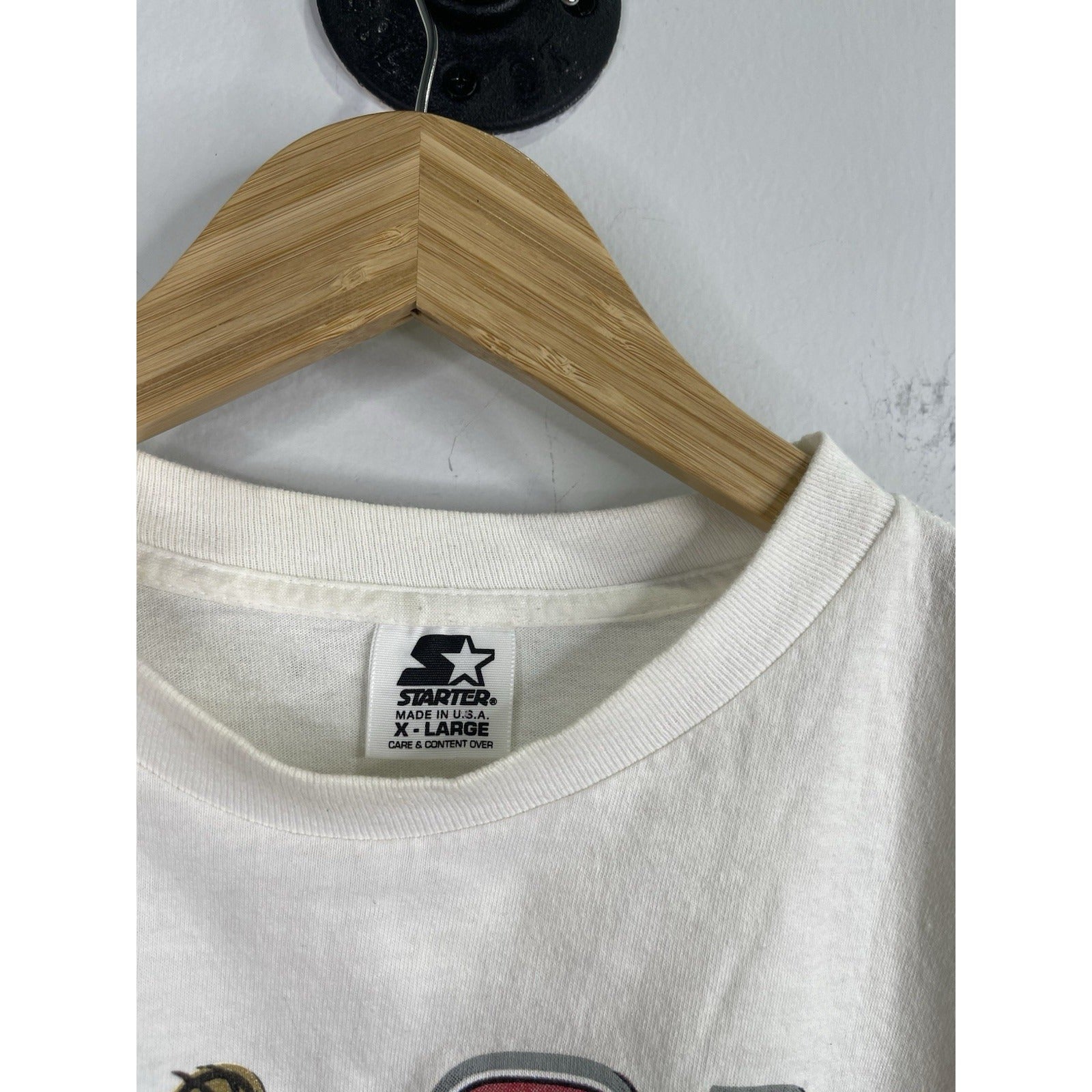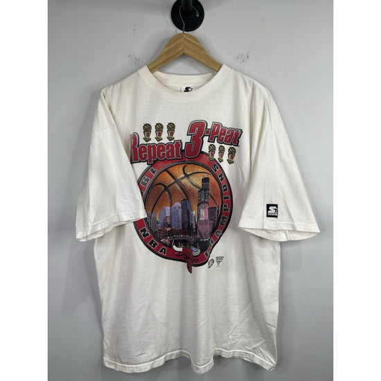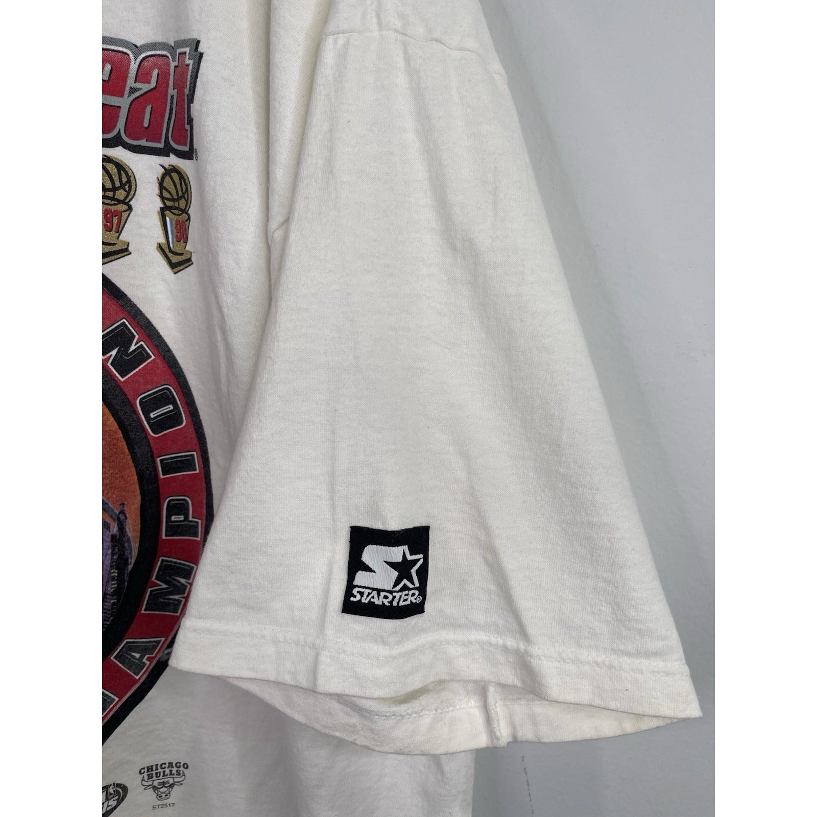 The product is a Men's Vintage Starter Chicago Bulls 1998 Repeat 3Peat NBA Champions T-shirt in size XL. This classic white shirt features a solid pattern with short sleeves and a crew neckline. It is adorned with the iconic Chicago Bulls logo and graphic print, reflecting the team's championship success in the 1990s. With a regular fit and a colorful, 90s sports-themed design, this graphic tee is perfect for casual occasions and a great addition to any sports fan's wardrobe.