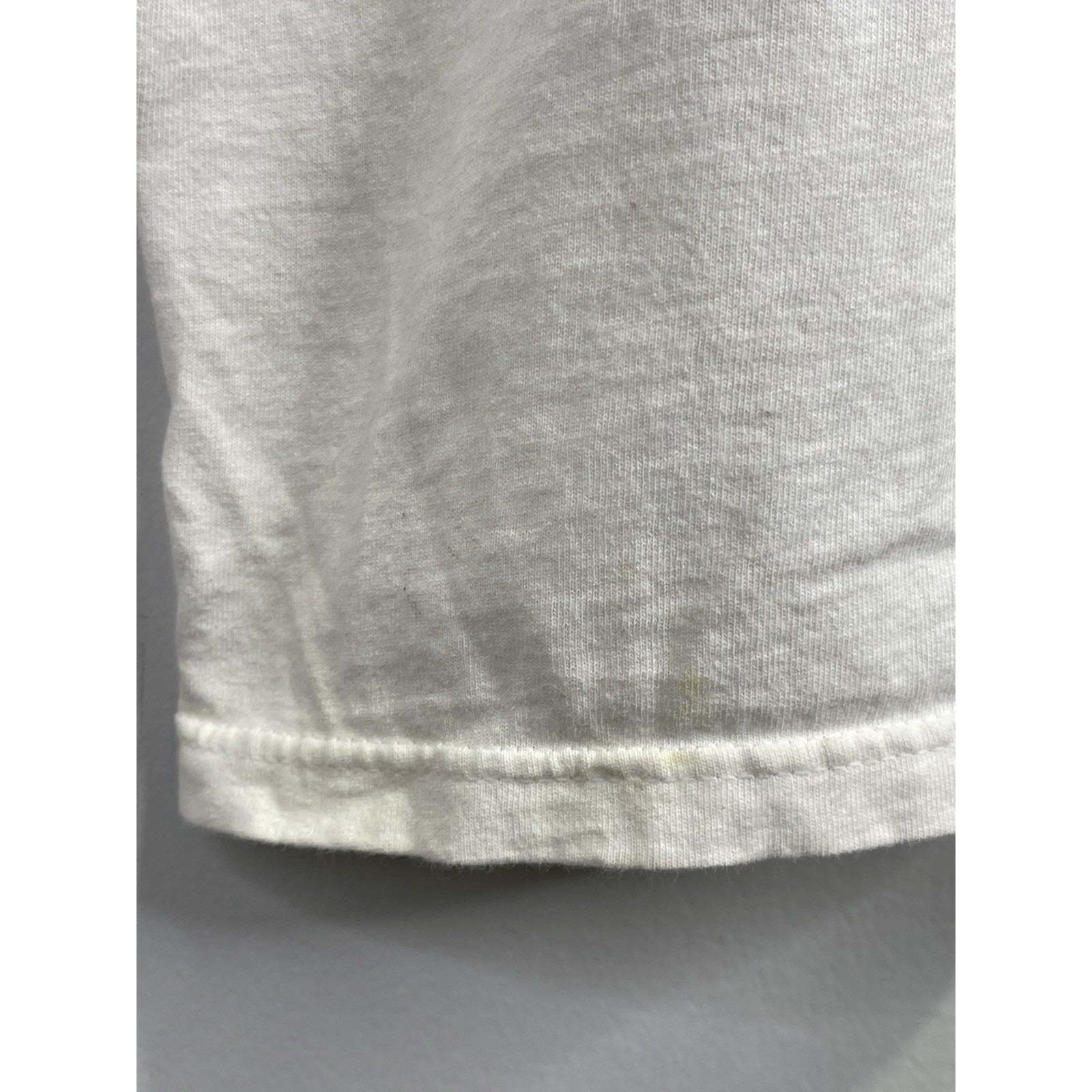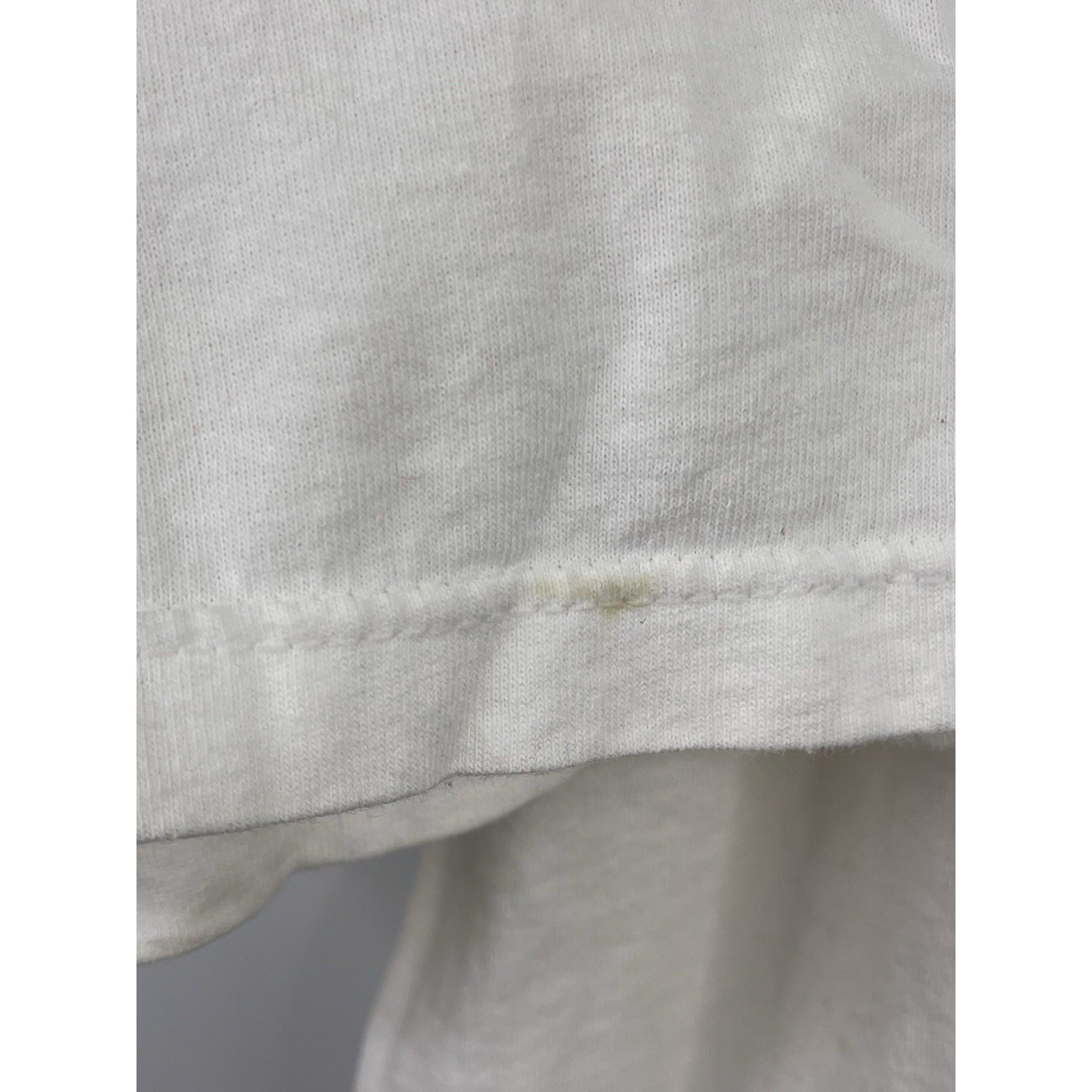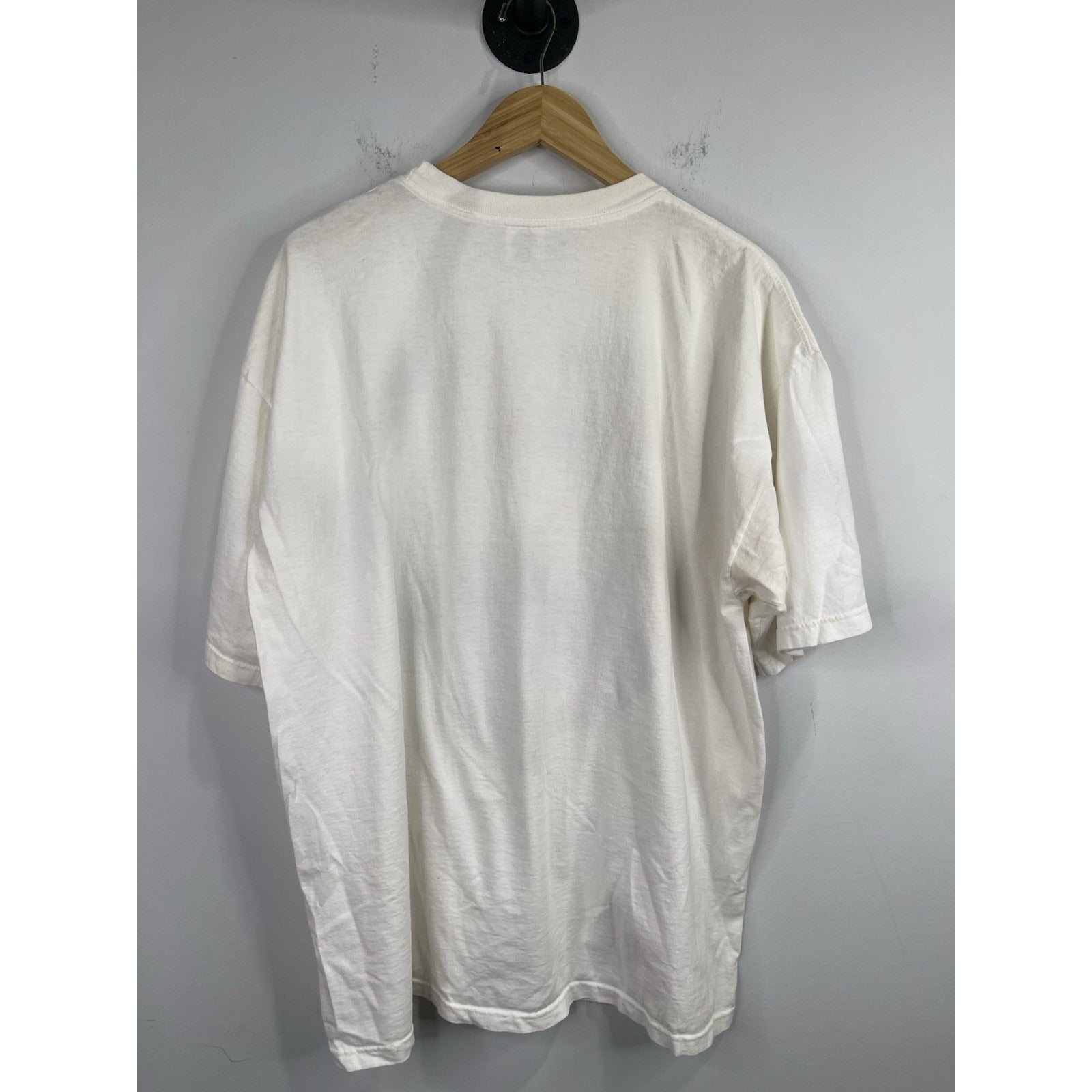 The product is a Men's Vintage Starter Chicago Bulls 1998 Repeat 3Peat NBA Champions T-shirt in size XL. This classic white shirt features a solid pattern with short sleeves and a crew neckline. It is adorned with the iconic Chicago Bulls logo and graphic print, reflecting the team's championship success in the 1990s. With a regular fit and a colorful, 90s sports-themed design, this graphic tee is perfect for casual occasions and a great addition to any sports fan's wardrobe.