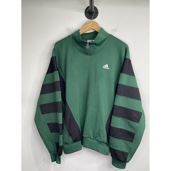 This Men's VTG Adidas Sweatshirt in green with black striped sleeves is a stylish and vintage addition to any casual wardrobe. Made of 87% polyester and 13% cotton, this pullover sweatshirt features a zip closure and accents with the Adidas logo. With a size XL and long sleeves, this sweatshirt is perfect for sports-themed activities and everyday wear. Featuring a neck zip and zip pockets, this sweatshirt from the Adidas product line is a versatile piece that combines comfort and style.