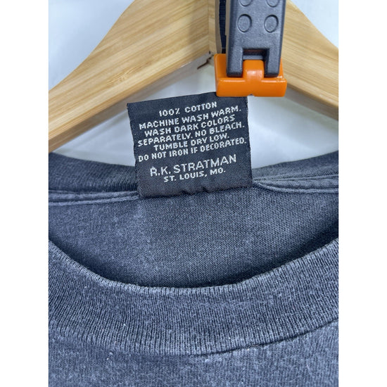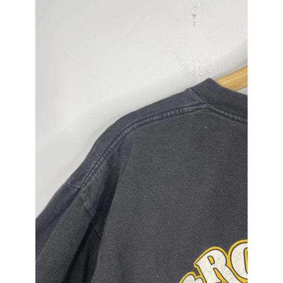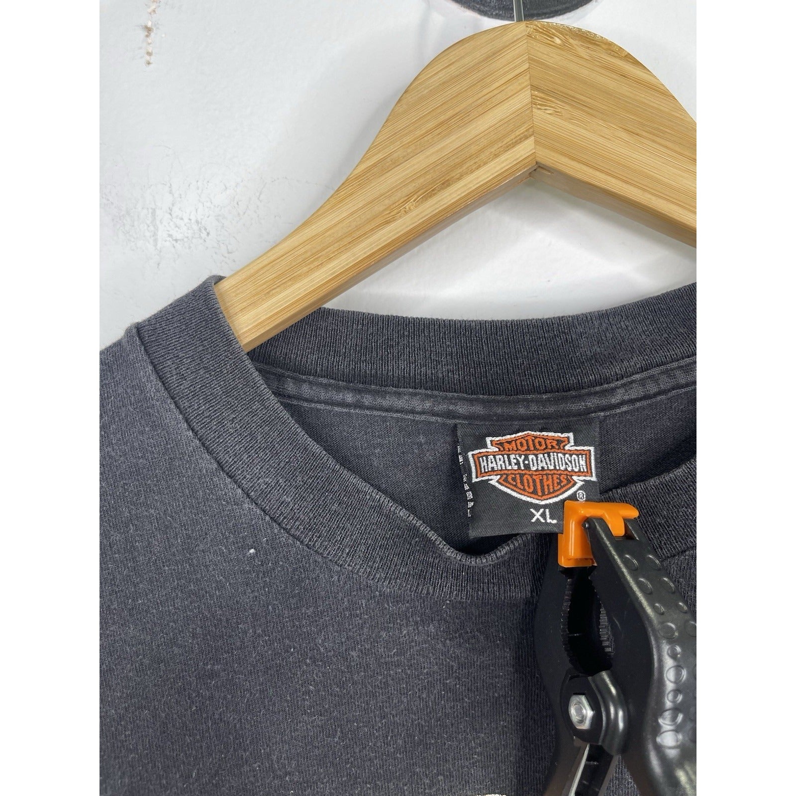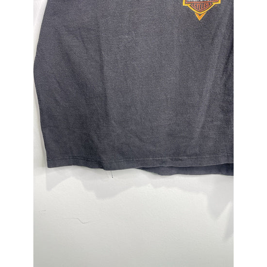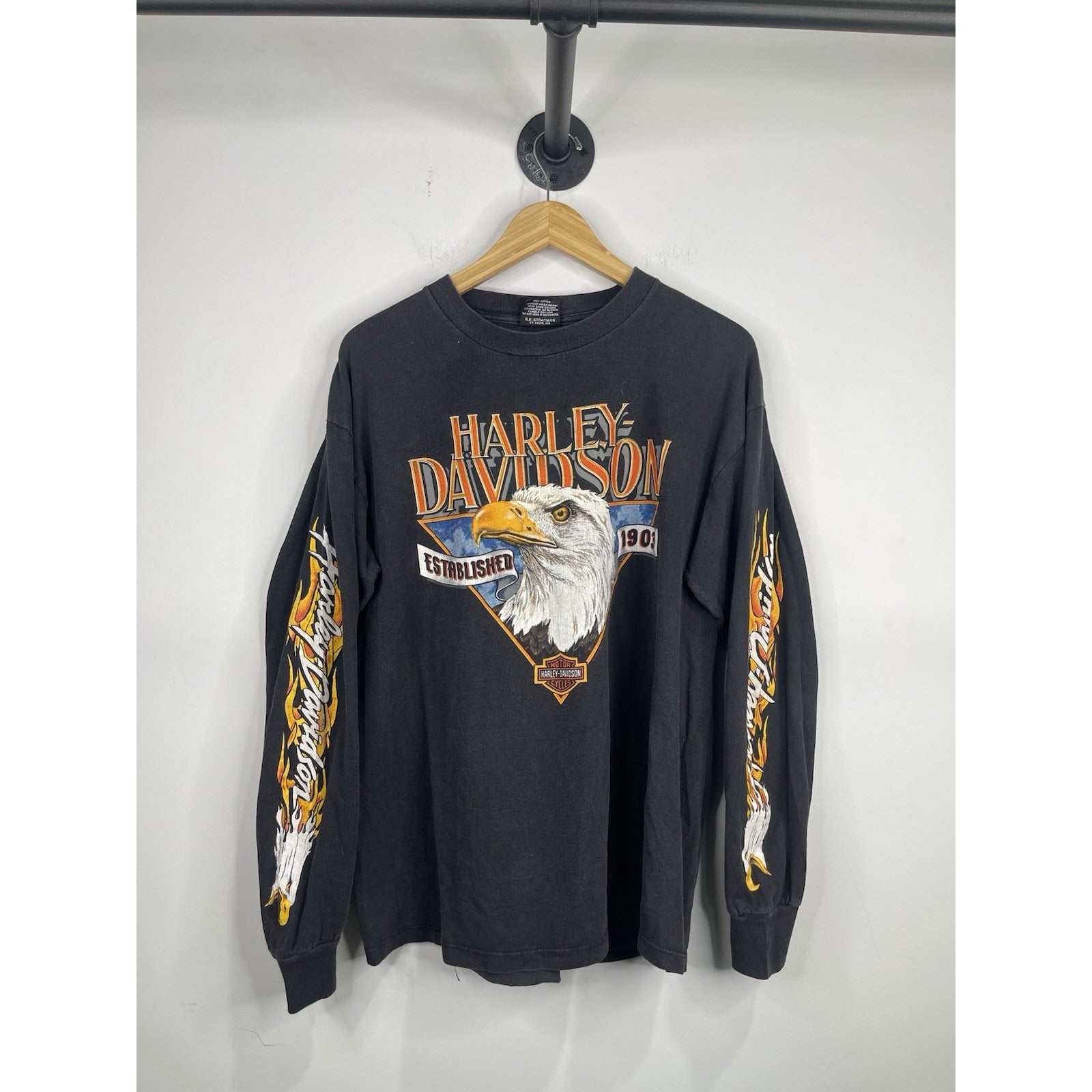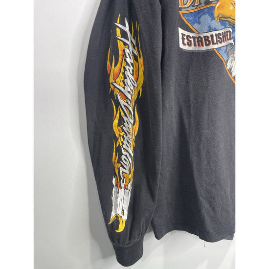 The product is a vintage Harley Davidson T-shirt in size XL, featuring a graphic print with flaming sleeves, making it a unique and eye-catching piece of clothing. Made of cotton, this black shirt has a crew neck and long sleeves, perfect for all seasons. The design reflects a biker, motorcycle, and USA theme, fitting well for those who appreciate vintage style and iconic brands like Harley-Davidson.