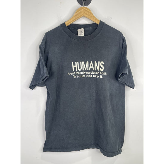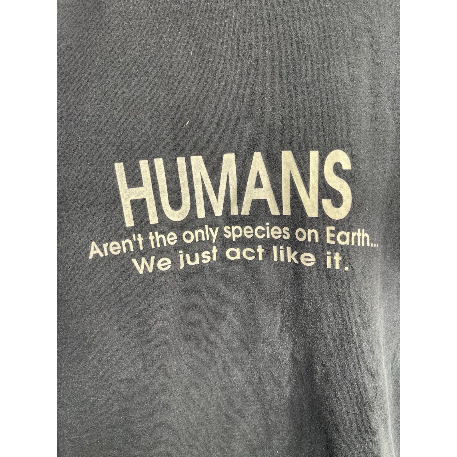 This vintage men's tee features a humorous quote, "Humans Aren't The Only Species On Earth We Just Act Like It," in a solid black color with a regular fit. Made from breathable cotton material, this short sleeve shirt with a crew neckline is perfect for all seasons and easy to care for. The Fruit of the Loom brand adds quality to this funny-themed t-shirt, designed for comfort and style.