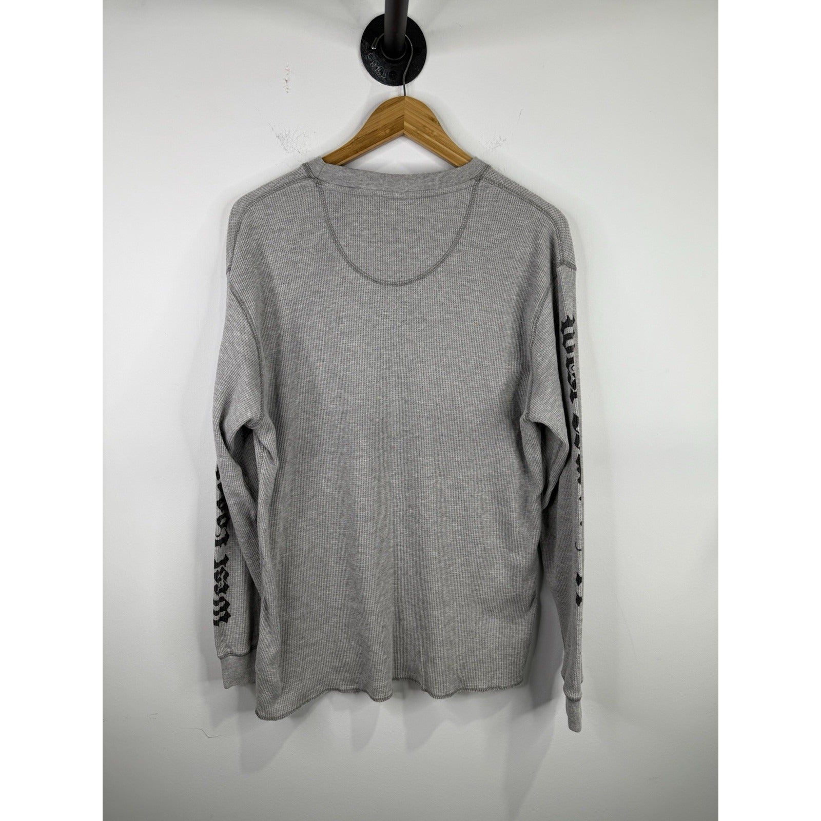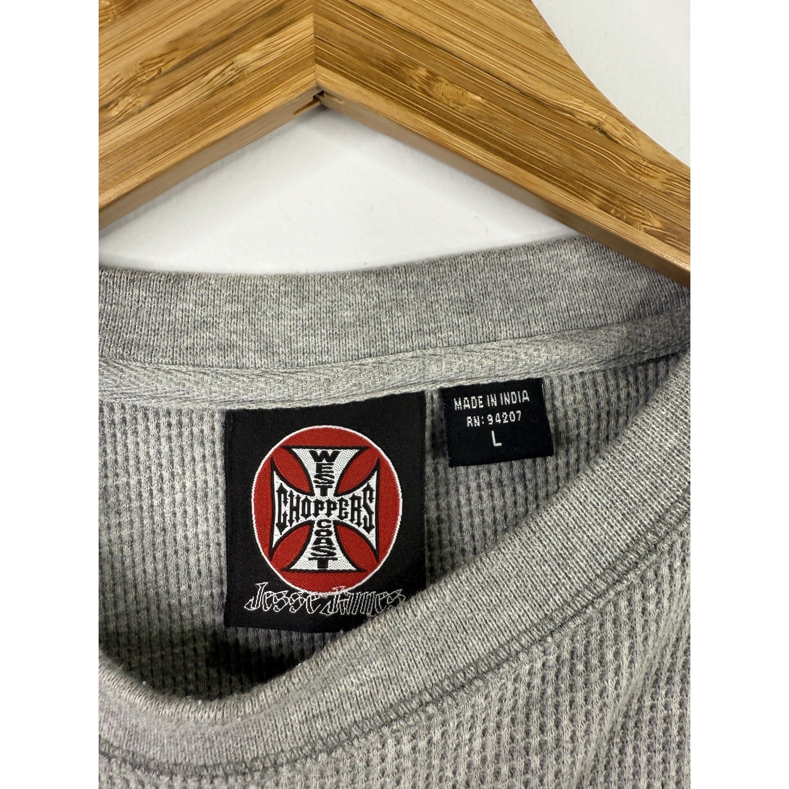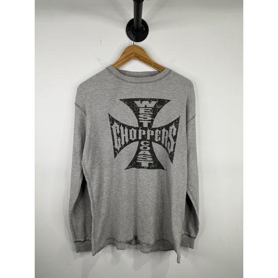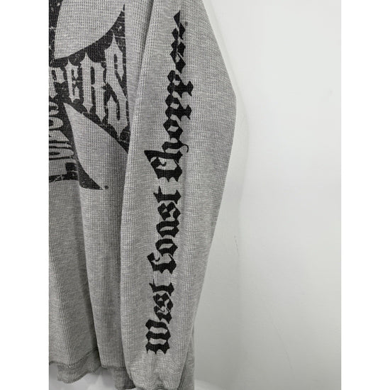 The Mens West Coast Choppers Thermal Long Sleeve T-shirt in size L is a stylish and comfortable piece of clothing featuring a graphic print design with a biker, motorcycle, and skull theme. The shirt is made with thermal material, making it perfect for cooler weather. The gray color adds a versatile touch to this long sleeve t-shirt, making it a great addition to any casual wardrobe.