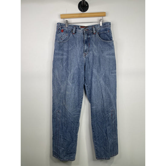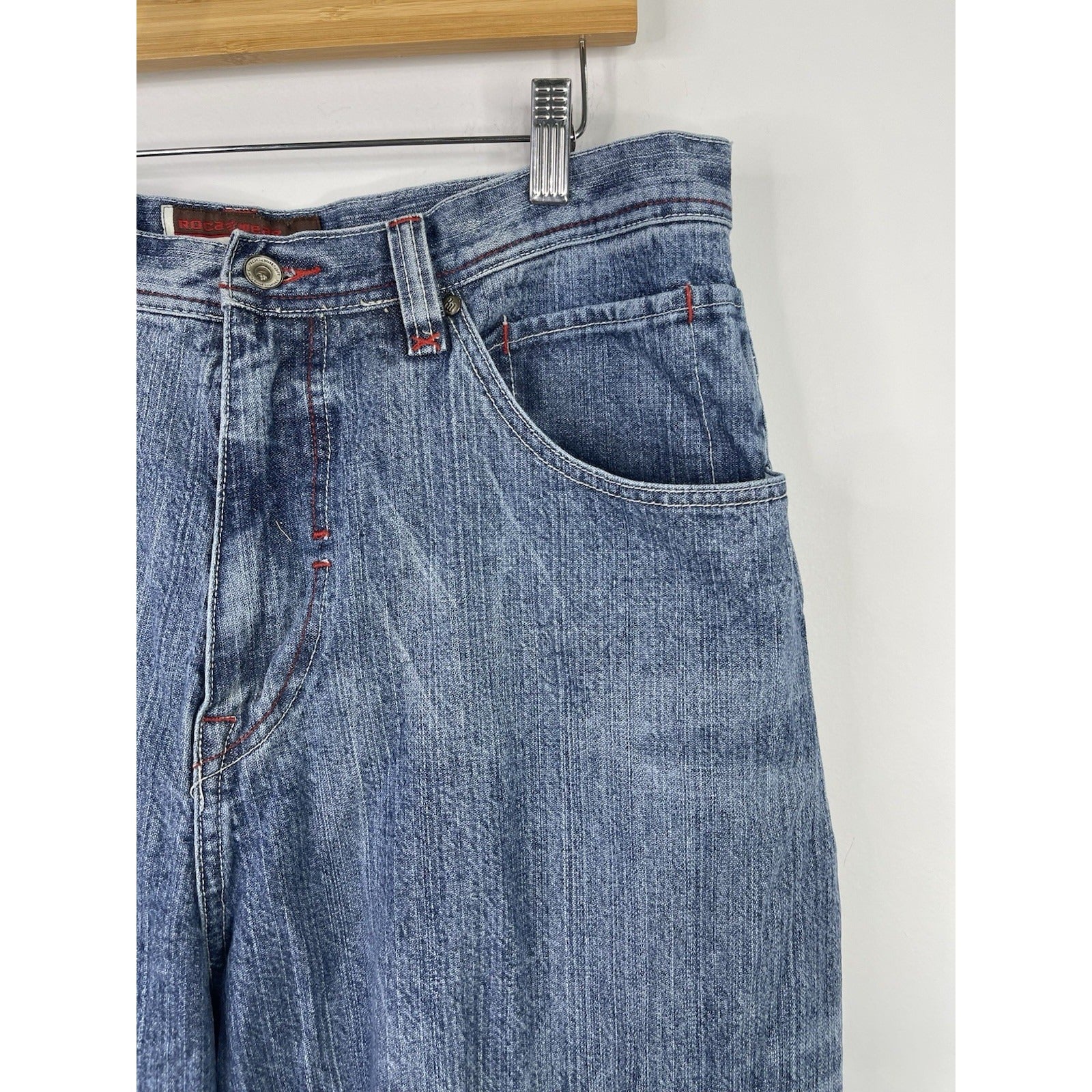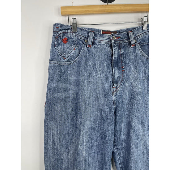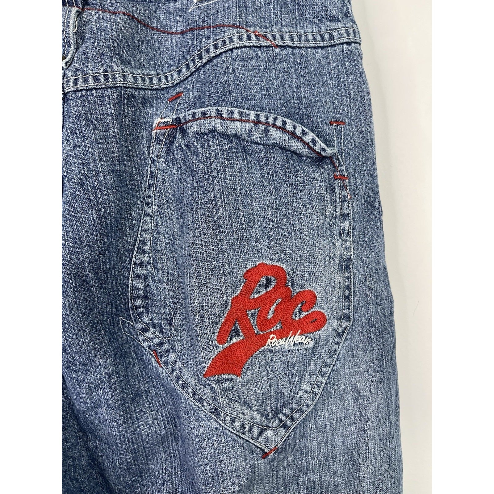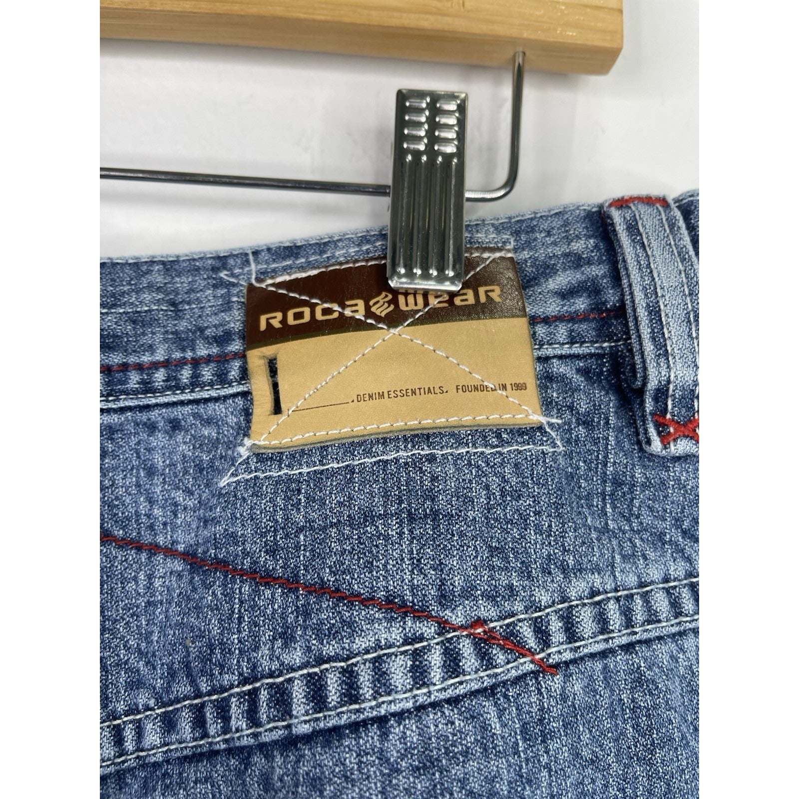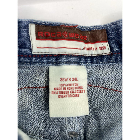 The product is a pair of vintage Y2k Roca Wear denim jeans in size 36x34. These wide-leg jeans feature a regular fit and are made of classic denim fabric. The blue color and 90s, hip hop theme add to the retro appeal of the garment, making it a stylish choice for men who appreciate both fashion and nostalgia. With the brand's association with hip hop culture, these jeans are sure to make a statement for those looking to showcase their unique style.
