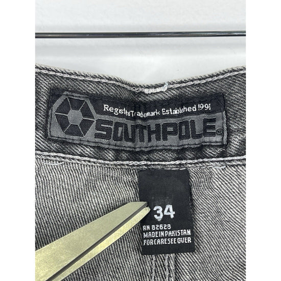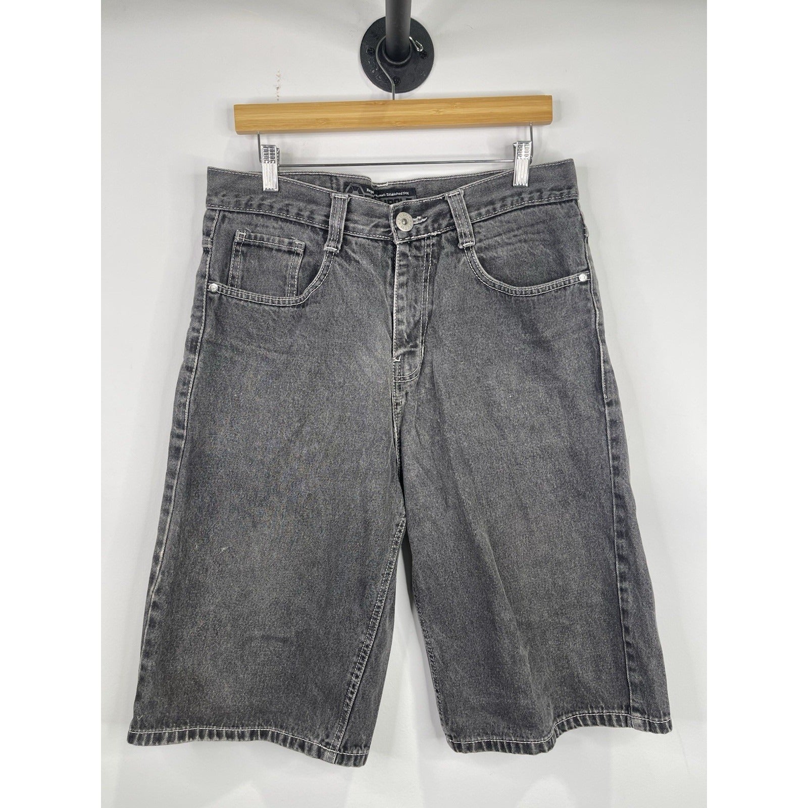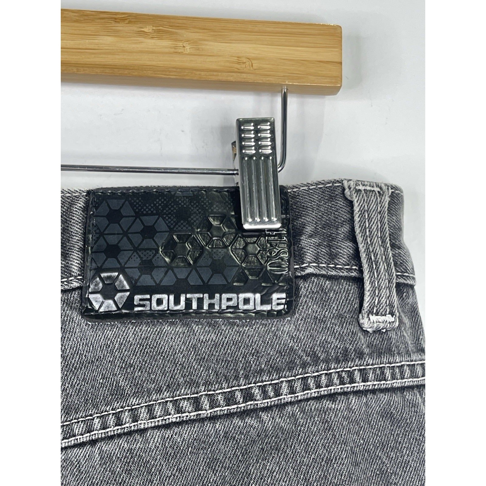 This product is a pair of vintage Y2k South Pole black denim baggy jean shorts in size 34. Made of cotton with a dark wash, the shorts feature a flat front and regular fit. With an inseam of 14.5 inches, they are perfect for travel or casual occasions, embodying a 90s hip hop theme. The shorts also have pockets for added functionality.