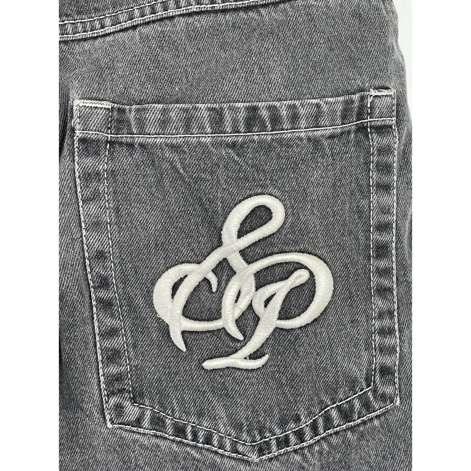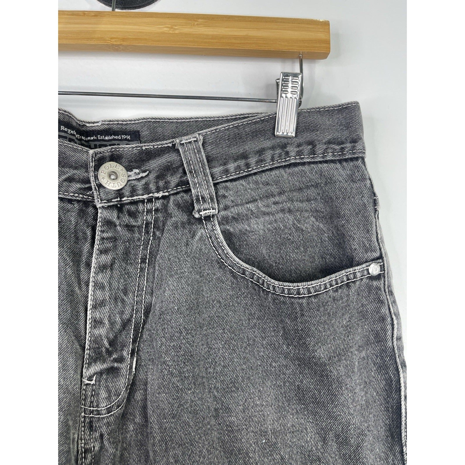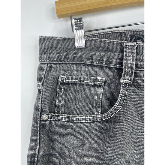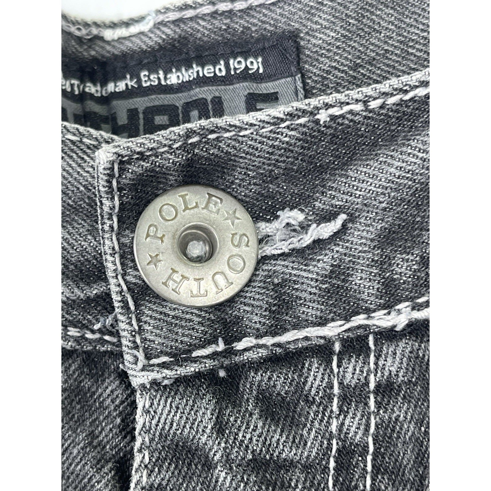 This product is a pair of vintage Y2k South Pole black denim baggy jean shorts in size 34. Made of cotton with a dark wash, the shorts feature a flat front and regular fit. With an inseam of 14.5 inches, they are perfect for travel or casual occasions, embodying a 90s hip hop theme. The shorts also have pockets for added functionality.